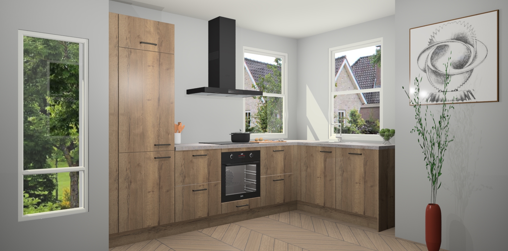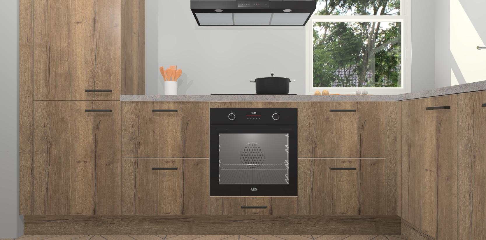 Wat maakt deze keuken zo bijzonder? Ten eerste geeft het houten werkblad uw ruimte een onmiskenbaar klassieke uitstraling. De natuurlijke afwerking roept warmte en elegantie op die nooit uit de mode zullen raken. Bovendien is het gemakkelijk schoon te houden en te onderhouden, zodat je er jarenlang plezier van kunt hebben. Als u op zoek bent naar extra gemak in uw keuken, dan heeft u bij het plaatsen van een bestelling bij ons ook de optie om uw toestellen te upgraden naar AEG-modellen - zo haalt u moderne innovatie van topmerken in apparatentechnologie rechtstreeks in huis.
