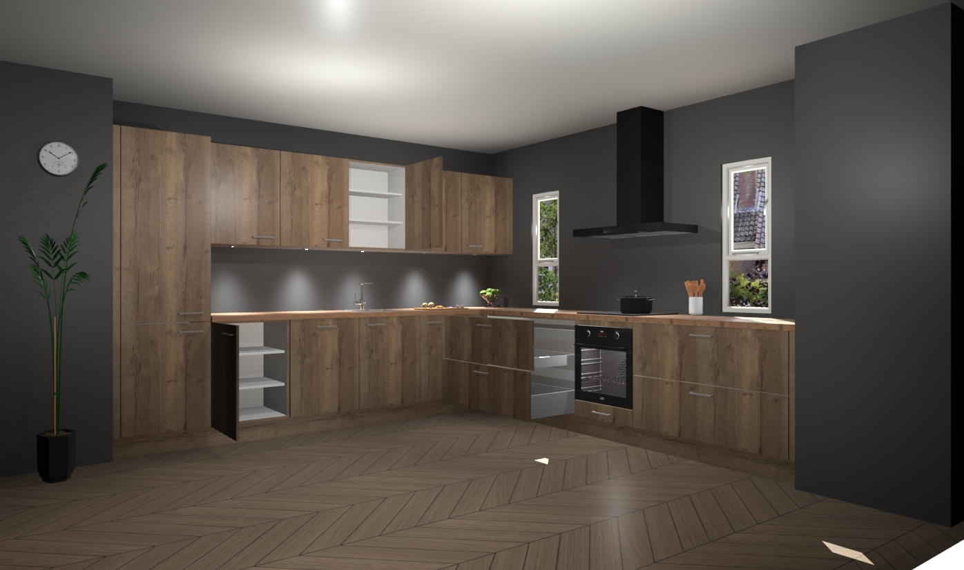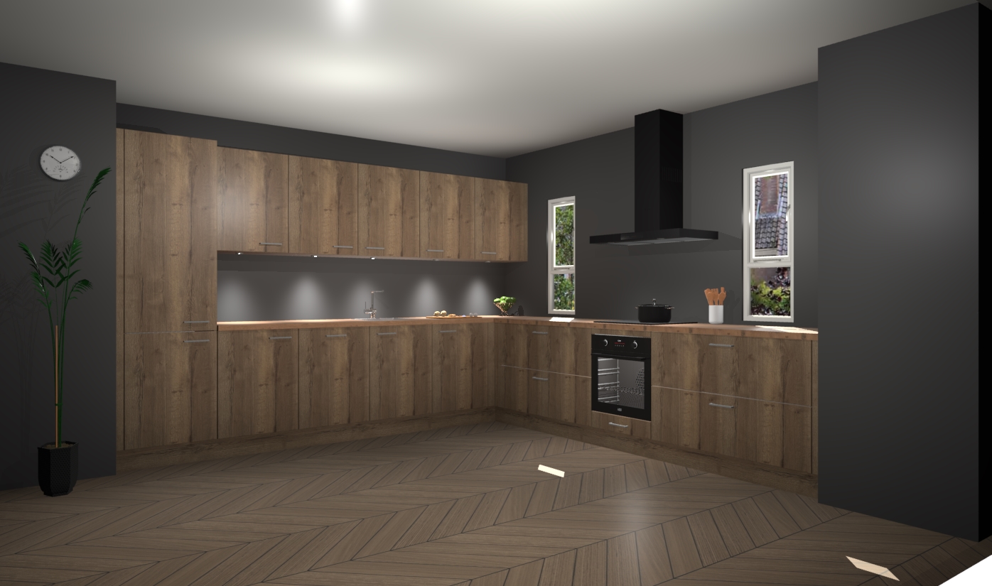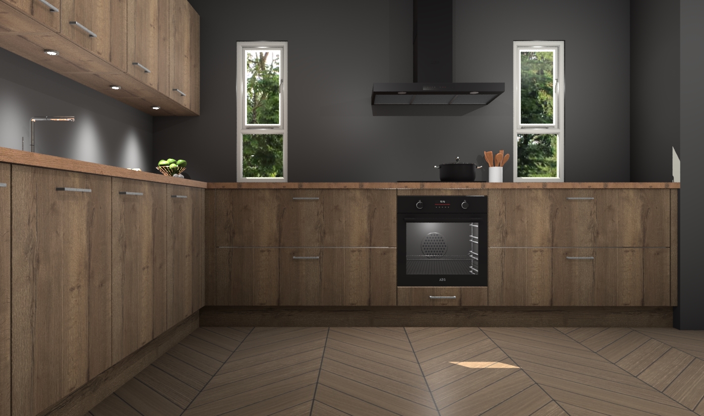 De chocolade eiken keuken is een ideale hoekkeuken en heeft alle functies en apparatuur die u maar nodig kunt hebben. Bij de bestelling krijgt u een oven, inductiekookplaat, afzuigkap, vaatwasser en koelkast - deze kunnen desgewenst eenvoudig worden uitgebreid naar AEG na bestellen. Elke kast wordt ook voor gemonteerd geleverd met soft close deuren die jarenlang gebruik beloven. Stelt u zich voor dat u geen gedoe heeft met vervelende montage - vanaf het moment dat u uw bestelling plaats, duurt het slechts 7 weken voor het bij u thuis geleverd wordt.