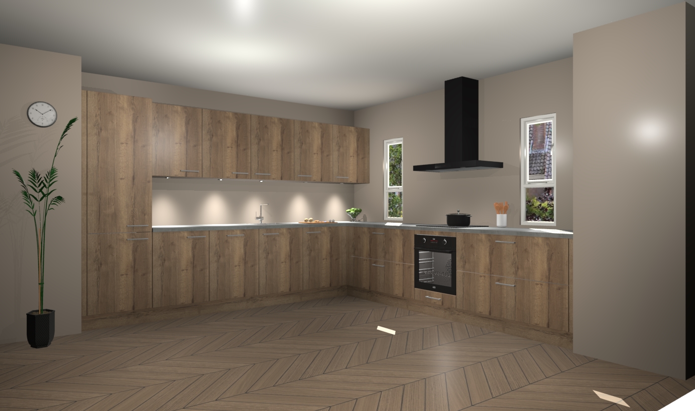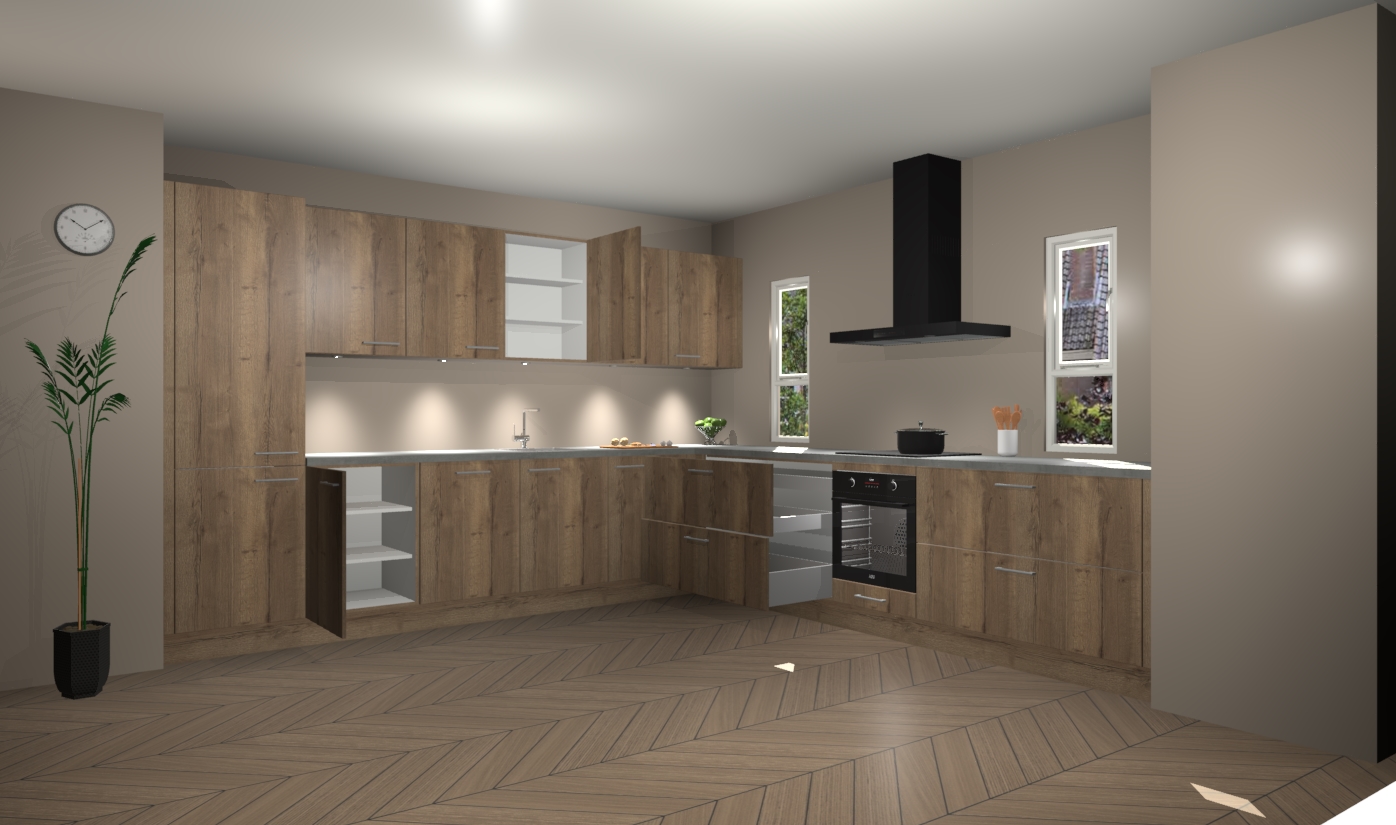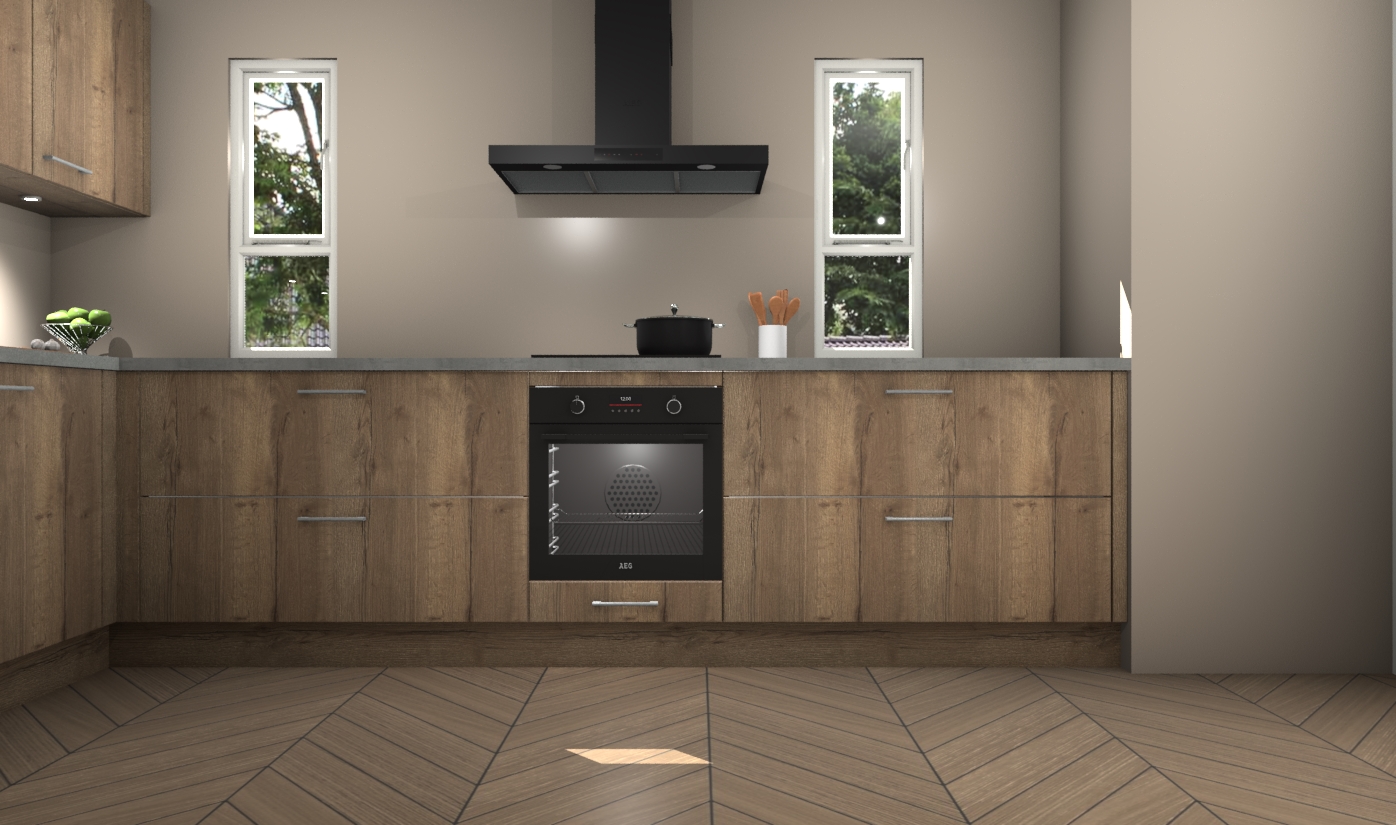 De chocolade eiken keuken is een ideale hoekkeuken en heeft alle functies en apparatuur die u maar nodig kunt hebben. Bij de bestelling krijgt u een oven, inductiekookplaat, afzuigkap, vaatwasser en koelkast - deze kunnen desgewenst eenvoudig worden uitgebreid naar AEG na bestellen. Elke kast wordt ook voor gemonteerd geleverd met soft close deuren die jarenlang gebruik beloven. Stelt u zich voor dat u geen gedoe heeft met vervelende montage - vanaf het moment dat u uw bestelling plaats, duurt het slechts 7 weken voor het bij u thuis geleverd wordt.