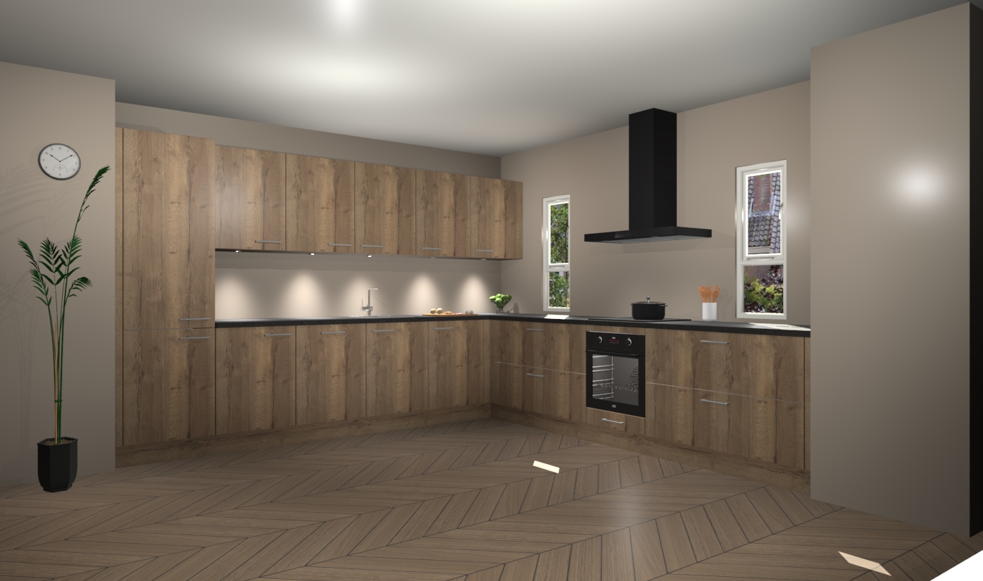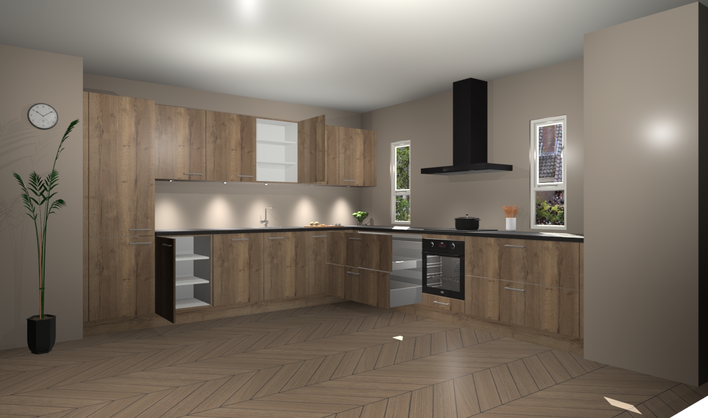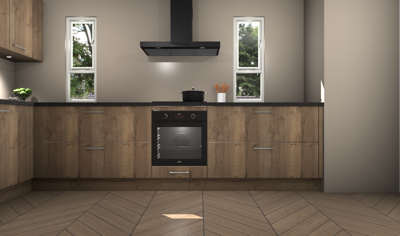 De chocolade eiken keuken is een ideale hoekkeuken en heeft alle functies en apparatuur die u maar nodig kunt hebben. Bij de bestelling krijgt u een oven, inductiekookplaat, afzuigkap, vaatwasser en koelkast - deze kunnen desgewenst eenvoudig worden uitgebreid naar AEG na bestellen. Elke kast wordt ook voor gemonteerd geleverd met soft close deuren die jarenlang gebruik beloven. Stelt u zich voor dat u geen gedoe heeft met vervelende montage - vanaf het moment dat u uw bestelling plaats, duurt het slechts 7 weken voor het bij u thuis geleverd wordt.