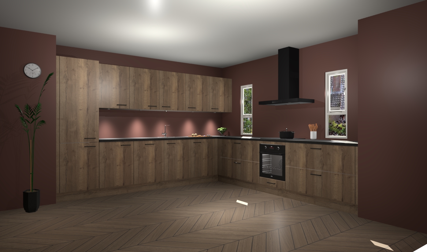 De chocolade eiken keuken is een ideale hoekkeuken en heeft alle functies en apparatuur die u maar nodig kunt hebben. Bij de bestelling krijgt u een oven, inductiekookplaat, afzuigkap, vaatwasser en koelkast - deze kunnen desgewenst eenvoudig worden uitgebreid naar AEG na bestellen. Elke kast wordt ook voor gemonteerd geleverd met soft close deuren die jarenlang gebruik beloven. Stelt u zich voor dat u geen gedoe heeft met vervelende montage - vanaf het moment dat u uw bestelling plaats, duurt het slechts 7 weken voor het bij u thuis geleverd wordt.