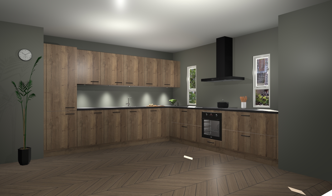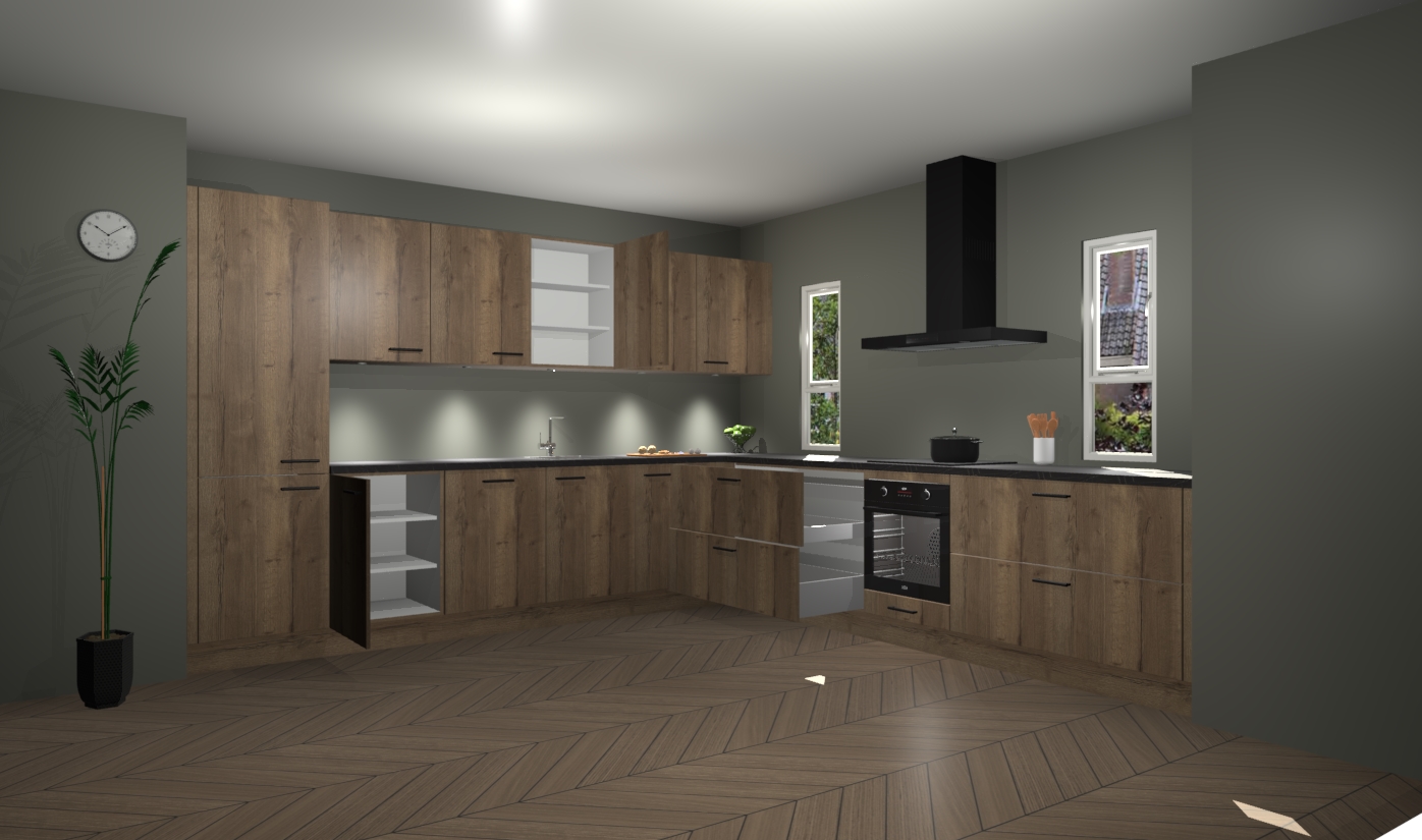 De chocolade eiken keuken is een ideale hoekkeuken en heeft alle functies en apparatuur die u maar nodig kunt hebben. Bij de bestelling krijgt u een oven, inductiekookplaat, afzuigkap, vaatwasser en koelkast - deze kunnen desgewenst eenvoudig worden uitgebreid naar AEG na bestellen. Elke kast wordt ook voor gemonteerd geleverd met soft close deuren die jarenlang gebruik beloven. Stelt u zich voor dat u geen gedoe heeft met vervelende montage - vanaf het moment dat u uw bestelling plaats, duurt het slechts 7 weken voor het bij u thuis geleverd wordt.