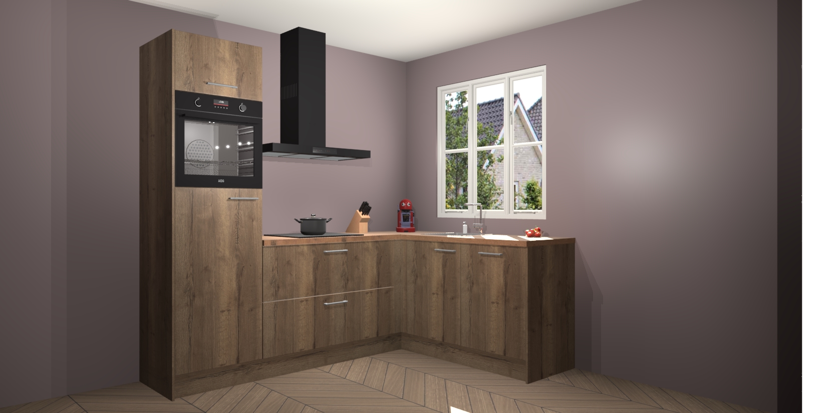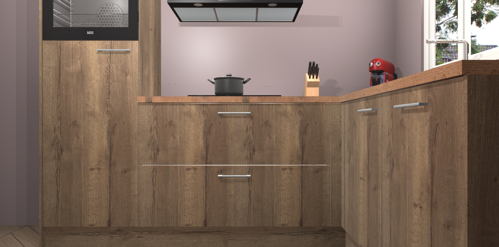 Dit model biedt u voldoende opbergruimte en vijf ingebouwde apparaten: een oven, inductiekookplaat, afzuigkap, vaatwasser en koelkast. Deze apparaten kunnen gemakkelijk worden geüpgrade naar AEG nadat u besteld heeft. De verschillende laden en kastjes bevatten softclose-deuren waardoor ze gezellig dichtvallen met een geruststellend helemaal geruisloos geluid. En dat is nog niet alles! We garanderen ook dat de prijs altijd laag blijft - dus haal nu uw Chocolade Eiken keuken Victoria terwijl het kan.