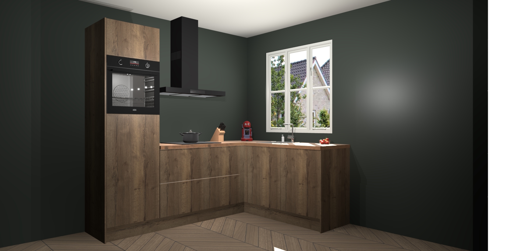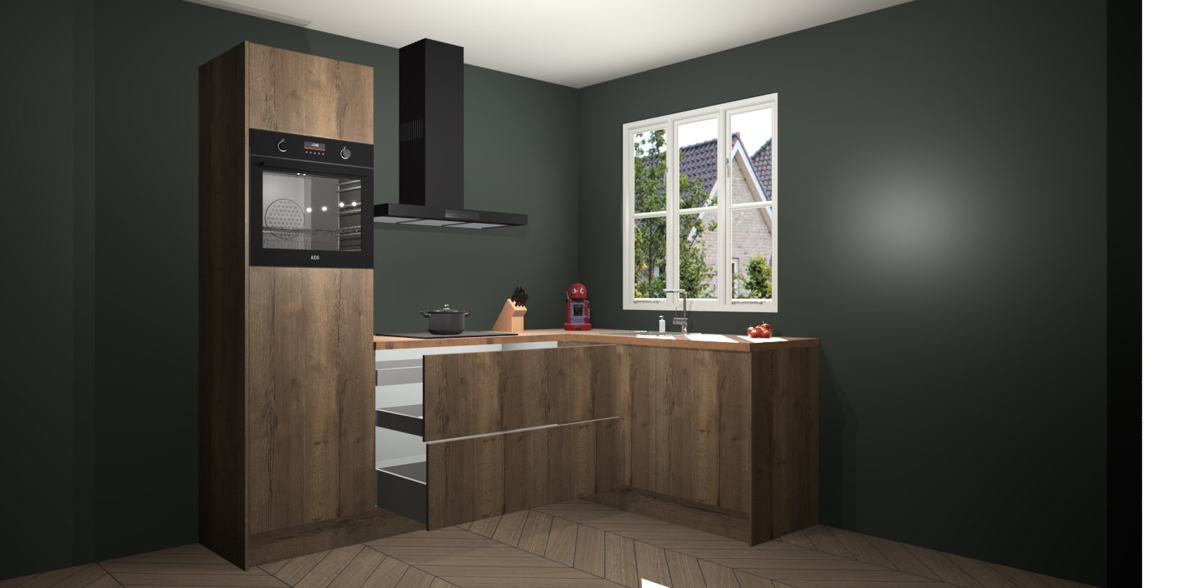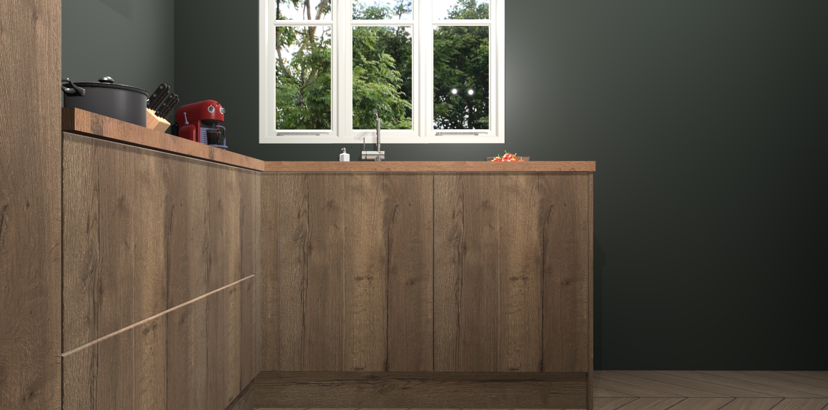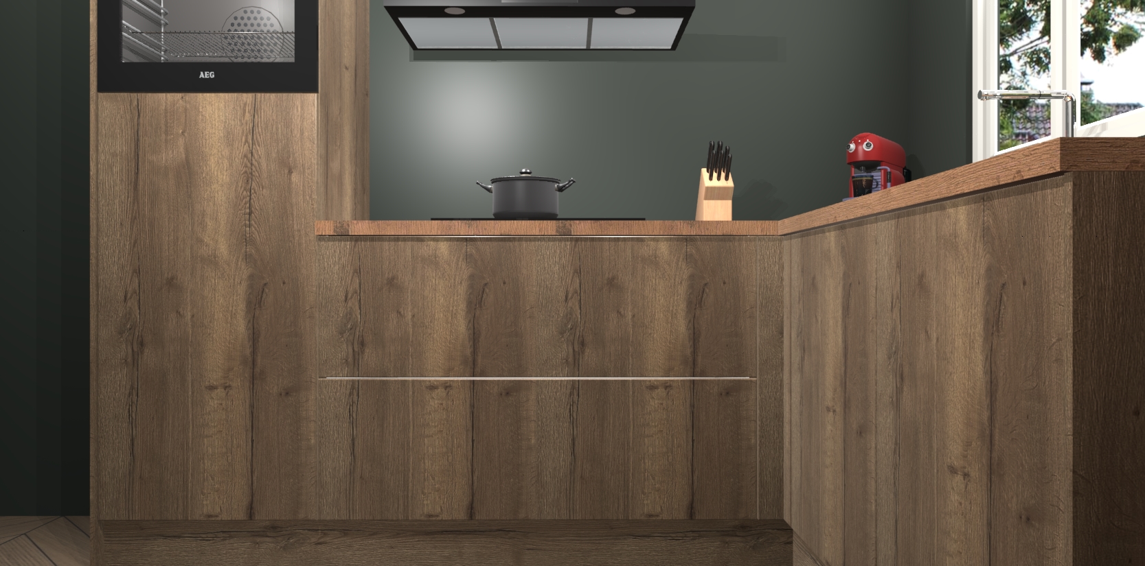 Dit model biedt u voldoende opbergruimte en vijf ingebouwde apparaten: een oven, inductiekookplaat, afzuigkap, vaatwasser en koelkast. Deze apparaten kunnen gemakkelijk worden geüpgrade naar AEG nadat u besteld heeft. De verschillende laden en kastjes bevatten softclose-deuren waardoor ze gezellig dichtvallen met een geruststellend helemaal geruisloos geluid. En dat is nog niet alles! We garanderen ook dat de prijs altijd laag blijft - dus haal nu uw Chocolade Eiken keuken Victoria terwijl het kan.