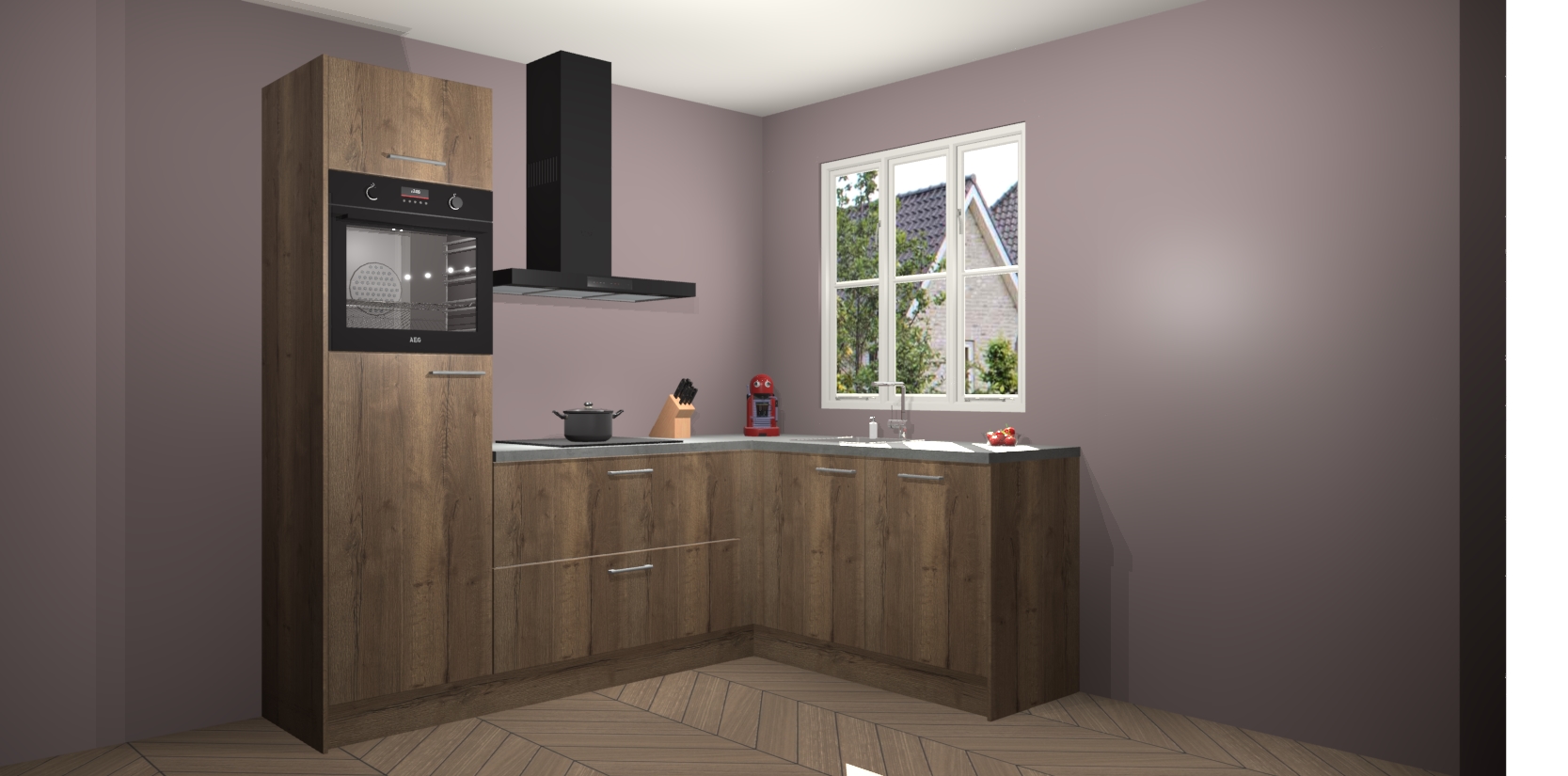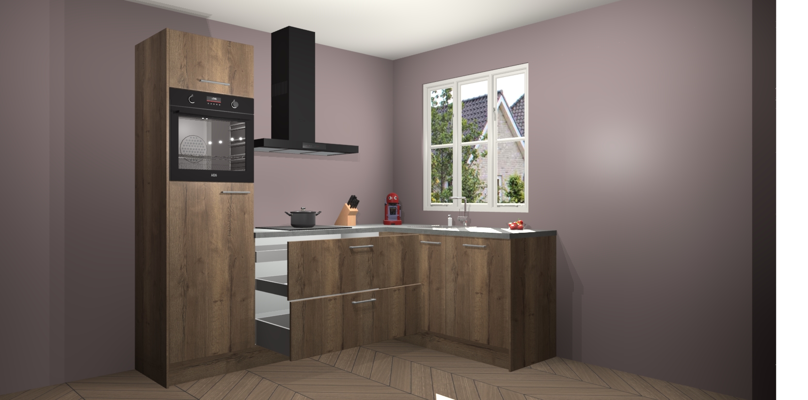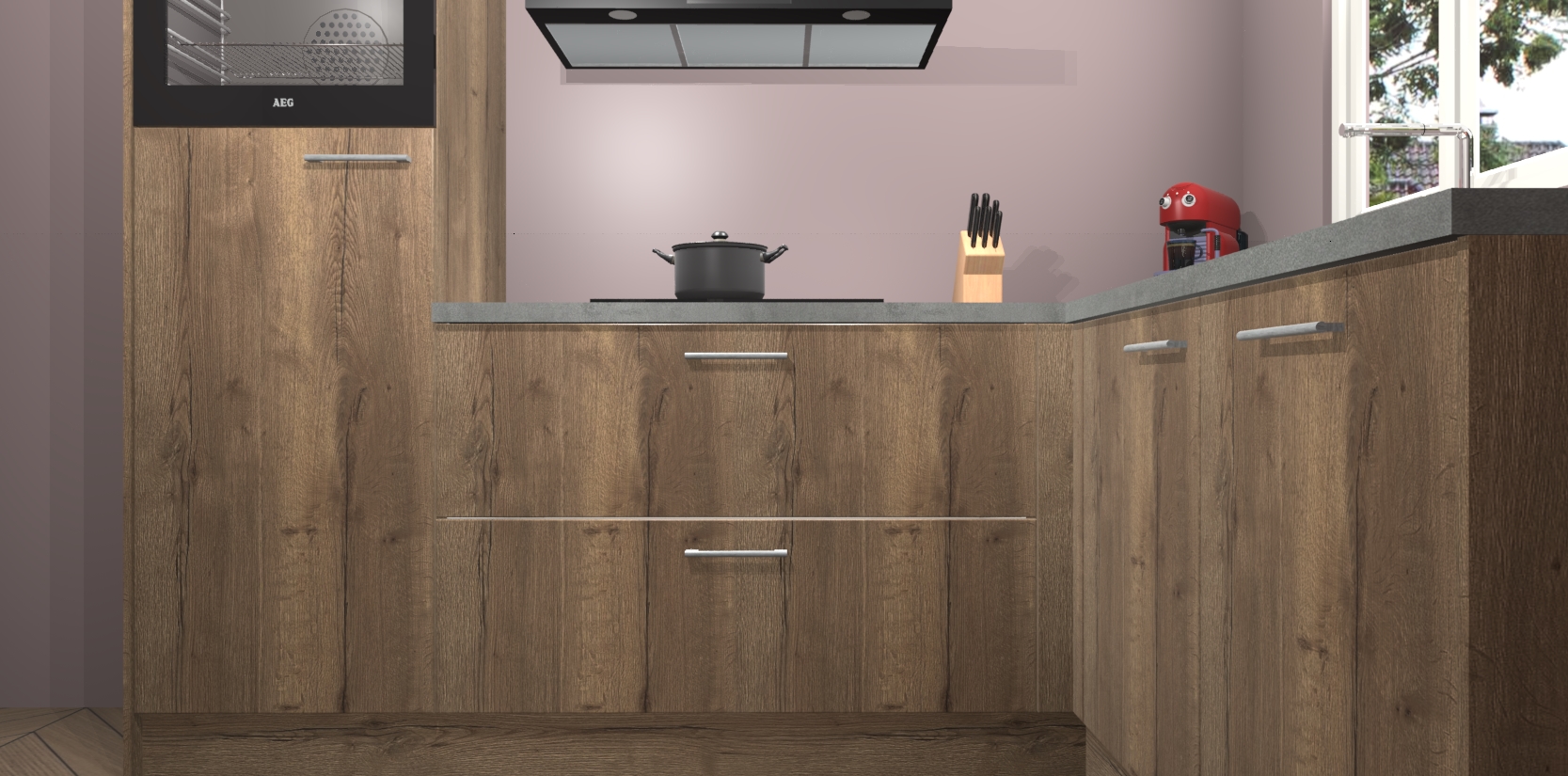 Dit model biedt u voldoende opbergruimte en vijf ingebouwde apparaten: een oven, inductiekookplaat, afzuigkap, vaatwasser en koelkast. Deze apparaten kunnen gemakkelijk worden geüpgrade naar AEG nadat u besteld heeft. De verschillende laden en kastjes bevatten softclose-deuren waardoor ze gezellig dichtvallen met een geruststellend helemaal geruisloos geluid. En dat is nog niet alles! We garanderen ook dat de prijs altijd laag blijft - dus haal nu uw Chocolade Eiken keuken Victoria terwijl het kan.