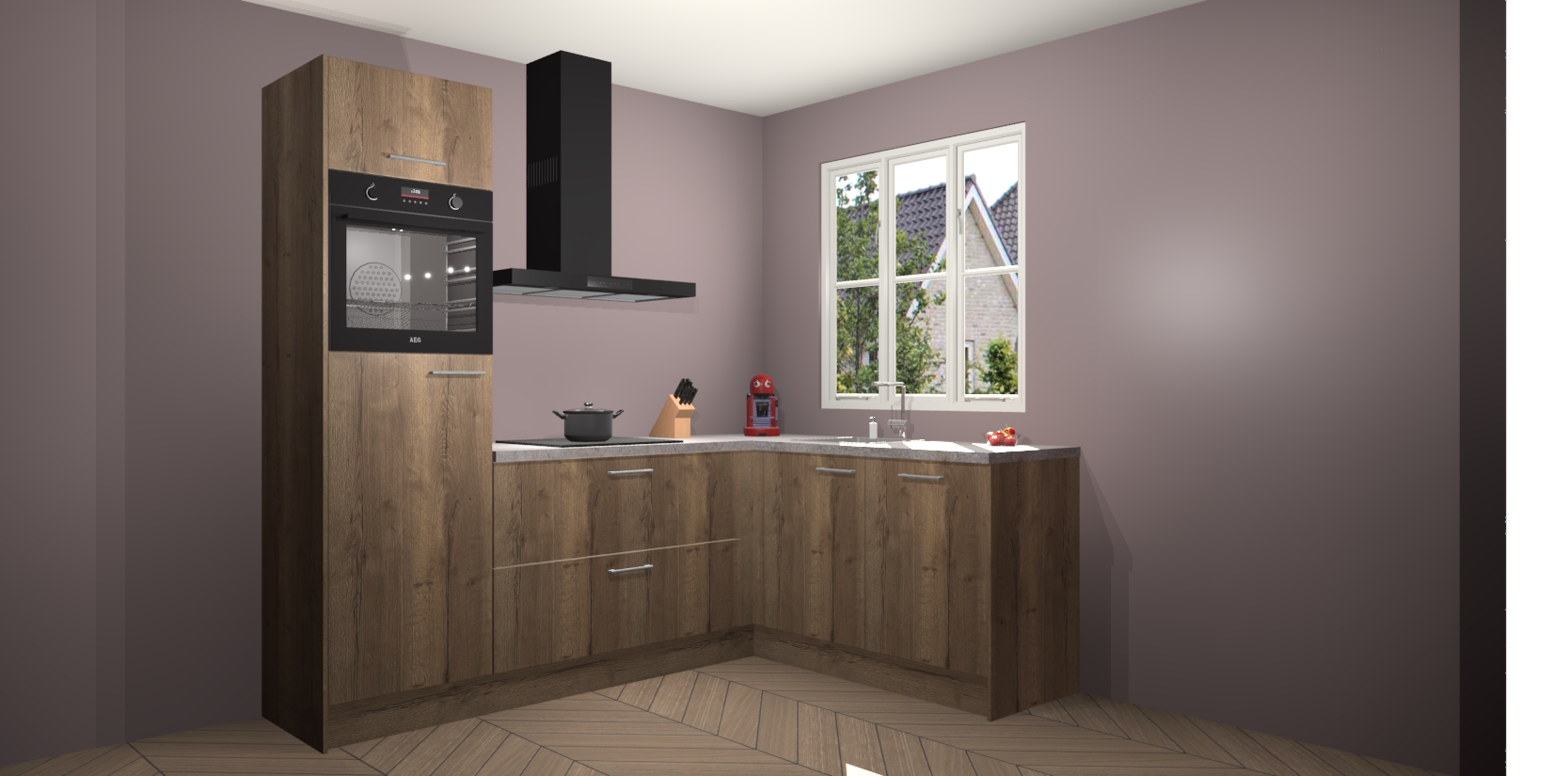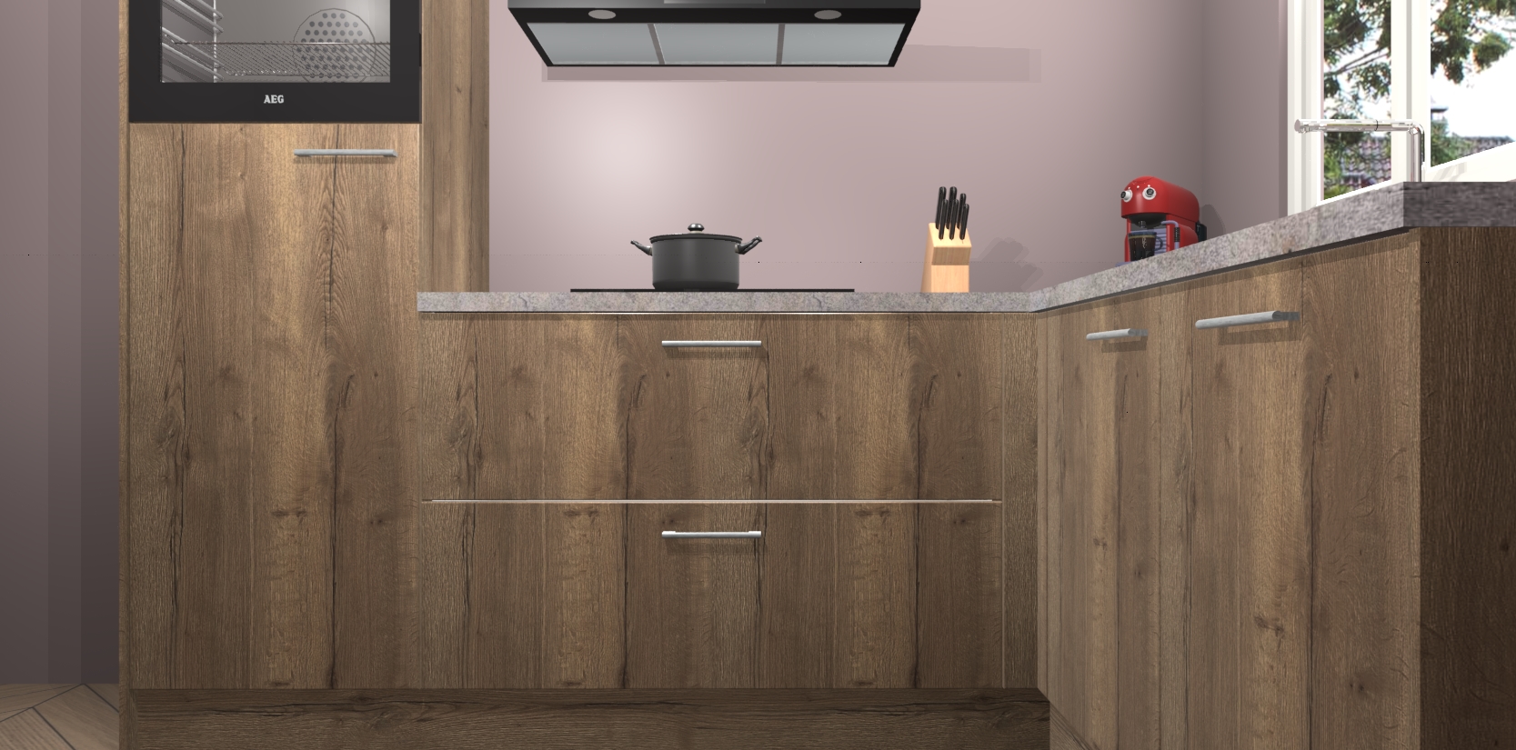 Dit model biedt u voldoende opbergruimte en vijf ingebouwde apparaten: een oven, inductiekookplaat, afzuigkap, vaatwasser en koelkast. Deze apparaten kunnen gemakkelijk worden geüpgrade naar AEG nadat u besteld heeft. De verschillende laden en kastjes bevatten softclose-deuren waardoor ze gezellig dichtvallen met een geruststellend helemaal geruisloos geluid. En dat is nog niet alles! We garanderen ook dat de prijs altijd laag blijft - dus haal nu uw Chocolade Eiken keuken Victoria terwijl het kan.