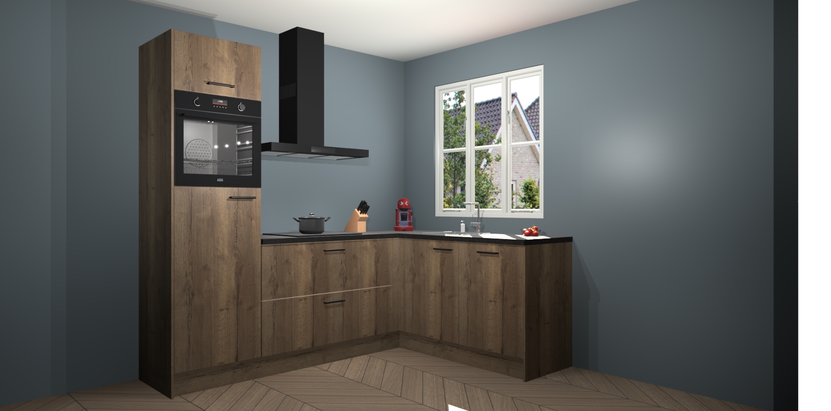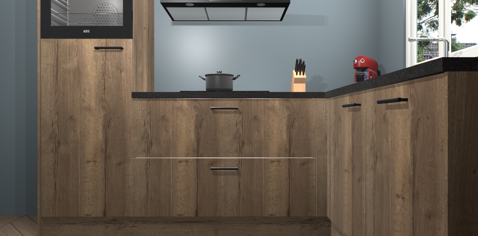 Dit model biedt u voldoende opbergruimte en vijf ingebouwde apparaten: een oven, inductiekookplaat, afzuigkap, vaatwasser en koelkast. Deze apparaten kunnen gemakkelijk worden geüpgrade naar AEG nadat u besteld heeft. De verschillende laden en kastjes bevatten softclose-deuren waardoor ze gezellig dichtvallen met een geruststellend helemaal geruisloos geluid. En dat is nog niet alles! We garanderen ook dat de prijs altijd laag blijft - dus haal nu uw Chocolade Eiken keuken Victoria terwijl het kan.