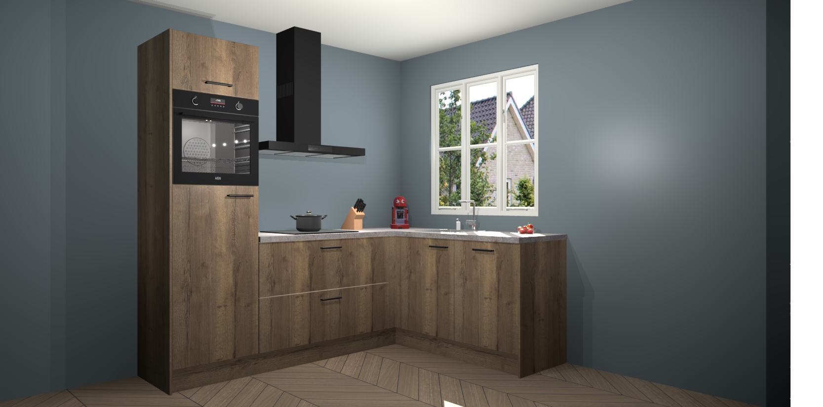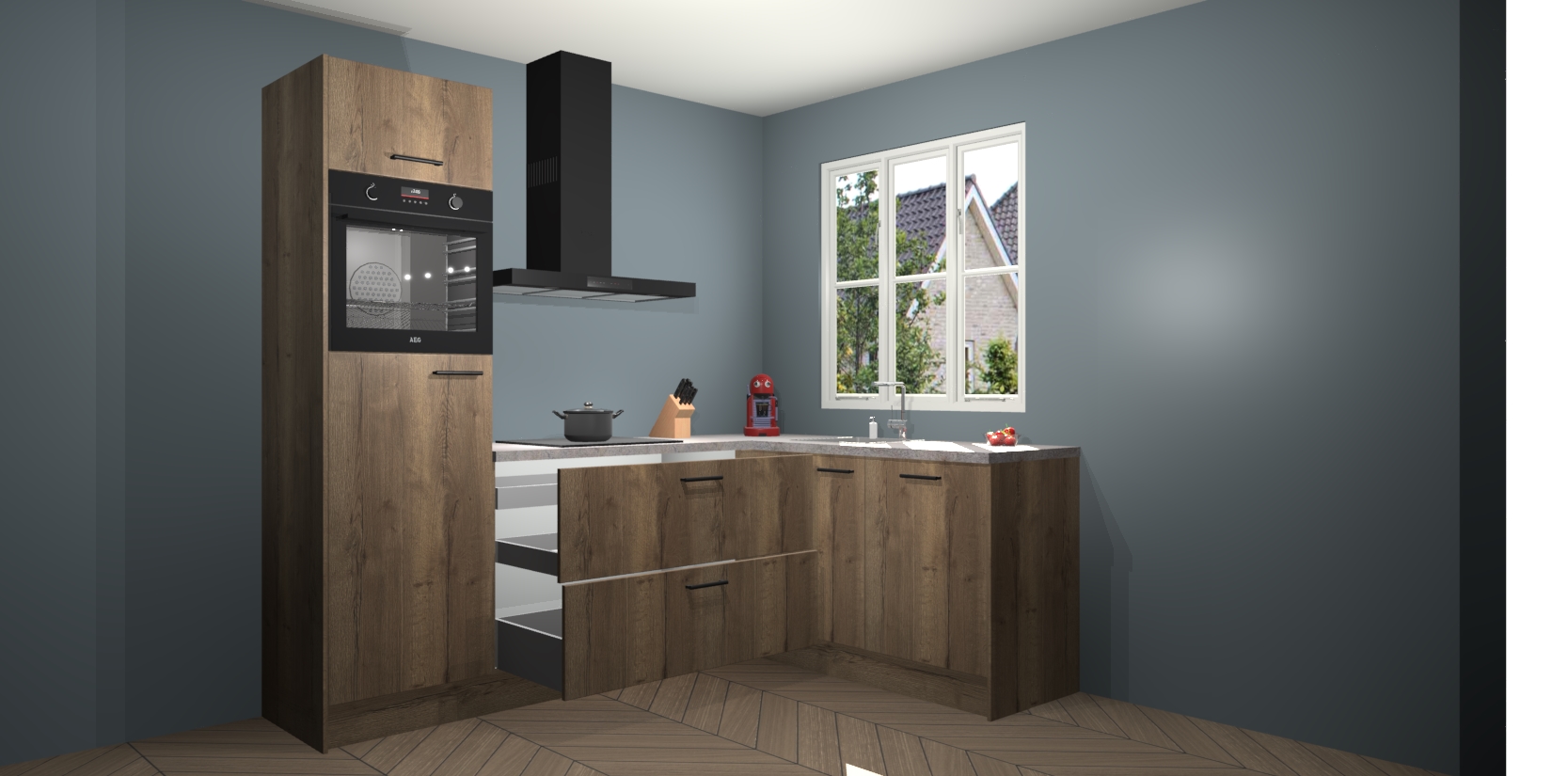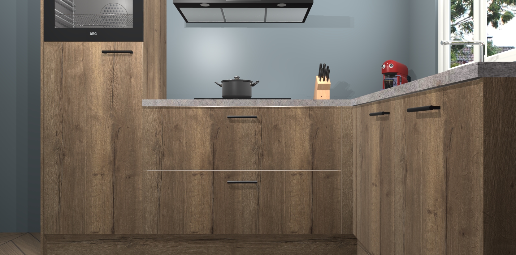 Dit model biedt u voldoende opbergruimte en vijf ingebouwde apparaten: een oven, inductiekookplaat, afzuigkap, vaatwasser en koelkast. Deze apparaten kunnen gemakkelijk worden geüpgrade naar AEG nadat u besteld heeft. De verschillende laden en kastjes bevatten softclose-deuren waardoor ze gezellig dichtvallen met een geruststellend helemaal geruisloos geluid. En dat is nog niet alles! We garanderen ook dat de prijs altijd laag blijft - dus haal nu uw Chocolade Eiken keuken Victoria terwijl het kan.