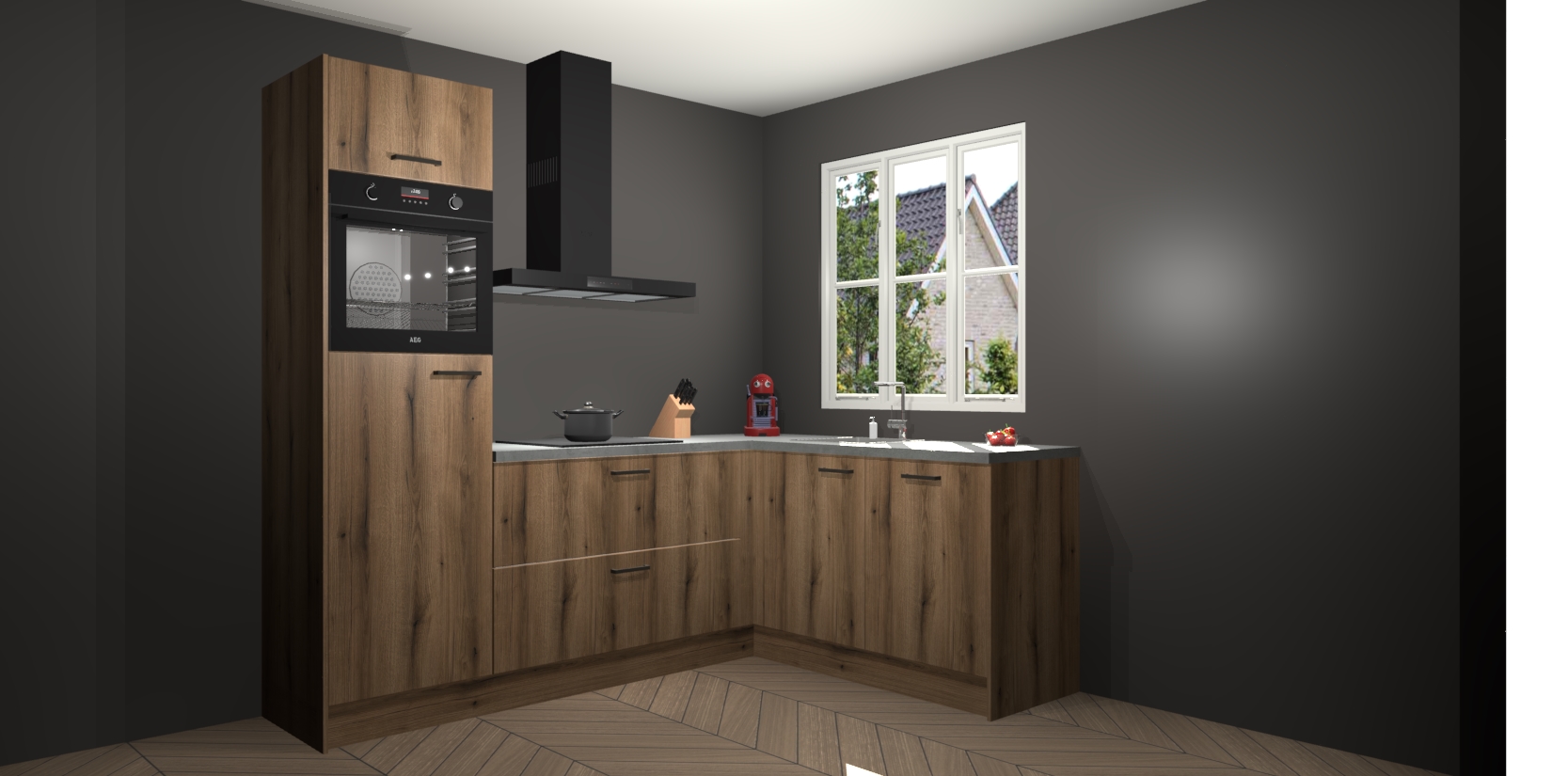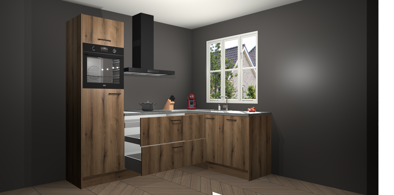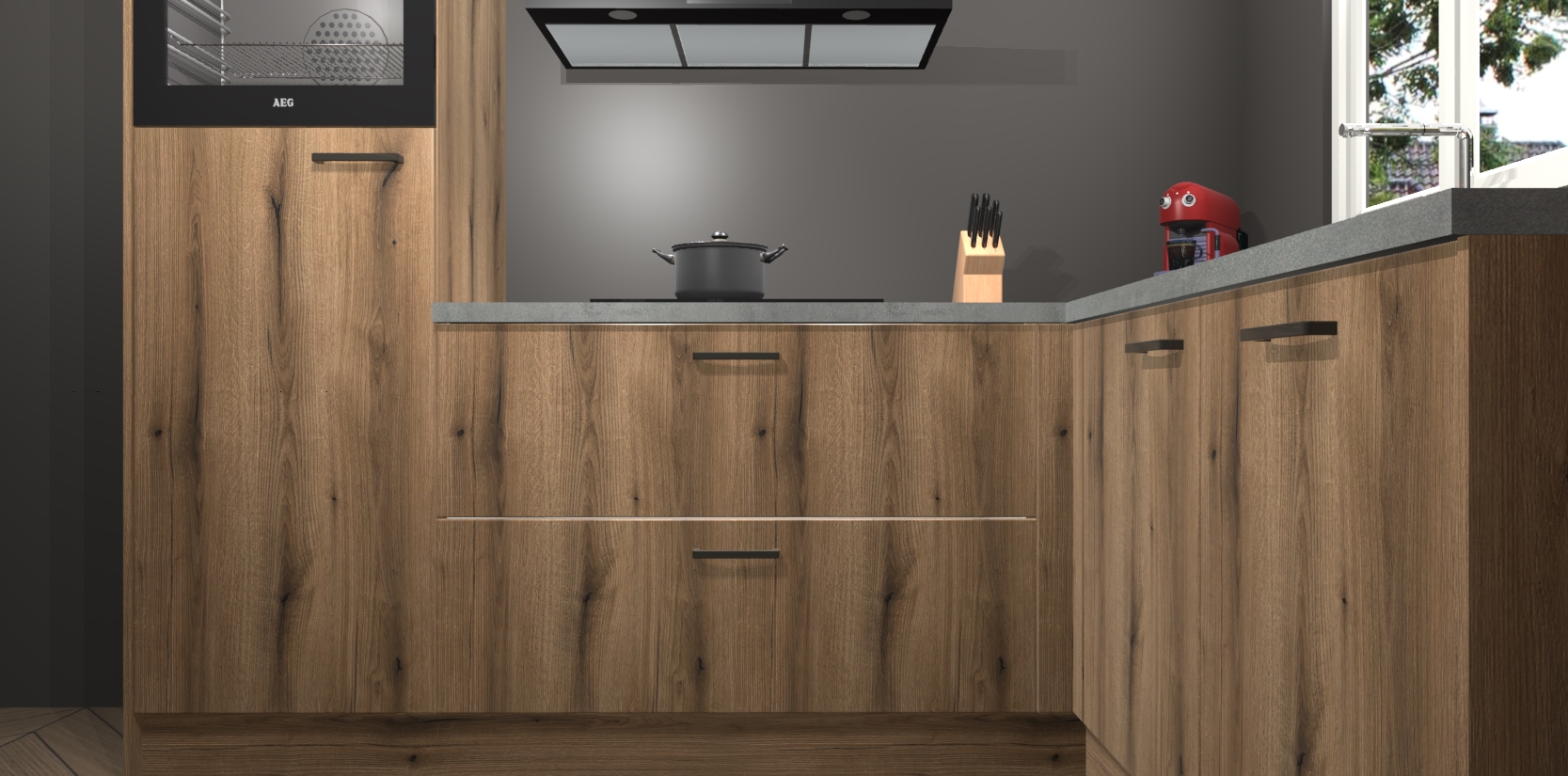 Dit model biedt u voldoende opbergruimte en vijf ingebouwde apparaten: een oven, inductiekookplaat, afzuigkap, vaatwasser en koelkast. Deze apparaten kunnen gemakkelijk worden geüpgrade naar AEG nadat u besteld heeft. De verschillende laden en kastjes bevatten softclose-deuren waardoor ze gezellig dichtvallen met een geruststellend helemaal geruisloos geluid. En dat is nog niet alles! We garanderen ook dat de prijs altijd laag blijft - dus haal nu uw Chocolade Eiken keuken Victoria terwijl het kan.