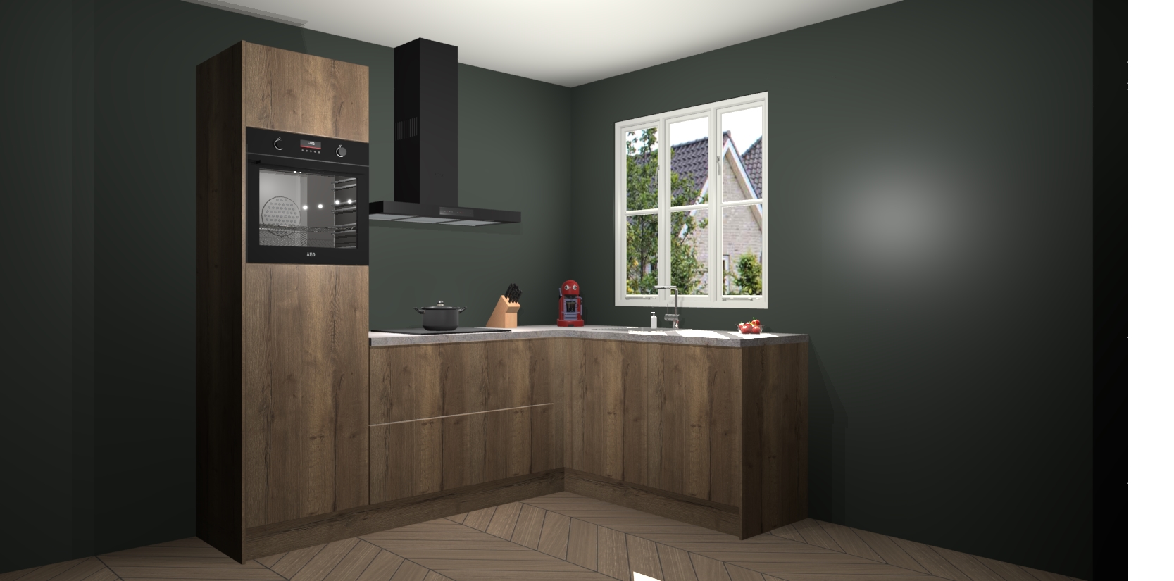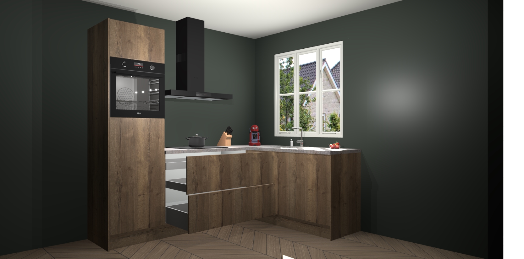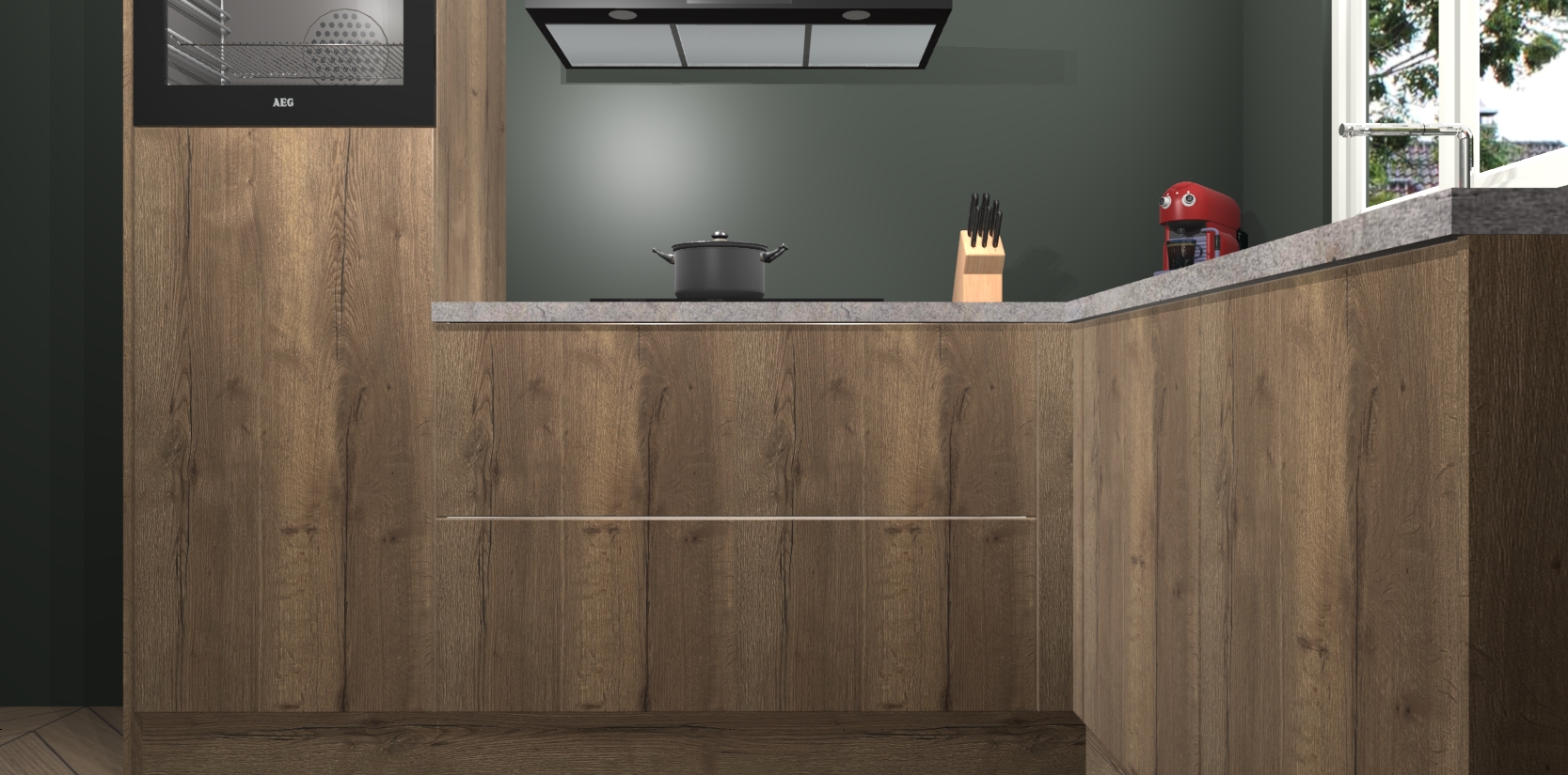 Dit model biedt u voldoende opbergruimte en vijf ingebouwde apparaten: een oven, inductiekookplaat, afzuigkap, vaatwasser en koelkast. Deze apparaten kunnen gemakkelijk worden geüpgrade naar AEG nadat u besteld heeft. De verschillende laden en kastjes bevatten softclose-deuren waardoor ze gezellig dichtvallen met een geruststellend helemaal geruisloos geluid. En dat is nog niet alles! We garanderen ook dat de prijs altijd laag blijft - dus haal nu uw Chocolade Eiken keuken Victoria terwijl het kan.