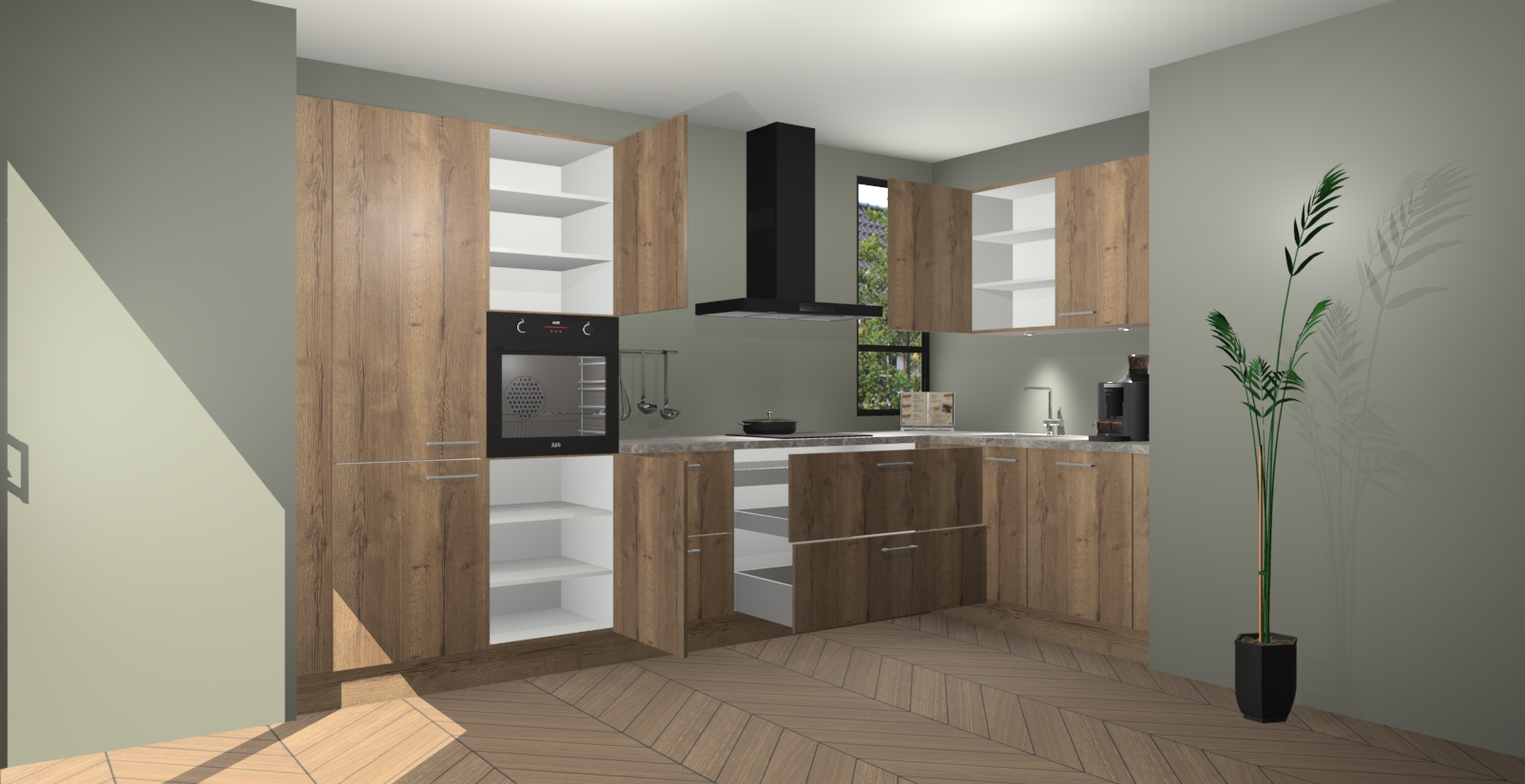 Welkom in uw nieuwe moderne keuken! Laat ons u voorstellen aan de Chocolade Eiken keuken Vlaanderen . Deze prachtige hoekkeuken straalt exclusiviteit en luxe uit als geen ander. Het strakke design, de tijdloze kleuren en het model maken van deze keuken een moderne klassieker. En met voldoende opbergruimte heeft deze keuken echt voor ieder wat wils.