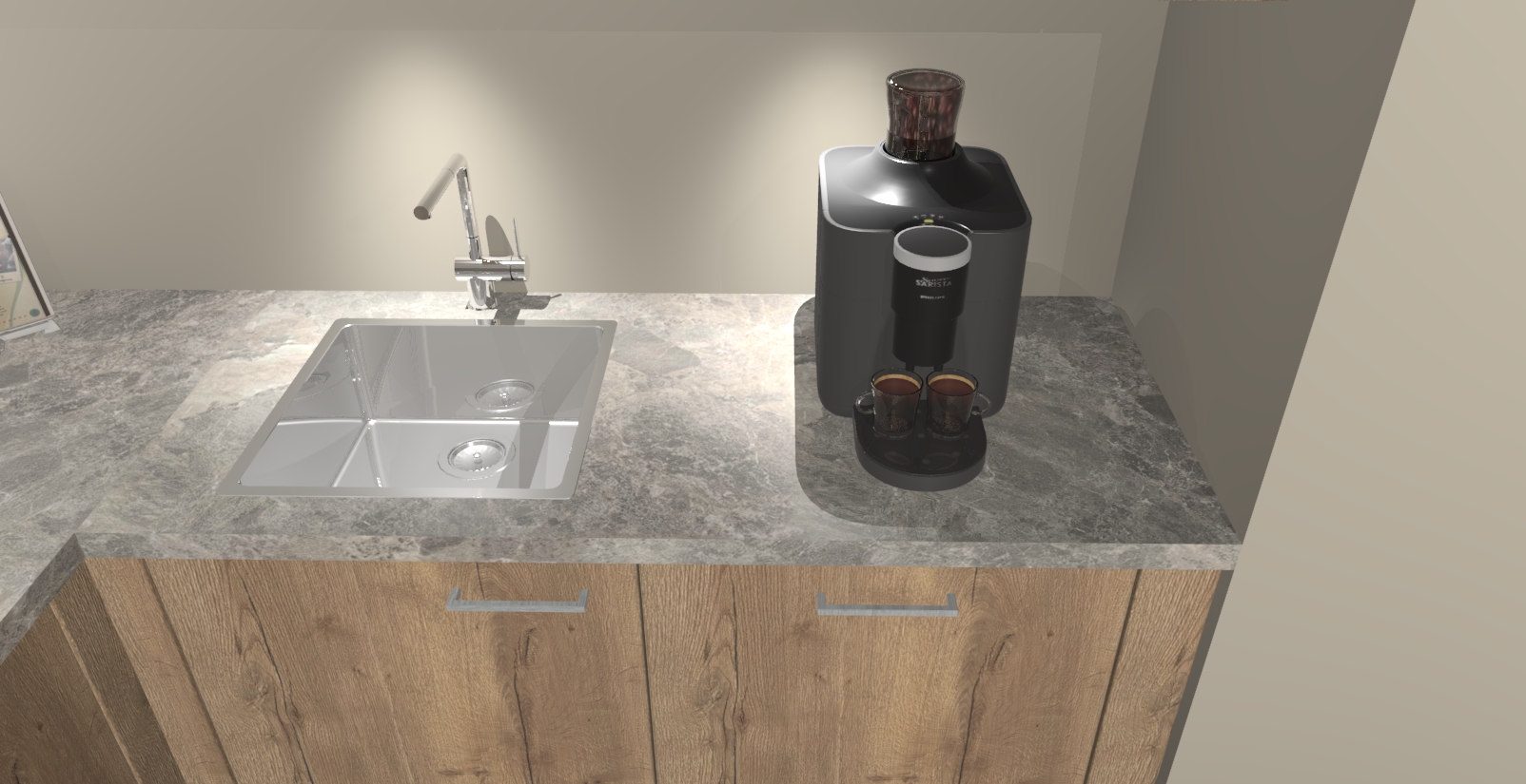 - De spoelbak is nog niet in gevreesd. Dit dient tijdens het werk gedaan te worden