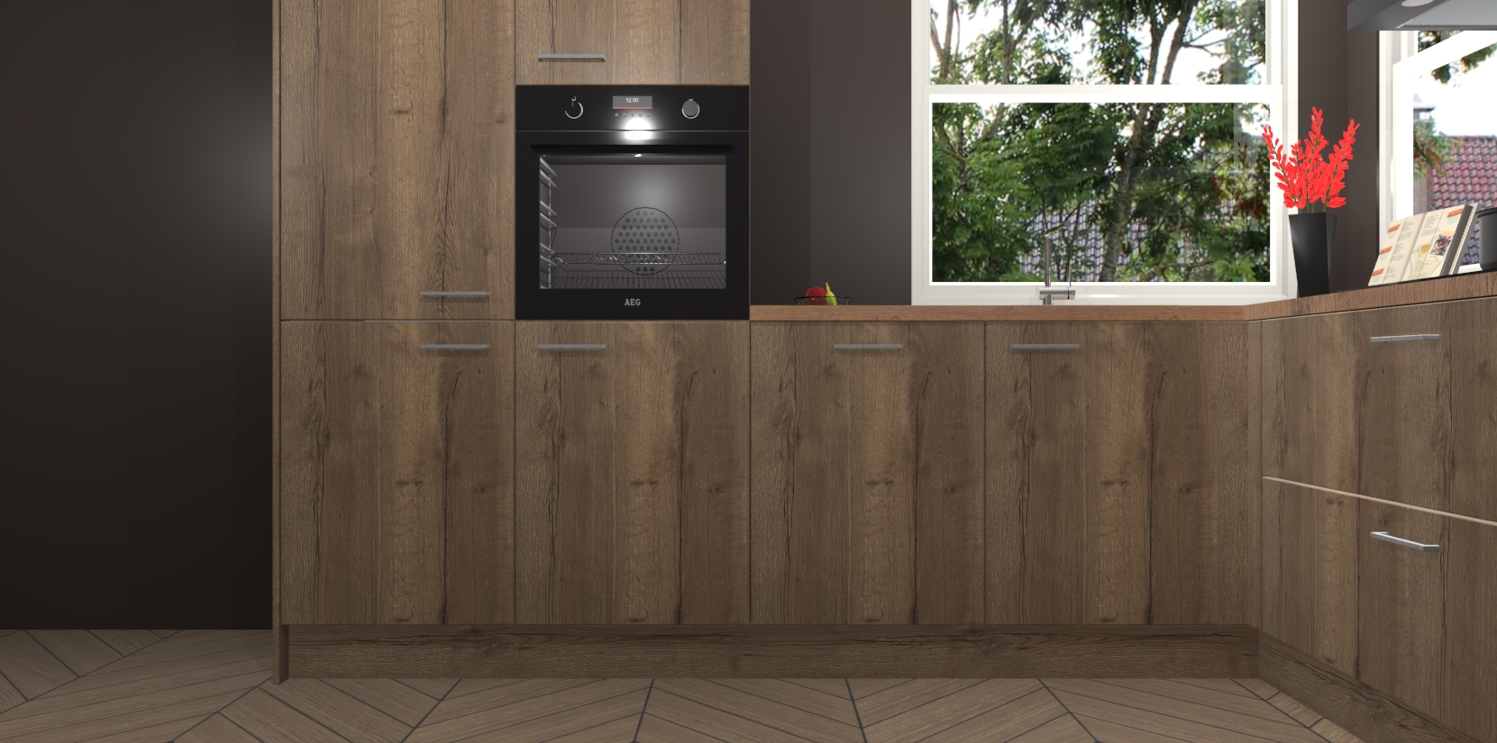 Elke Chocolade Eiken keuken Kotor wordt compleet geleverd met vijf inbouwapparaten, waaronder een oven, inductiekookplaat, afzuigkap, vaatwasser en koelkast. Sterker nog - indien gewenst kunt u deze apparaten na bestelling eenvoudig upgraden naar AEG! Extra functies zijn onder andere soft close deuren voor extra gemak, en elke kast wordt voor gemonteerd geleverd zodat u sneller van uw nieuwe keuken kunt genieten.