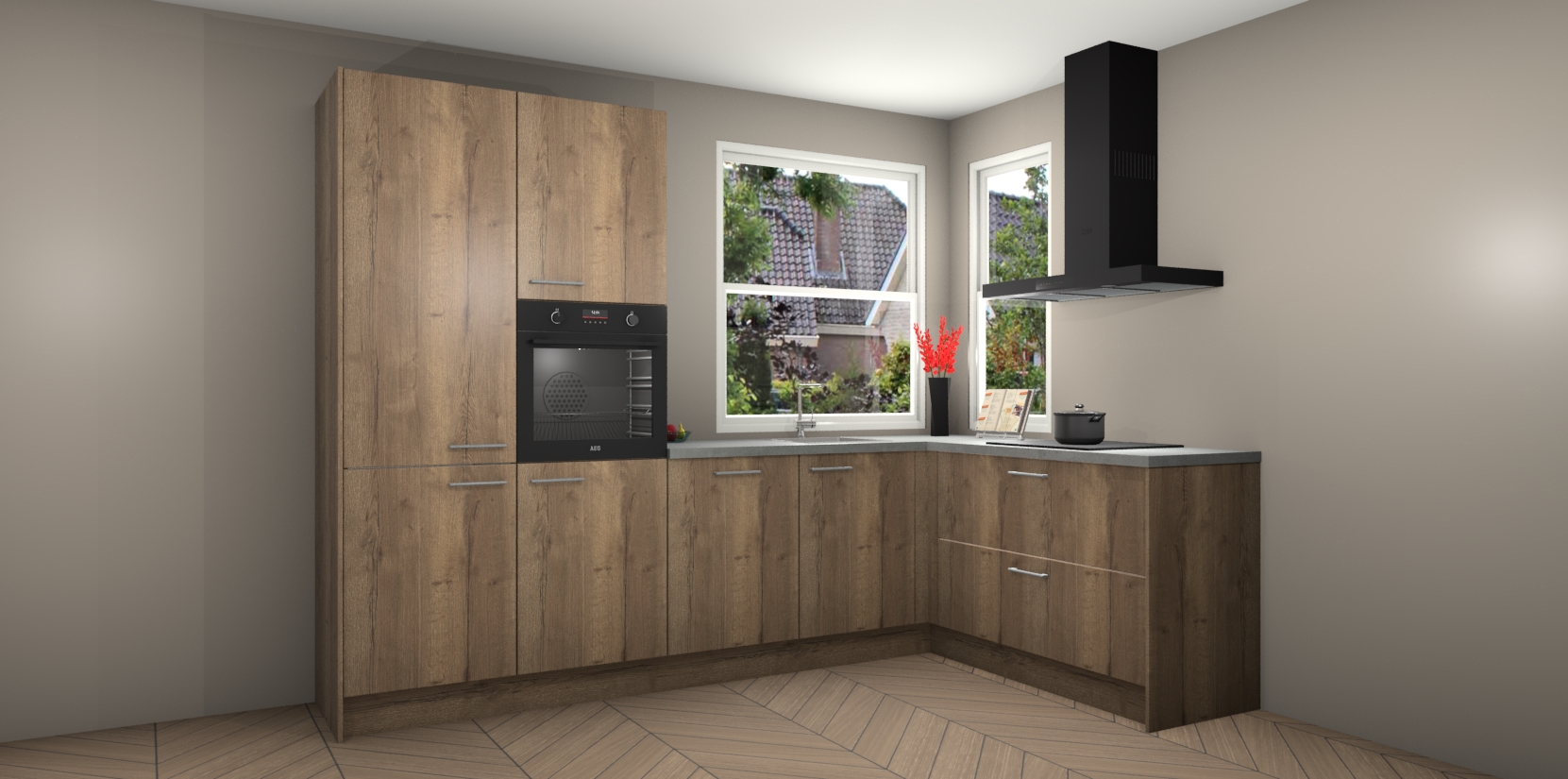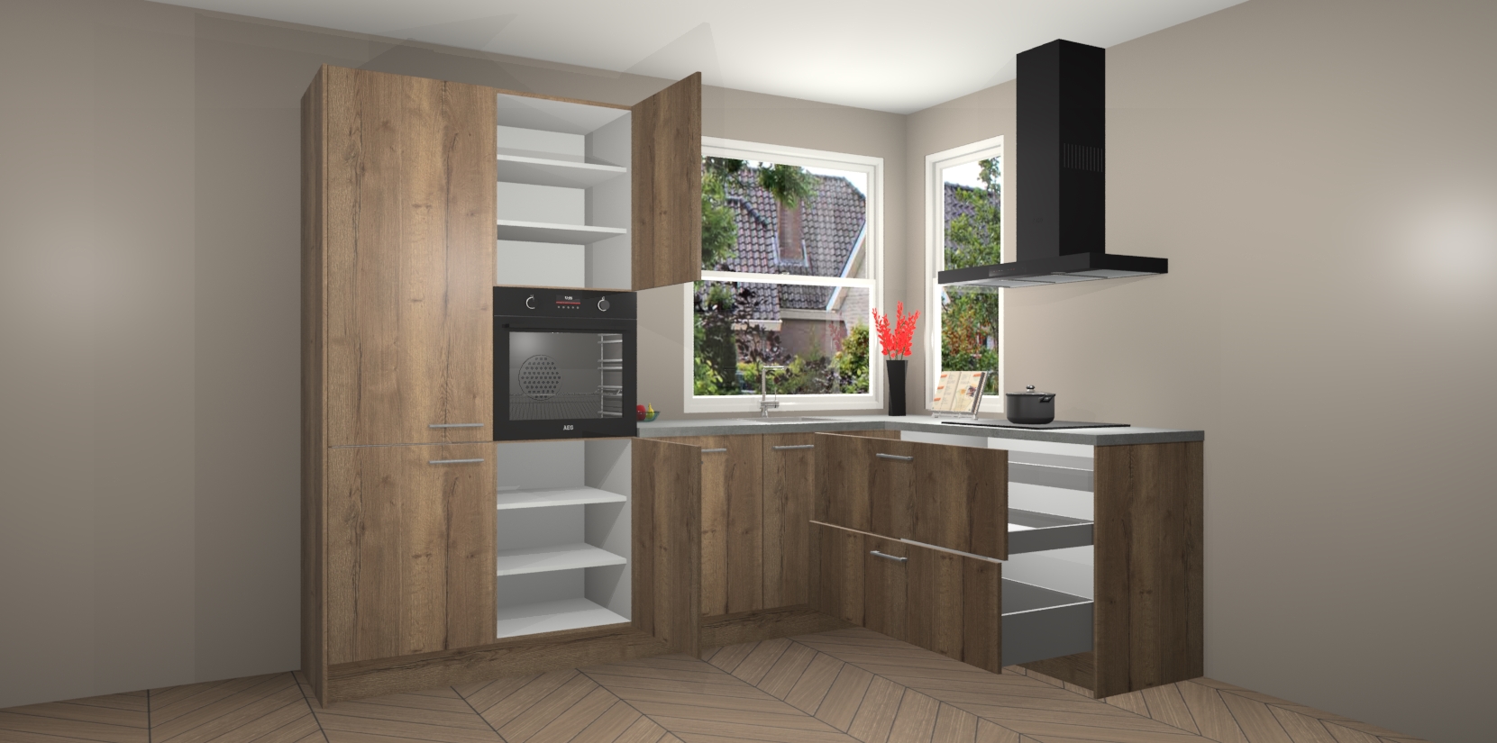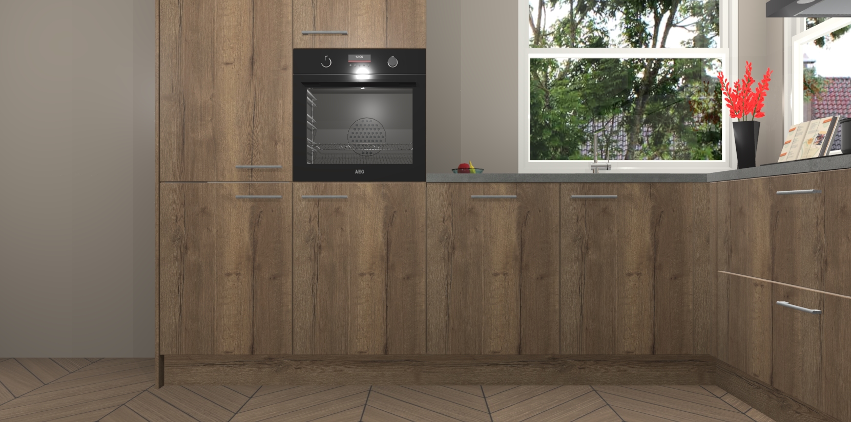 Elke Chocolade Eiken keuken Kotor wordt compleet geleverd met vijf inbouwapparaten, waaronder een oven, inductiekookplaat, afzuigkap, vaatwasser en koelkast. Sterker nog - indien gewenst kunt u deze apparaten na bestelling eenvoudig upgraden naar AEG! Extra functies zijn onder andere soft close deuren voor extra gemak, en elke kast wordt voor gemonteerd geleverd zodat u sneller van uw nieuwe keuken kunt genieten.