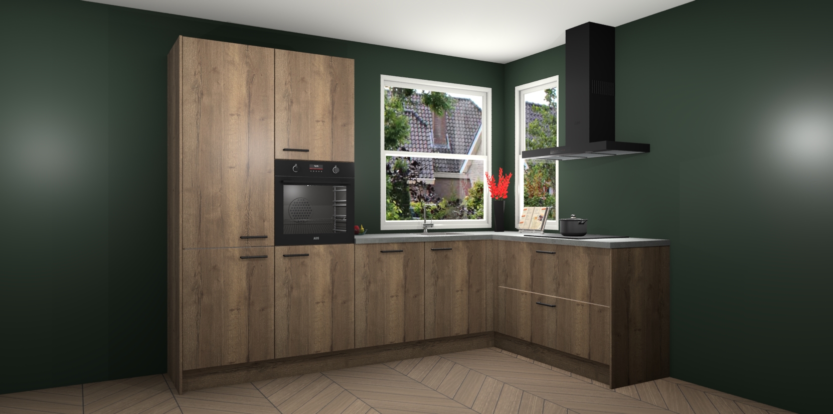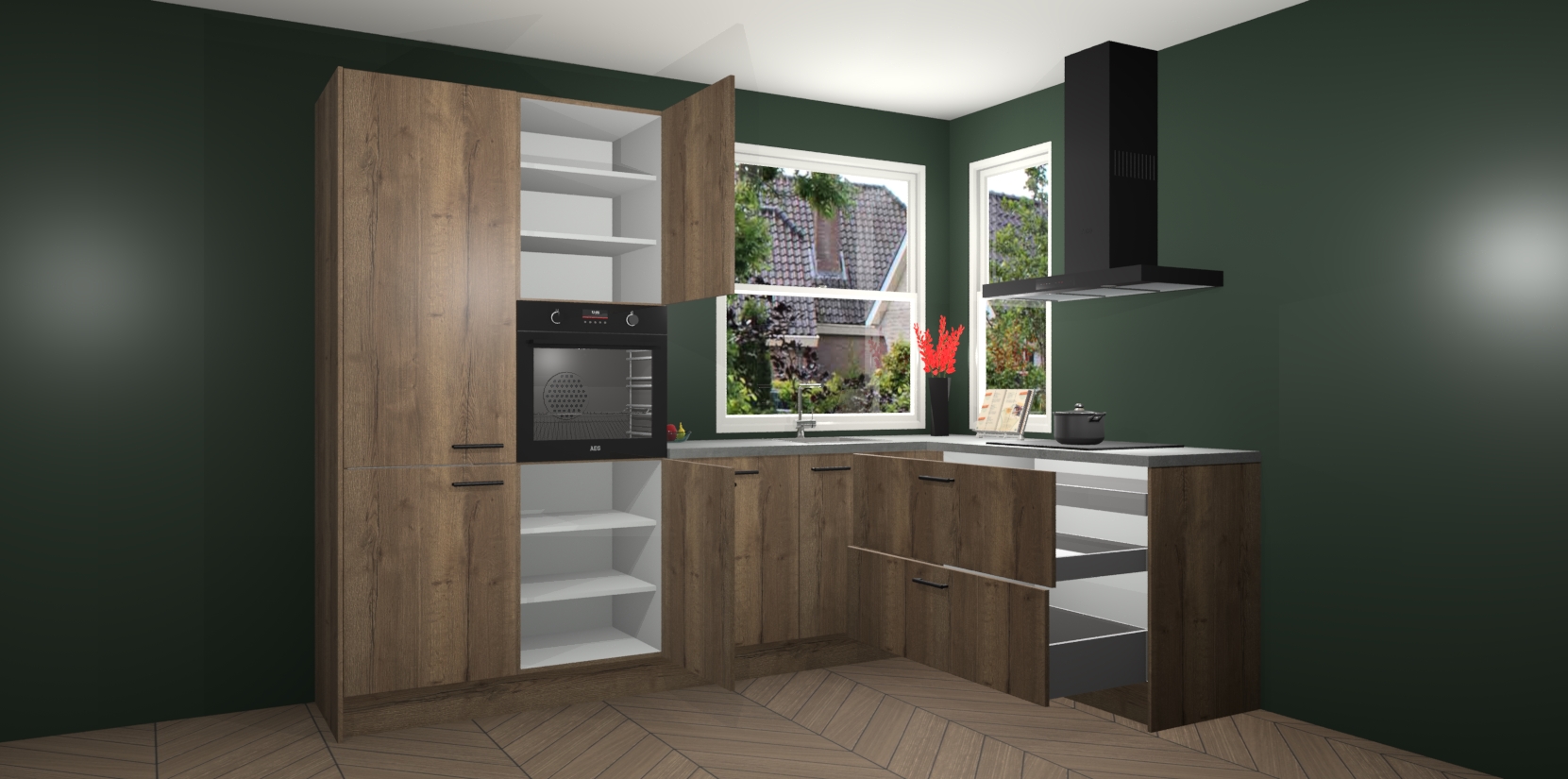 Elke Chocolade Eiken keuken Kotor wordt compleet geleverd met vijf inbouwapparaten, waaronder een oven, inductiekookplaat, afzuigkap, vaatwasser en koelkast. Sterker nog - indien gewenst kunt u deze apparaten na bestelling eenvoudig upgraden naar AEG! Extra functies zijn onder andere soft close deuren voor extra gemak, en elke kast wordt voor gemonteerd geleverd zodat u sneller van uw nieuwe keuken kunt genieten.