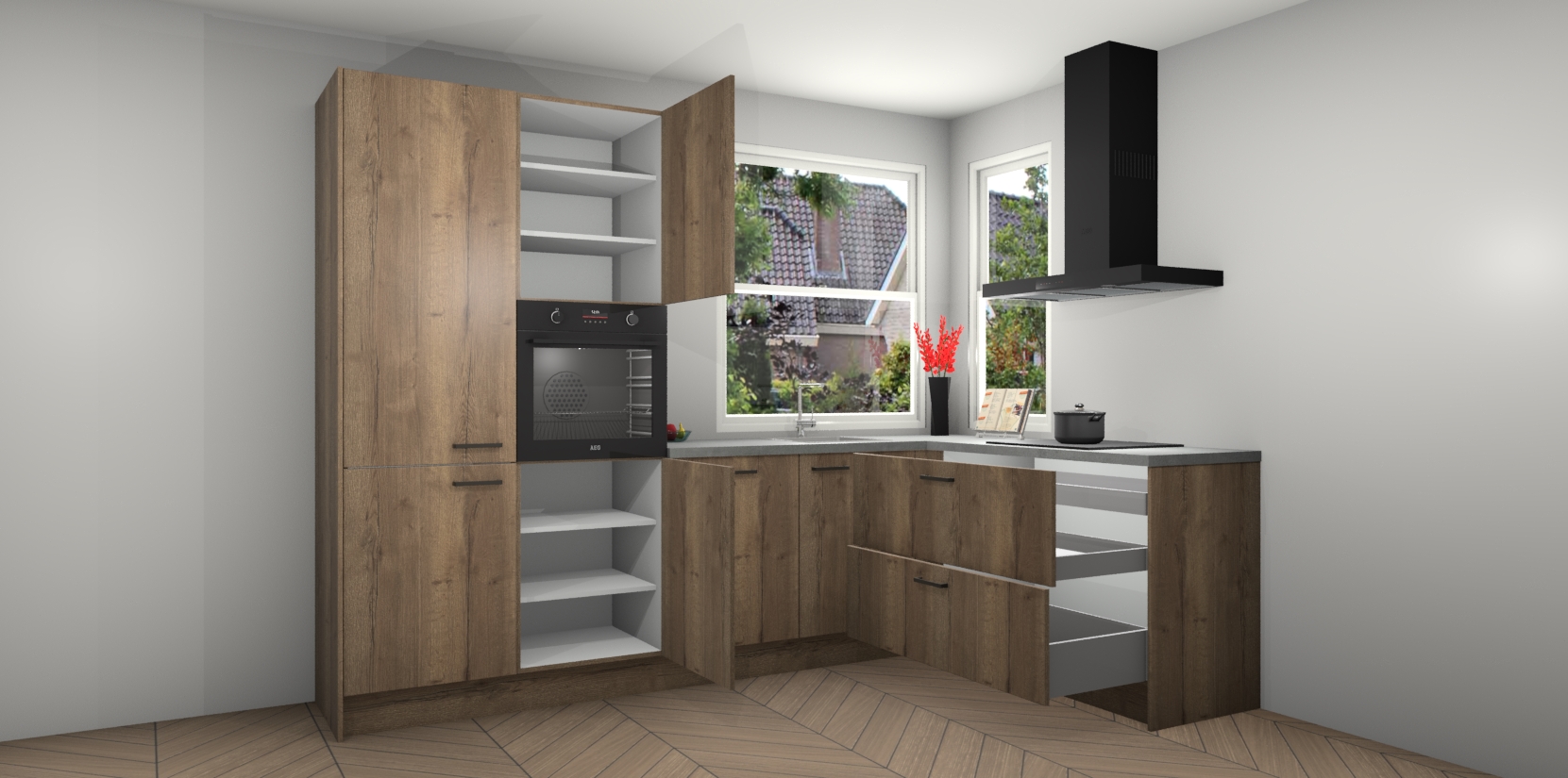 Elke Chocolade Eiken keuken Kotor wordt compleet geleverd met vijf inbouwapparaten, waaronder een oven, inductiekookplaat, afzuigkap, vaatwasser en koelkast. Sterker nog - indien gewenst kunt u deze apparaten na bestelling eenvoudig upgraden naar AEG! Extra functies zijn onder andere soft close deuren voor extra gemak, en elke kast wordt voor gemonteerd geleverd zodat u sneller van uw nieuwe keuken kunt genieten.