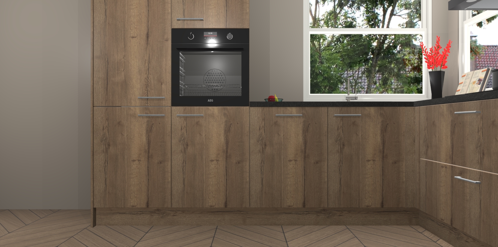 Elke Chocolade Eiken keuken Kotor wordt compleet geleverd met vijf inbouwapparaten, waaronder een oven, inductiekookplaat, afzuigkap, vaatwasser en koelkast. Sterker nog - indien gewenst kunt u deze apparaten na bestelling eenvoudig upgraden naar AEG! Extra functies zijn onder andere soft close deuren voor extra gemak, en elke kast wordt voor gemonteerd geleverd zodat u sneller van uw nieuwe keuken kunt genieten.