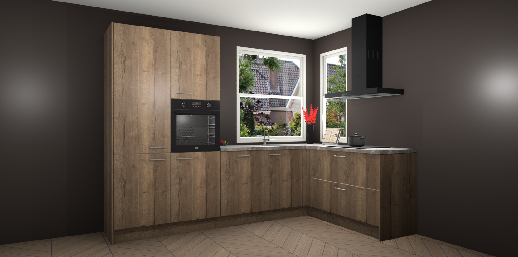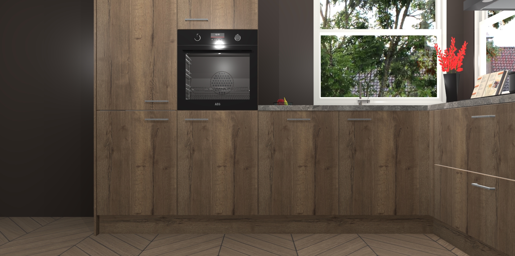Elke Chocolade Eiken keuken Kotor wordt compleet geleverd met vijf inbouwapparaten, waaronder een oven, inductiekookplaat, afzuigkap, vaatwasser en koelkast. Sterker nog - indien gewenst kunt u deze apparaten na bestelling eenvoudig upgraden naar AEG! Extra functies zijn onder andere soft close deuren voor extra gemak, en elke kast wordt voor gemonteerd geleverd zodat u sneller van uw nieuwe keuken kunt genieten.