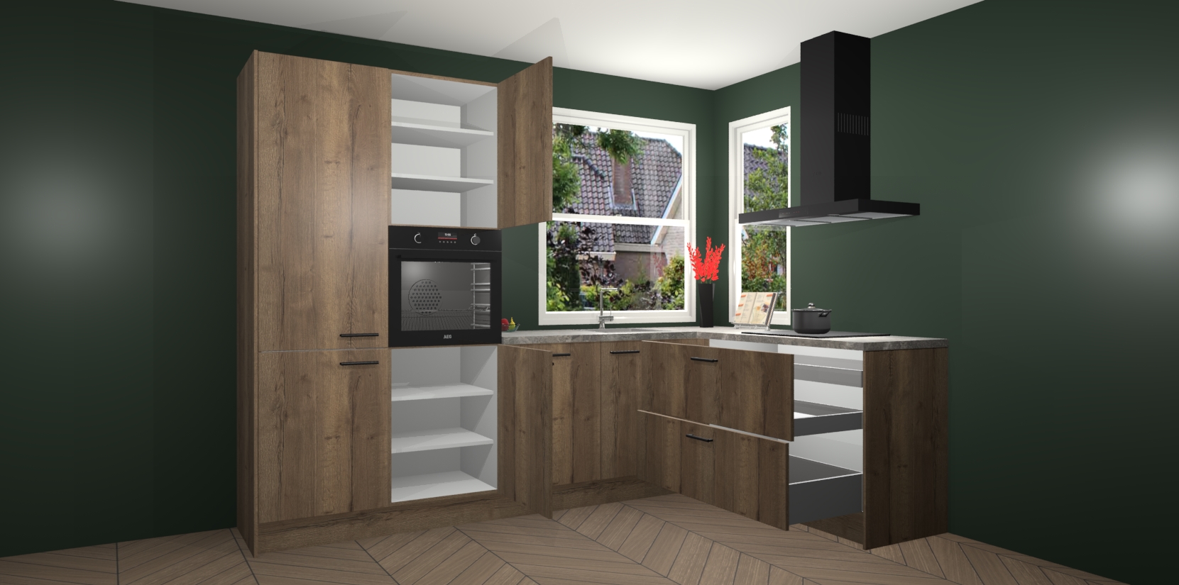 Elke Chocolade Eiken keuken Kotor wordt compleet geleverd met vijf inbouwapparaten, waaronder een oven, inductiekookplaat, afzuigkap, vaatwasser en koelkast. Sterker nog - indien gewenst kunt u deze apparaten na bestelling eenvoudig upgraden naar AEG! Extra functies zijn onder andere soft close deuren voor extra gemak, en elke kast wordt voor gemonteerd geleverd zodat u sneller van uw nieuwe keuken kunt genieten.