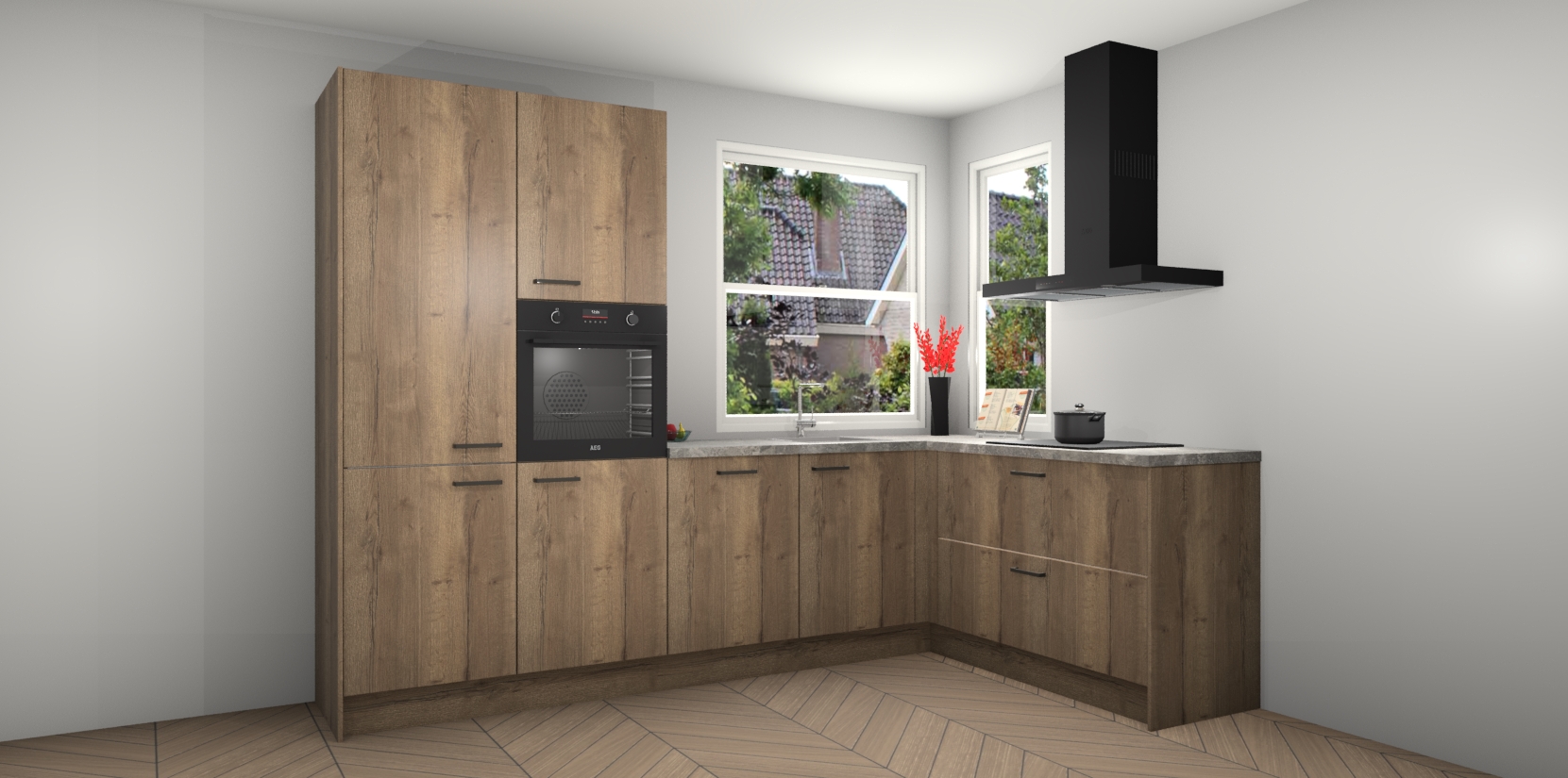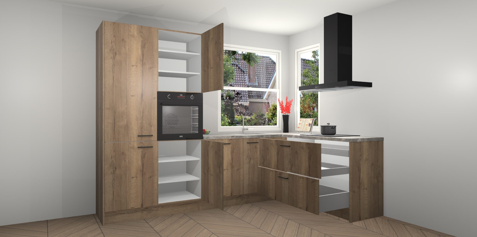 Elke Chocolade Eiken keuken Kotor wordt compleet geleverd met vijf inbouwapparaten, waaronder een oven, inductiekookplaat, afzuigkap, vaatwasser en koelkast. Sterker nog - indien gewenst kunt u deze apparaten na bestelling eenvoudig upgraden naar AEG! Extra functies zijn onder andere soft close deuren voor extra gemak, en elke kast wordt voor gemonteerd geleverd zodat u sneller van uw nieuwe keuken kunt genieten.