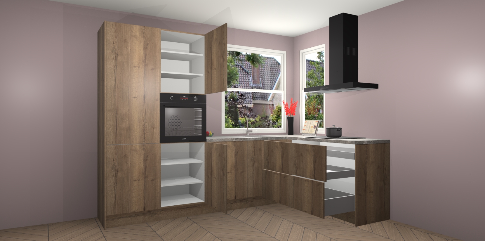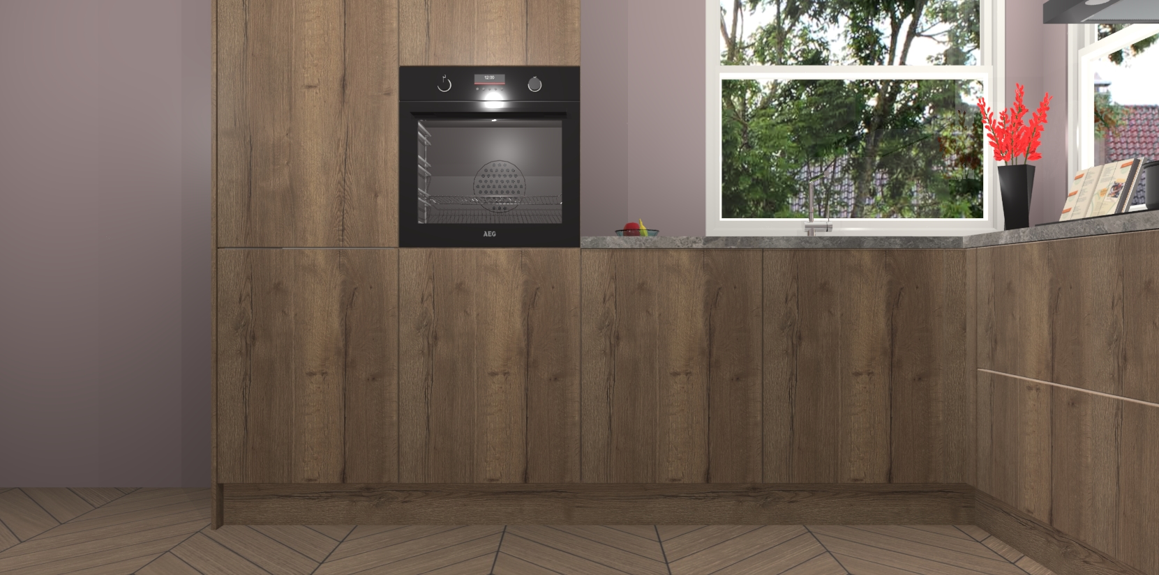 Elke Chocolade Eiken keuken Kotor wordt compleet geleverd met vijf inbouwapparaten, waaronder een oven, inductiekookplaat, afzuigkap, vaatwasser en koelkast. Sterker nog - indien gewenst kunt u deze apparaten na bestelling eenvoudig upgraden naar AEG! Extra functies zijn onder andere soft close deuren voor extra gemak, en elke kast wordt voor gemonteerd geleverd zodat u sneller van uw nieuwe keuken kunt genieten.