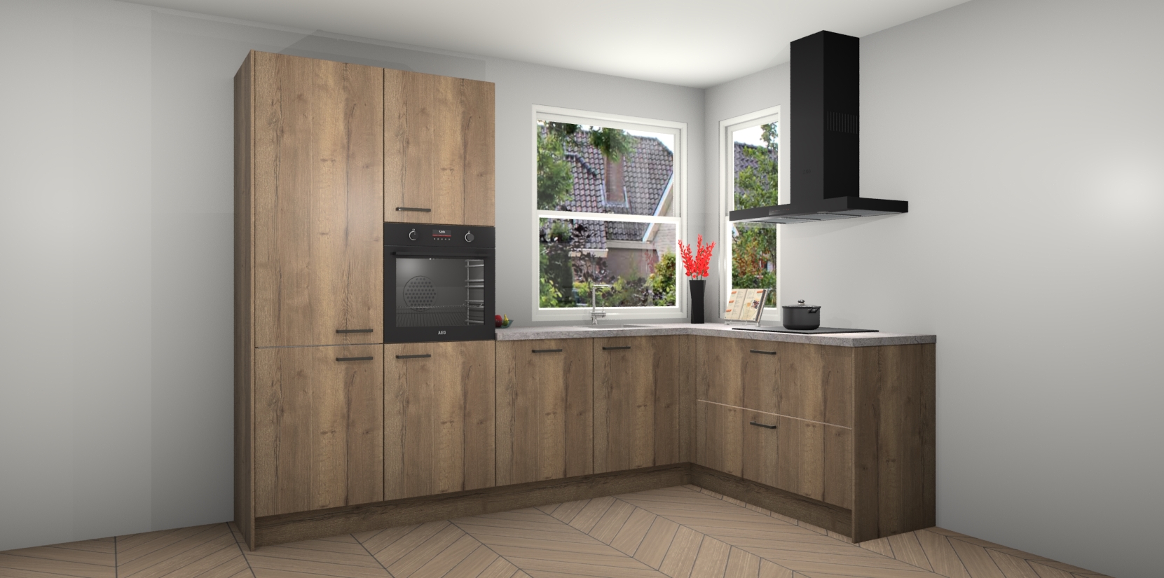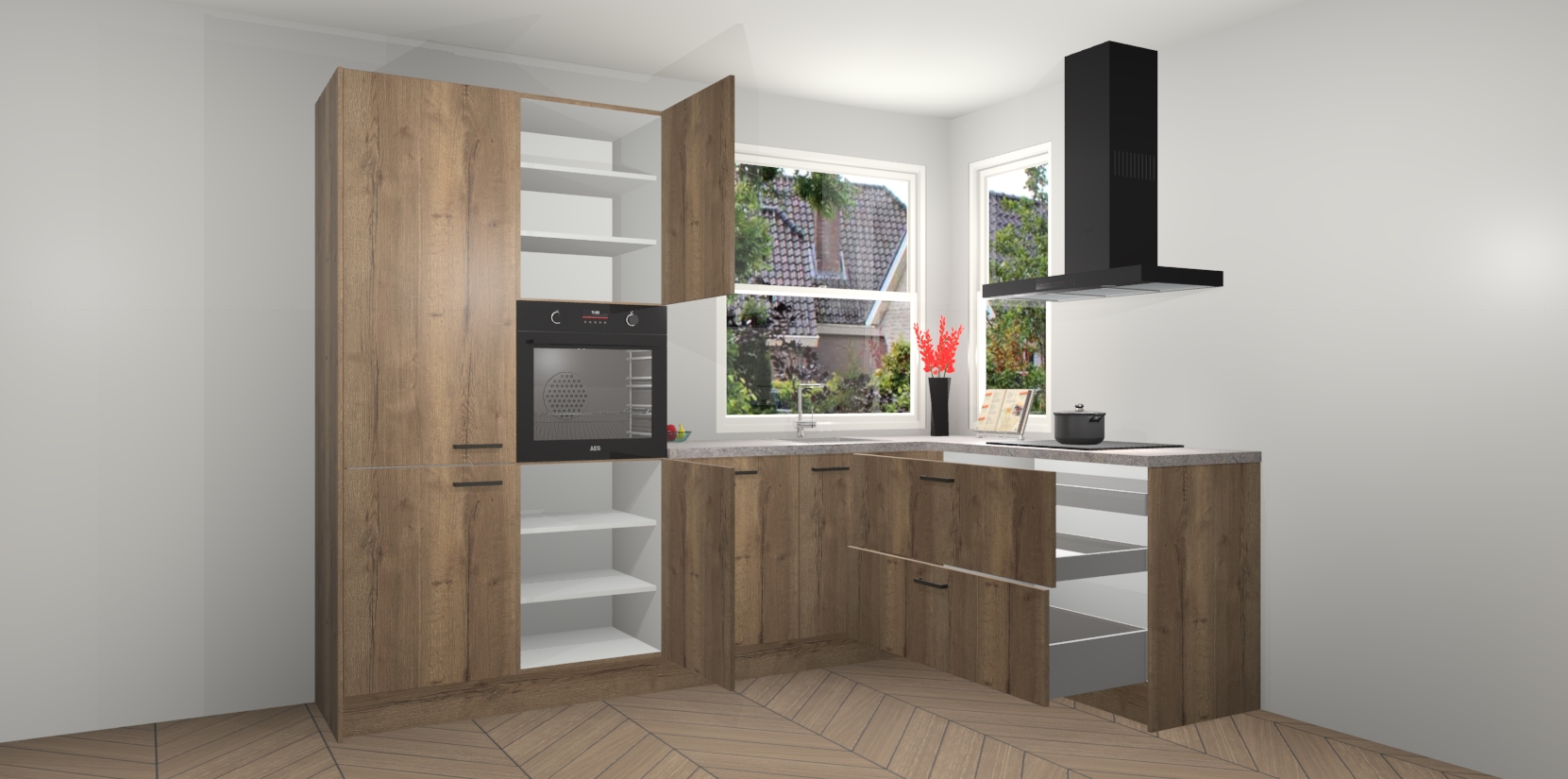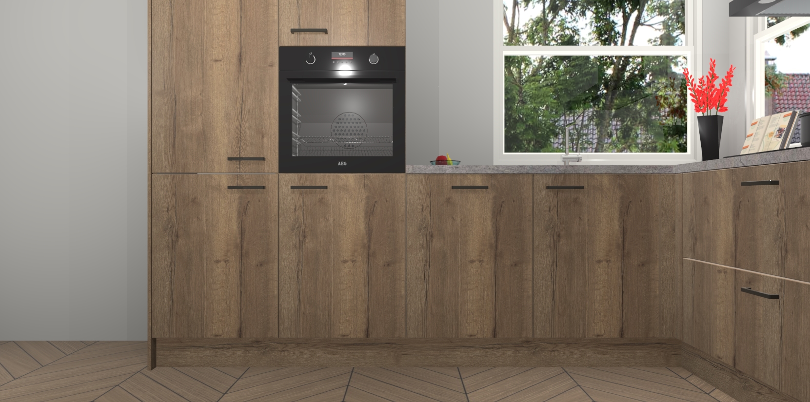 Elke Chocolade Eiken keuken Kotor wordt compleet geleverd met vijf inbouwapparaten, waaronder een oven, inductiekookplaat, afzuigkap, vaatwasser en koelkast. Sterker nog - indien gewenst kunt u deze apparaten na bestelling eenvoudig upgraden naar AEG! Extra functies zijn onder andere soft close deuren voor extra gemak, en elke kast wordt voor gemonteerd geleverd zodat u sneller van uw nieuwe keuken kunt genieten.