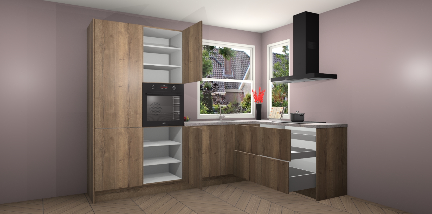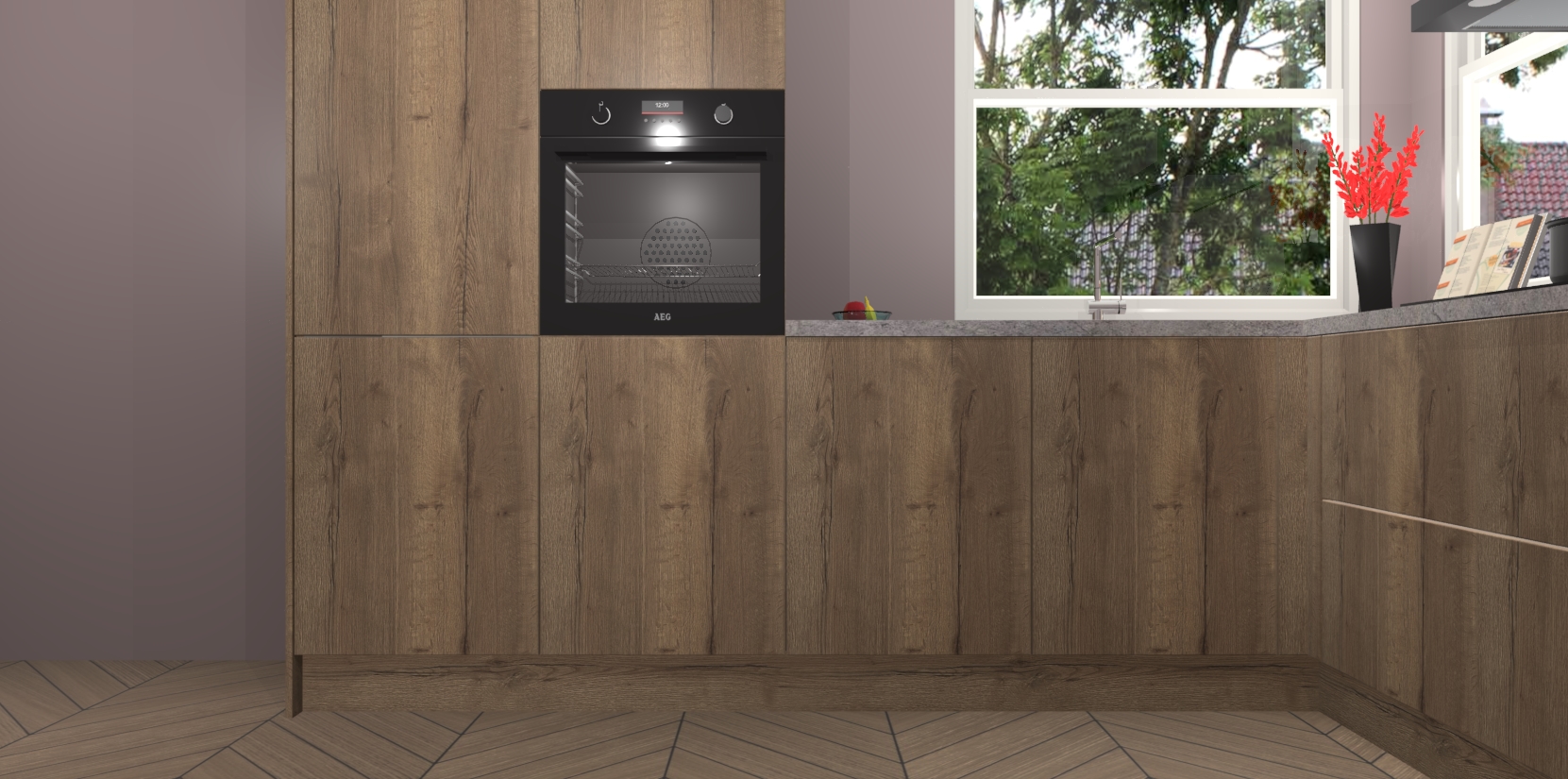 Elke Chocolade Eiken keuken Kotor wordt compleet geleverd met vijf inbouwapparaten, waaronder een oven, inductiekookplaat, afzuigkap, vaatwasser en koelkast. Sterker nog - indien gewenst kunt u deze apparaten na bestelling eenvoudig upgraden naar AEG! Extra functies zijn onder andere soft close deuren voor extra gemak, en elke kast wordt voor gemonteerd geleverd zodat u sneller van uw nieuwe keuken kunt genieten.