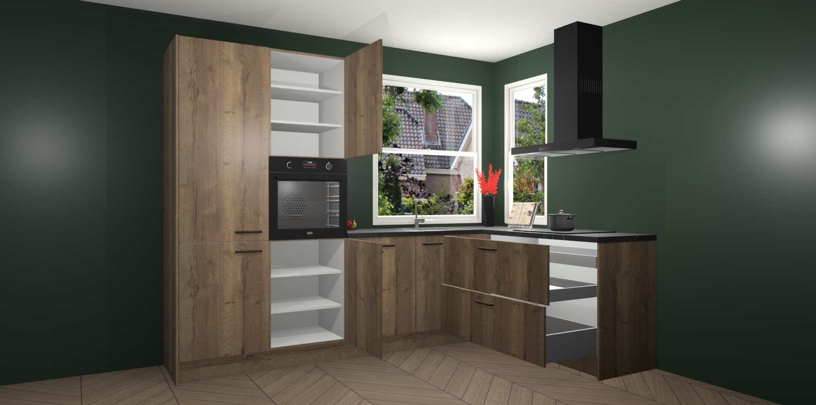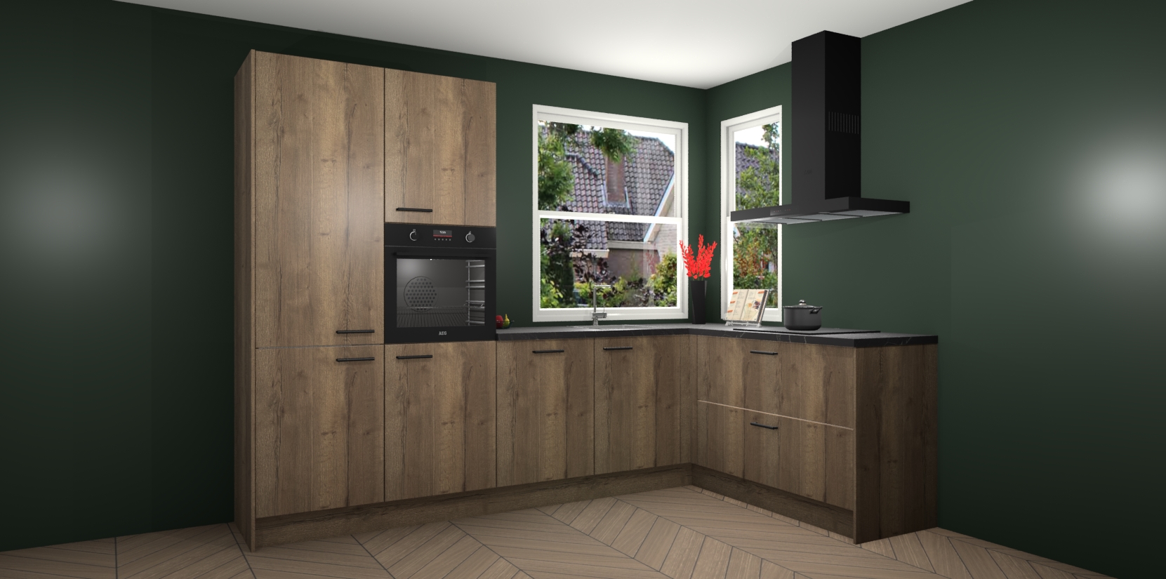 Elke Chocolade Eiken keuken Kotor wordt compleet geleverd met vijf inbouwapparaten, waaronder een oven, inductiekookplaat, afzuigkap, vaatwasser en koelkast. Sterker nog - indien gewenst kunt u deze apparaten na bestelling eenvoudig upgraden naar AEG! Extra functies zijn onder andere soft close deuren voor extra gemak, en elke kast wordt voor gemonteerd geleverd zodat u sneller van uw nieuwe keuken kunt genieten.