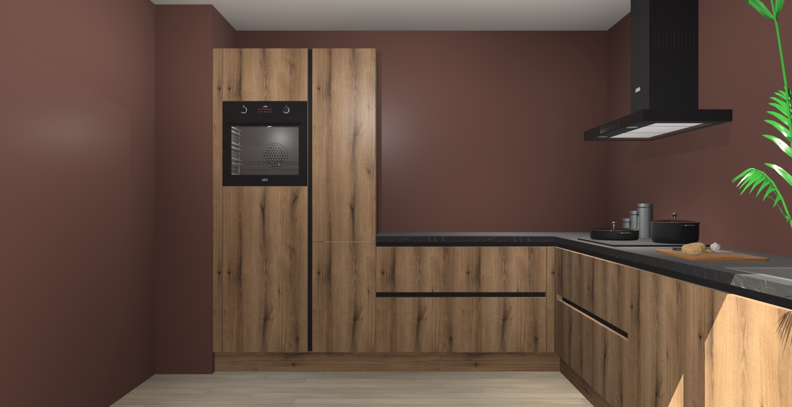 Laat u verrassen door de nieuwste en meest innovatieve keuken van dit moment: De Goud Eiken greeploze keuken Antibes. Deze chique keuken straalt een stijlvolle sfeer uit die zeker bewondering zal oogsten bij uw gasten. Als u op zoek bent naar voldoende opbergruimte voor al uw keukengadgets en -gerei, dan is dit de perfecte oplossing. Met ingebouwde apparatuur zoals een oven, inductiekookplaat, afzuigkap, vaatwasser en koelkast! U krijgt niet alleen veel opbergruimte, maar ook een betrouwbaar soft close-deursysteem dat ervoor zorgt dat er nooit meer kastdeuren dichtslaan!