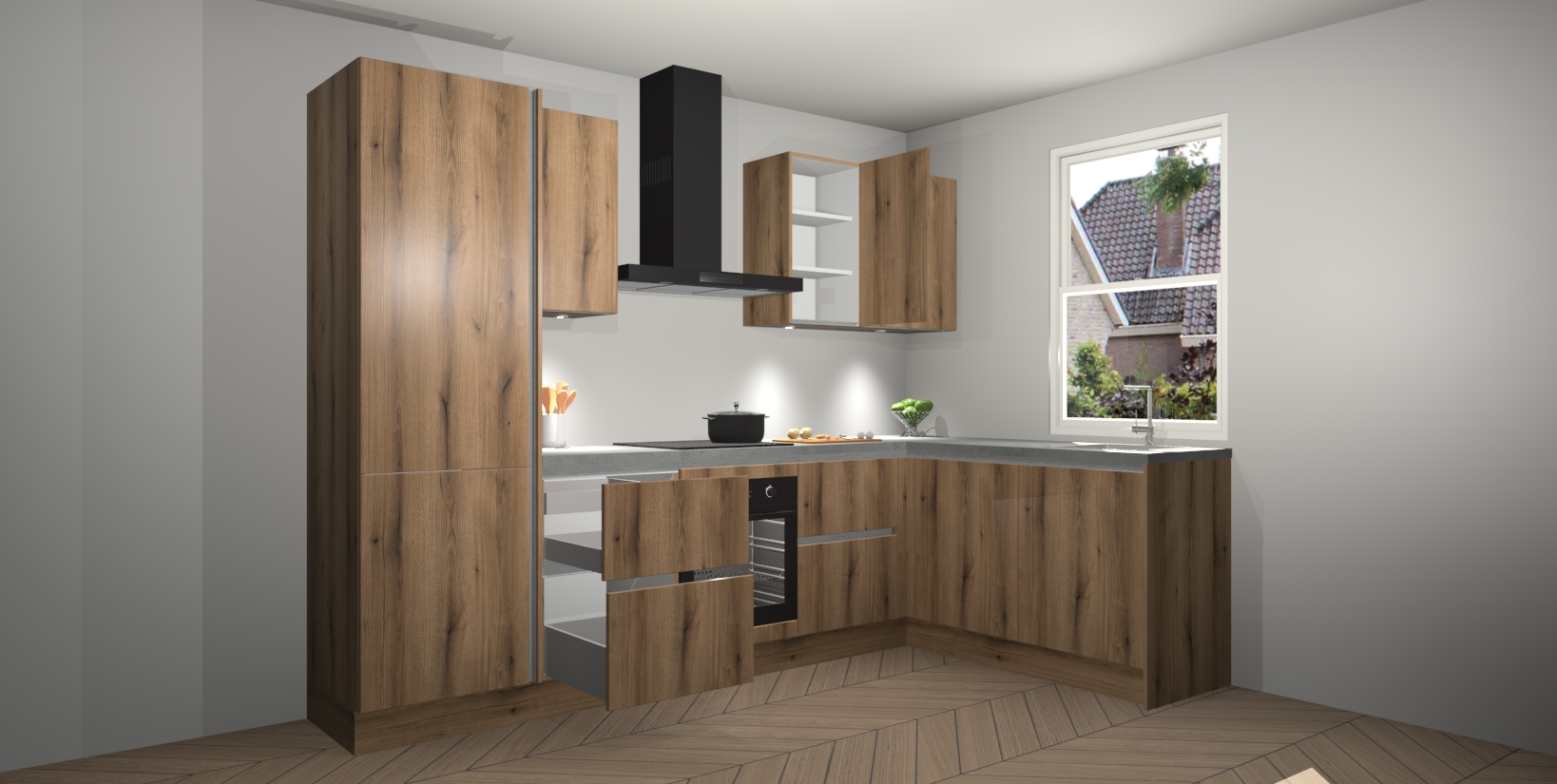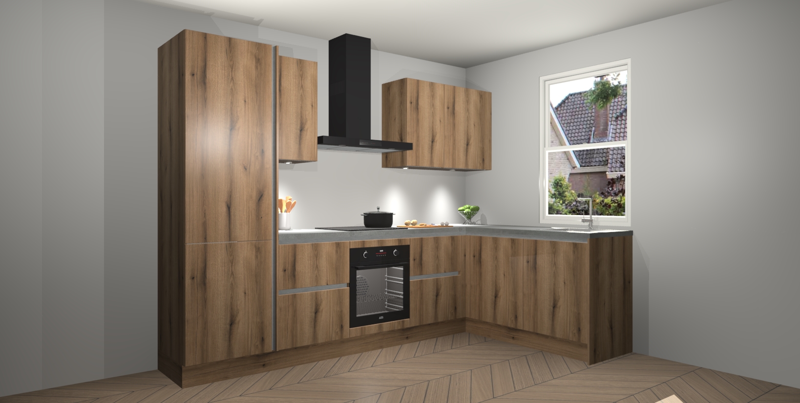 Maak kennis met de trendsettende en luxe Goud Eiken greeploze keuken Bazel! Deze uitzonderlijke keuken van Duitse kwaliteit is stijlvol, modern en perfect om elk huis mee op te fleuren. De binnenkant van de kasten worden meegenomen in een bijpassende kleur om een samenhangende eigentijdse esthetiek te voltooien. U zult dol zijn op hoe uw pas gerenoveerde keuken eruitziet met de Goud Eiken editie!