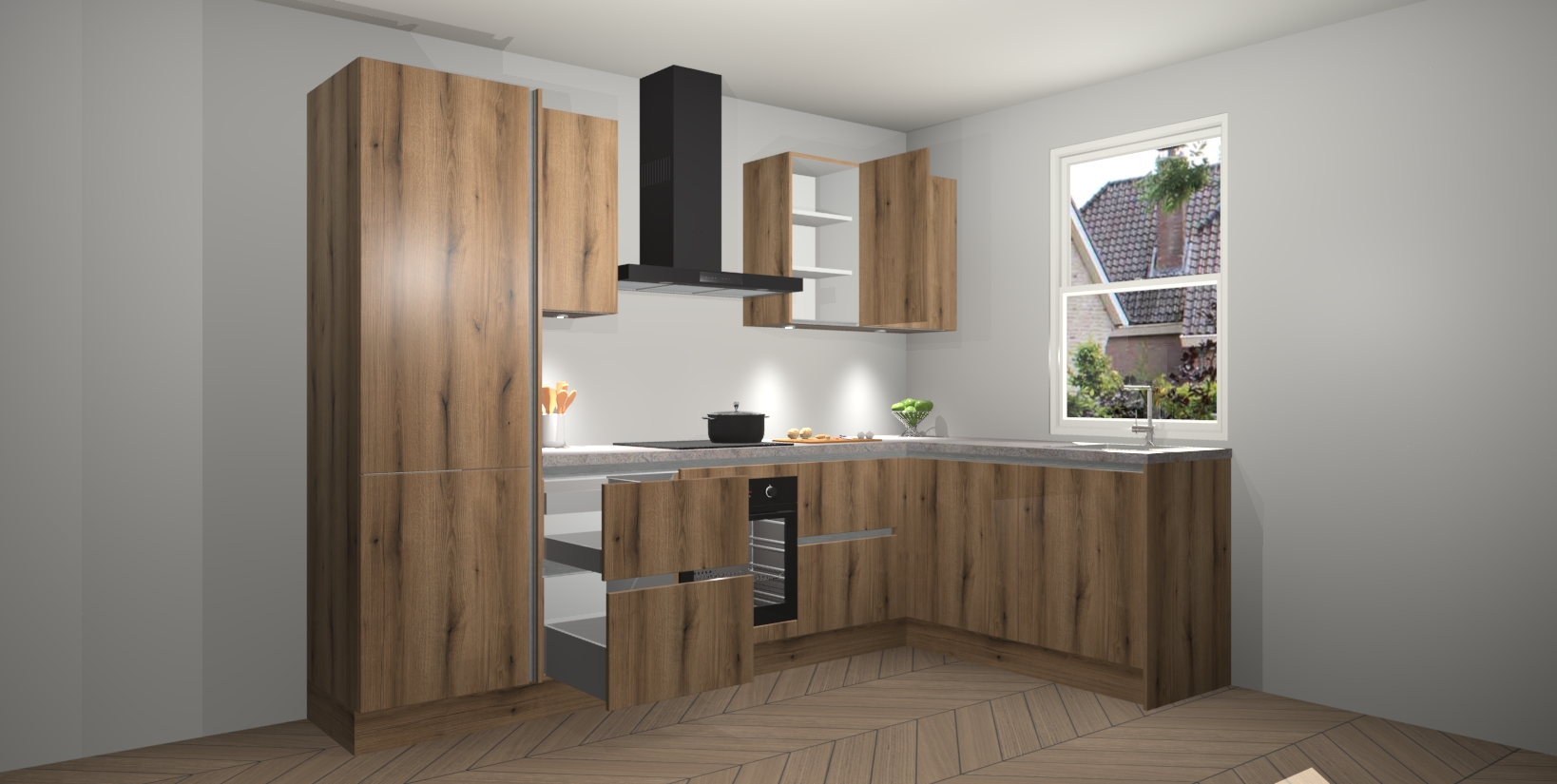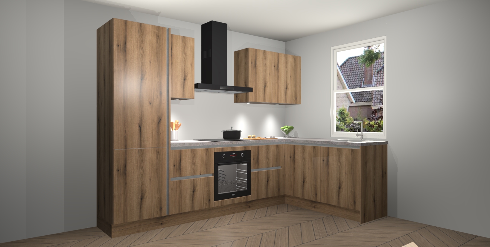 Maak kennis met de trendsettende en luxe Goud Eiken greeploze keuken Bazel! Deze uitzonderlijke keuken van Duitse kwaliteit is stijlvol, modern en perfect om elk huis mee op te fleuren. De binnenkant van de kasten worden meegenomen in een bijpassende kleur om een samenhangende eigentijdse esthetiek te voltooien. U zult dol zijn op hoe uw pas gerenoveerde keuken eruitziet met de Goud Eiken editie!