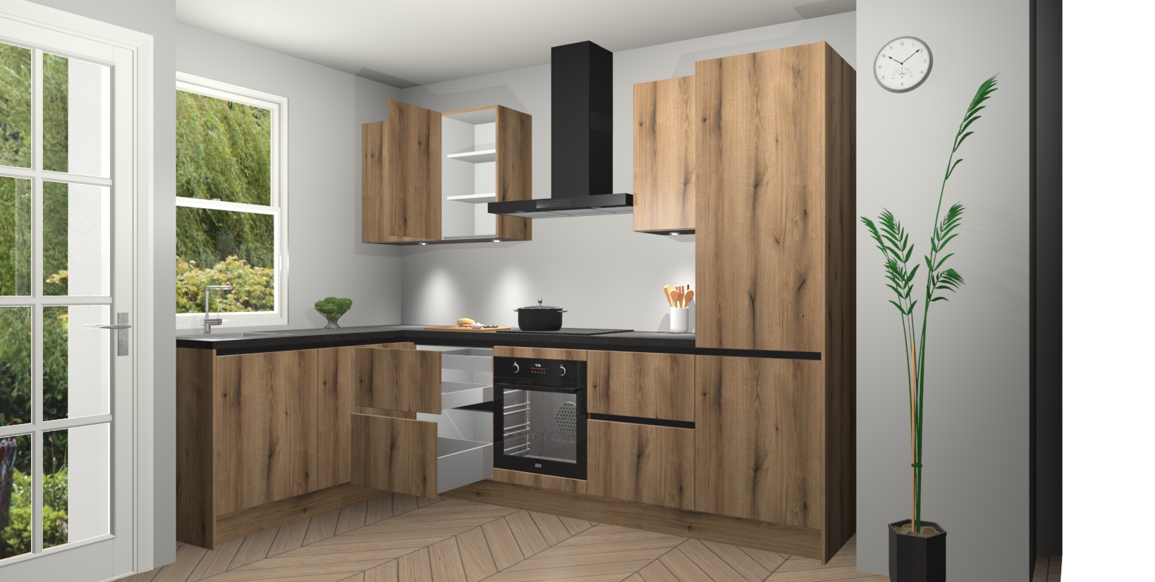 U hoeft zich ook geen zorgen te maken over een gebrek aan opbergruimte, want deze keuken heeft voldoende opbergmogelijkheden zowel boven als onder het aanrecht. Om het leven nog makkelijker te maken, wordt deze moderne hoekkeuken geleverd met 5 ingebouwde apparaten, waaronder een oven, inductiekookplaat, afzuigkap, vaatwasser en koelkast, zodat u in een mum van tijd klaar bent voor actie!
