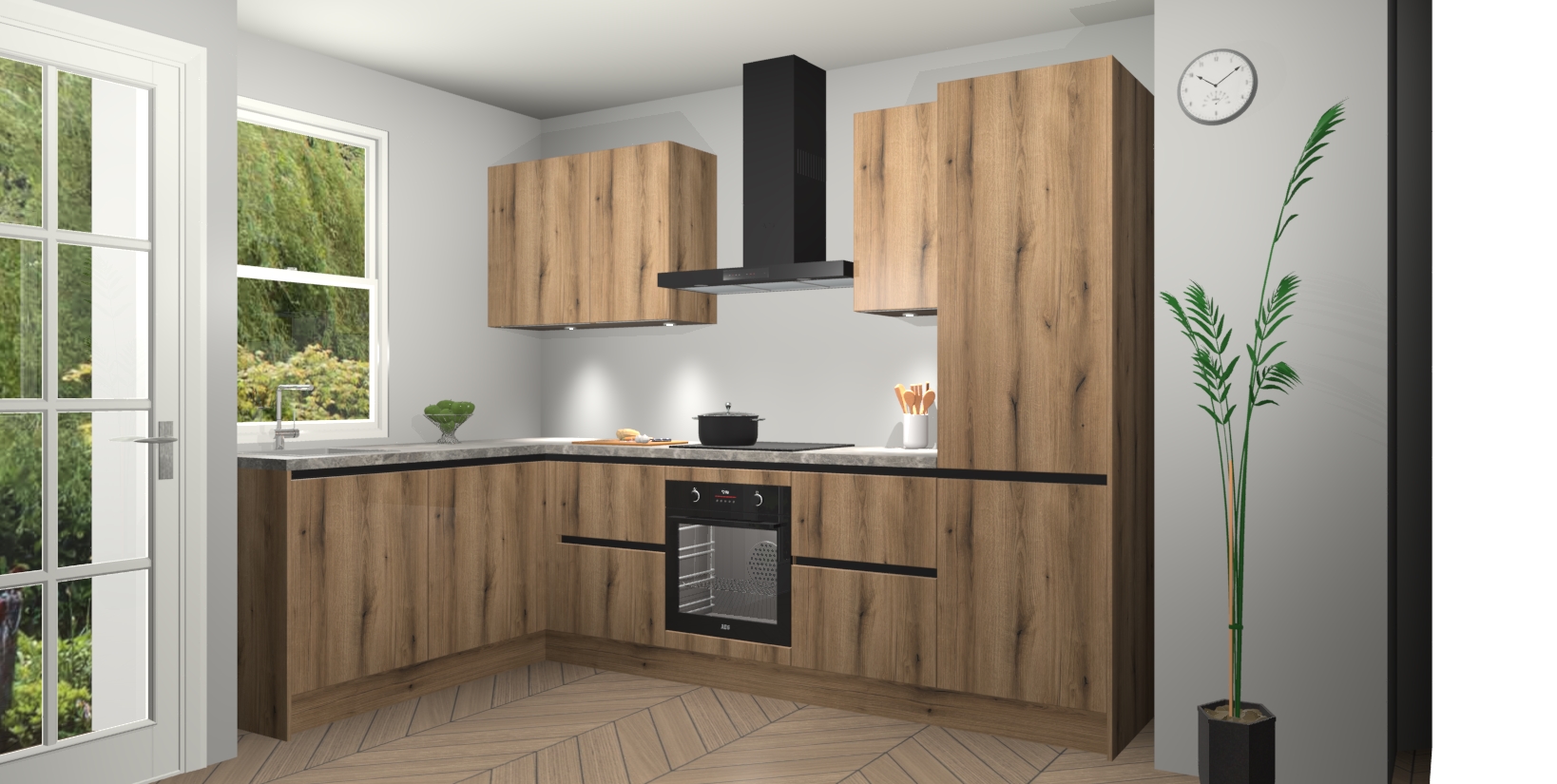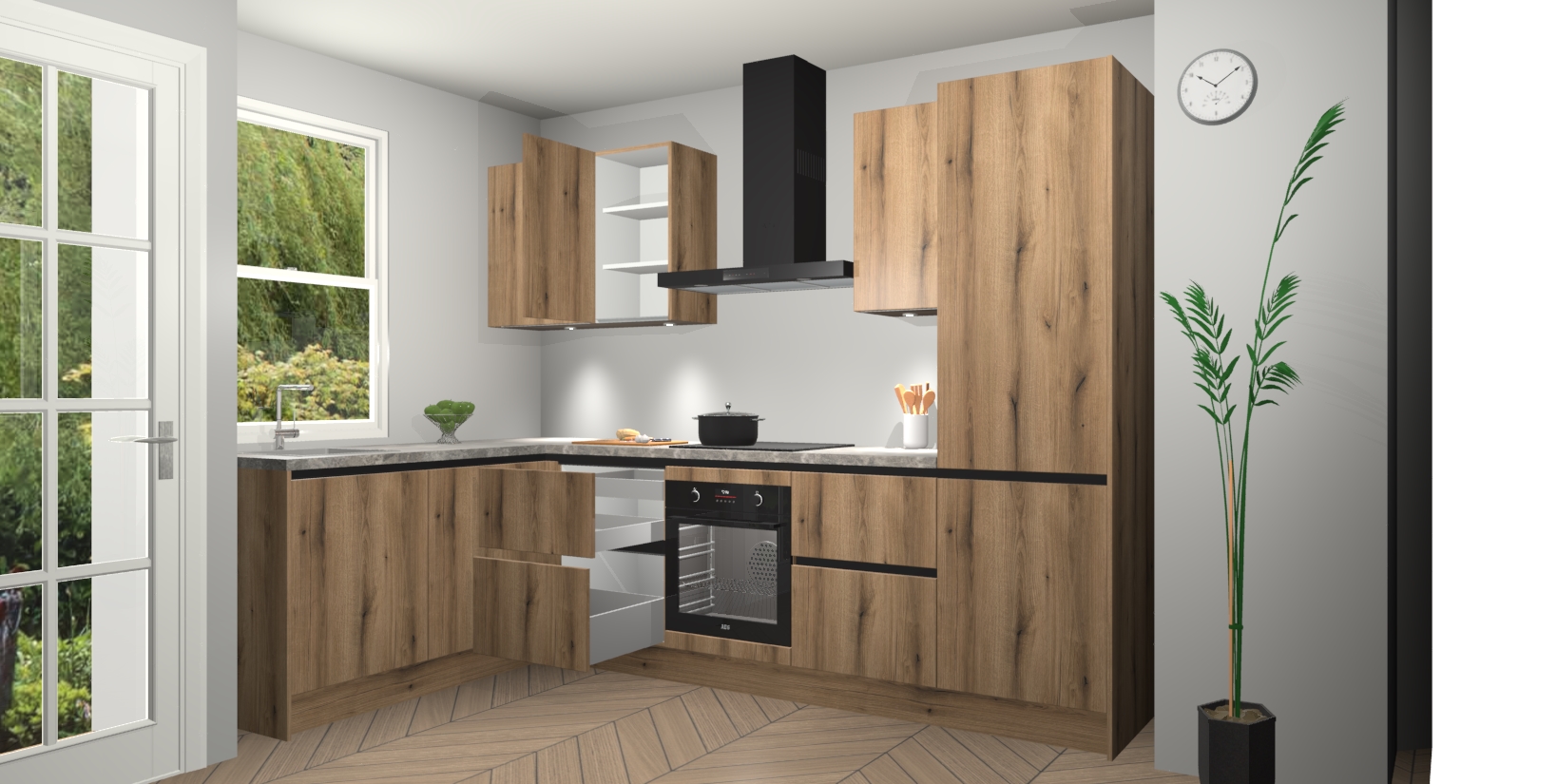 U hoeft zich ook geen zorgen te maken over een gebrek aan opbergruimte, want deze keuken heeft voldoende opbergmogelijkheden zowel boven als onder het aanrecht. Om het leven nog makkelijker te maken, wordt deze moderne hoekkeuken geleverd met 5 ingebouwde apparaten, waaronder een oven, inductiekookplaat, afzuigkap, vaatwasser en koelkast, zodat u in een mum van tijd klaar bent voor actie!