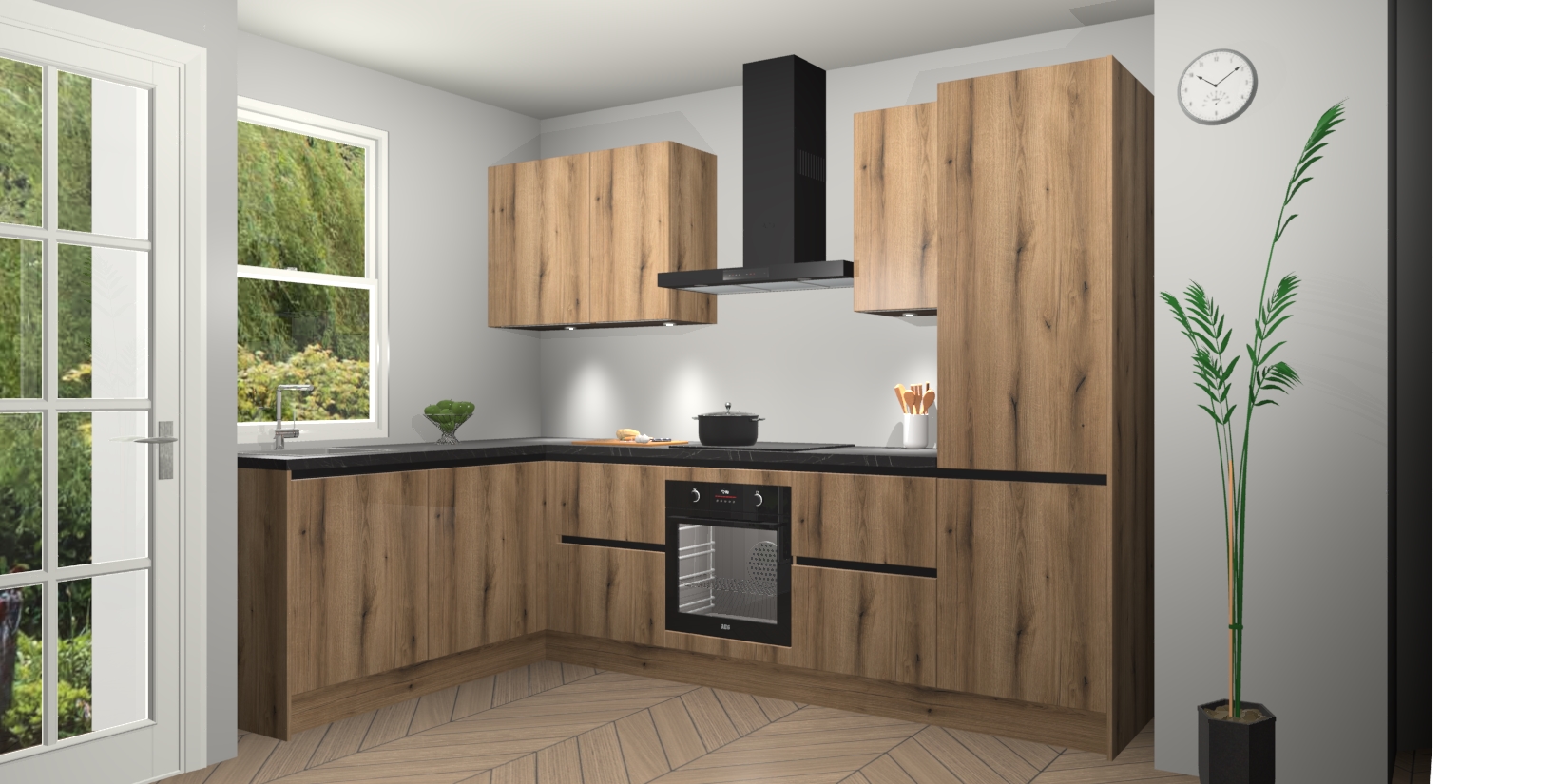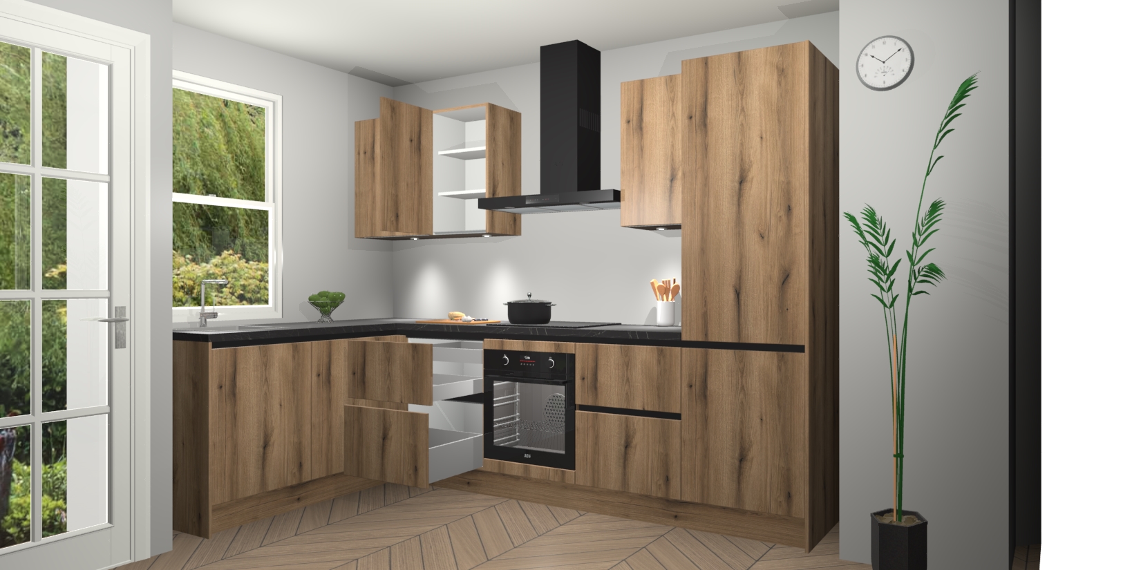 U hoeft zich ook geen zorgen te maken over een gebrek aan opbergruimte, want deze keuken heeft voldoende opbergmogelijkheden zowel boven als onder het aanrecht. Om het leven nog makkelijker te maken, wordt deze moderne hoekkeuken geleverd met 5 ingebouwde apparaten, waaronder een oven, inductiekookplaat, afzuigkap, vaatwasser en koelkast, zodat u in een mum van tijd klaar bent voor actie!