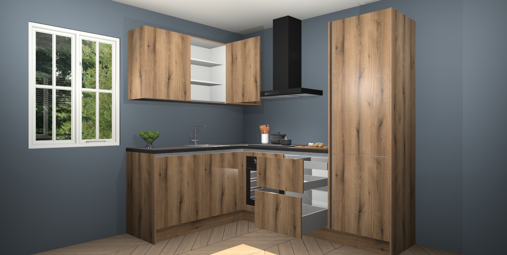 Voor nog meer gemak heeft deze keuken vijf ingebouwde apparaten - oven, inductiekookplaat, afzuigkap, vaatwasser en koelkast. Bovendien hebben alle kasten softclose deuren voor extra comfort bij het sluiten. Dit alles voor een verrassend lage vaste prijs - u vindt nergens anders een betere deal!