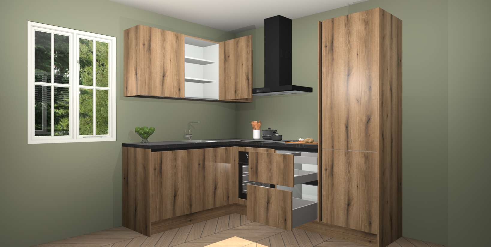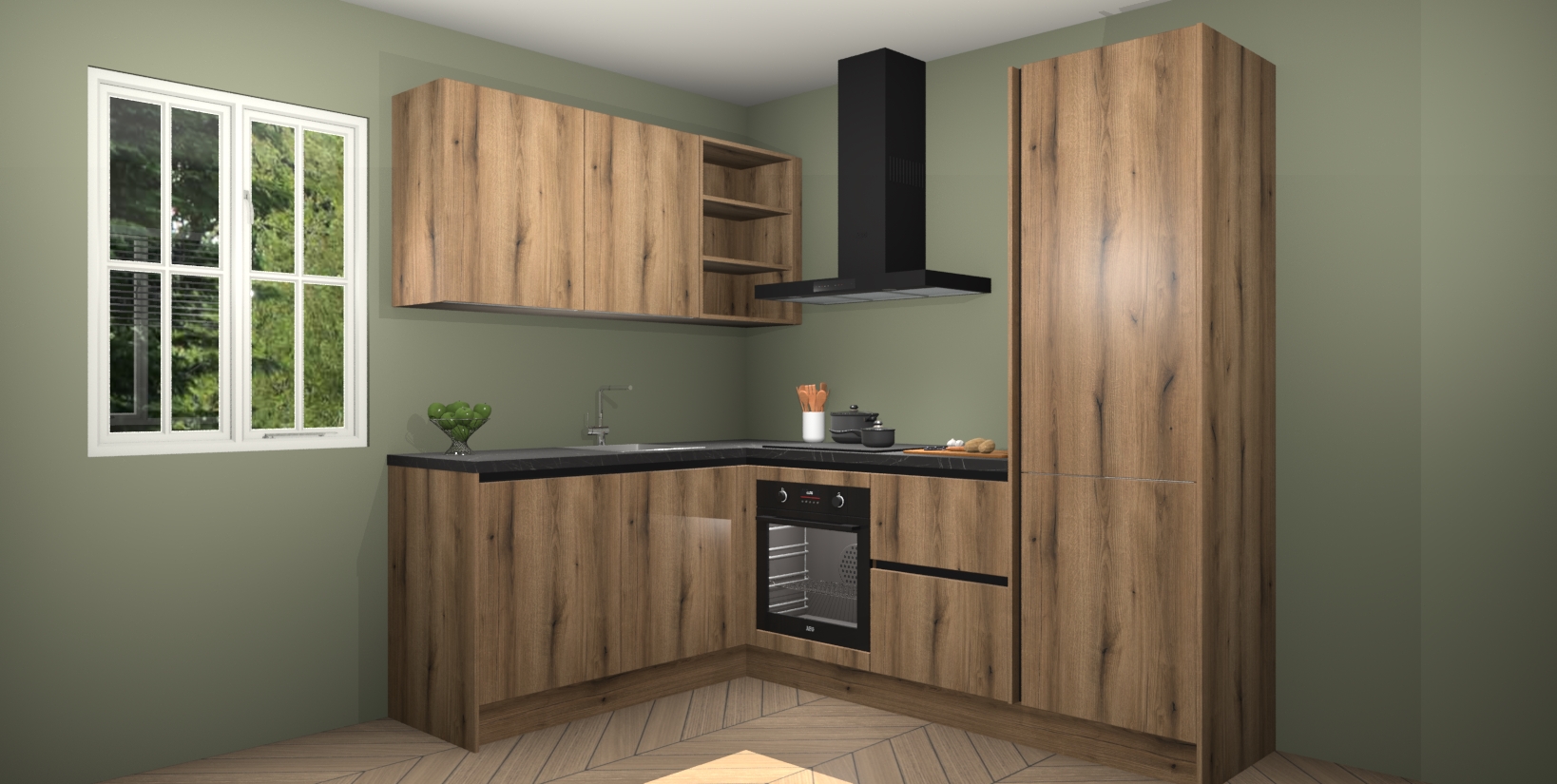 Maak kennis met de Goud Eiken greeploze keuken Boekarest, een moderne hoekkeuken waar al uw vrienden en familie jaloers op zullen zijn! Het verbluffende mooie ontwerp past in elk interieur en is een ideale keuze voor wie op zoek is naar een klassieke, maar verfijnde look.