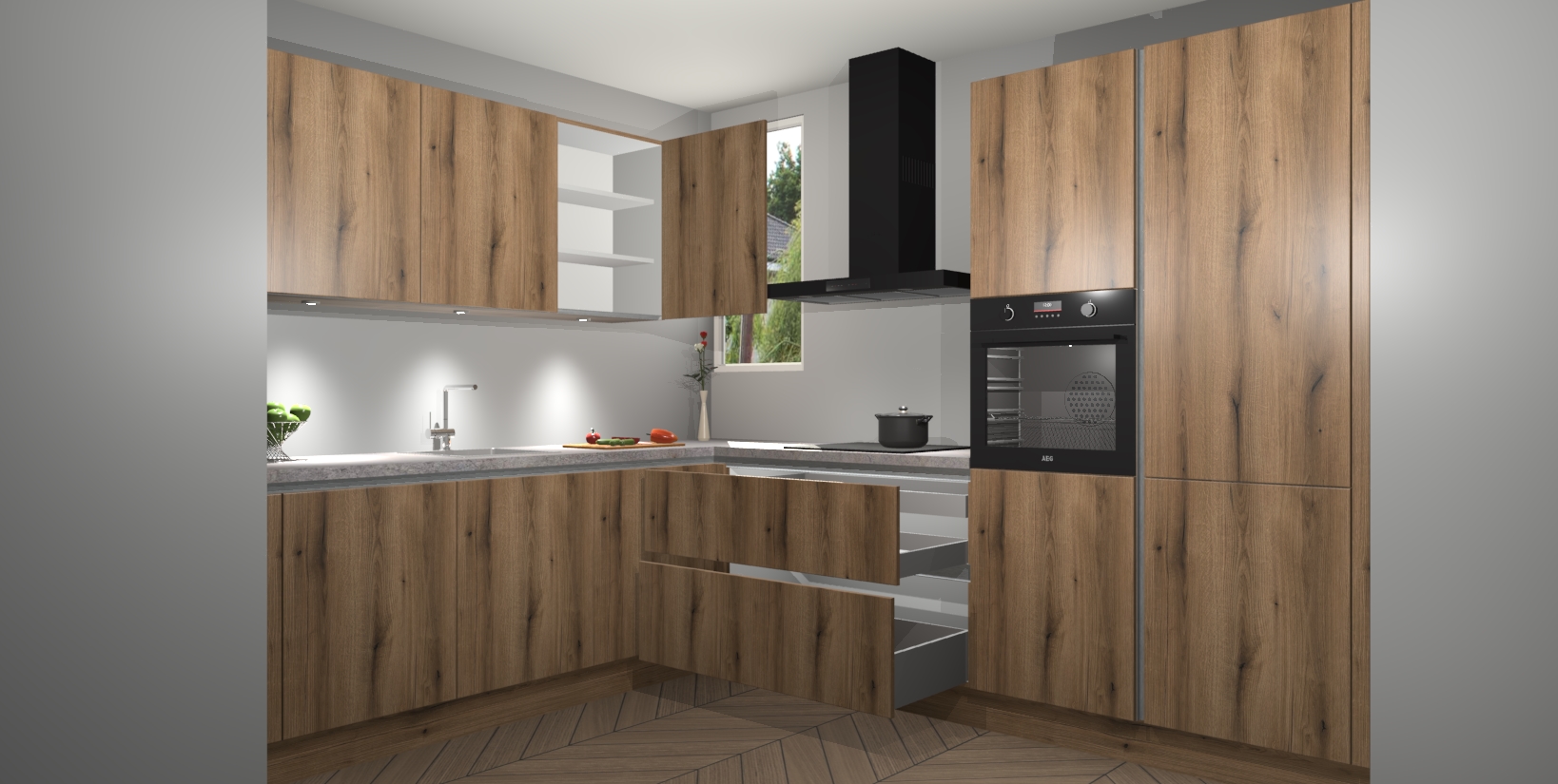 De ruime opbergruimte van dit model maakt het bereiden van voedsel en het gebruik van apparaten snel en gemakkelijk. Het beste van alles is dat het wordt geleverd met vijf inbouwapparaten: een oven, inductiekookplaat, afzuigkap, vaatwasser en koelkast - die allemaal gemakkelijk kunnen worden opgewaardeerd naar AEG na aankoop. Wat de gemaksfactor nog groter maakt, is het feit dat alle cabines voorgemonteerd worden geleverd, zodat u er meteen mee aan de slag kunt!