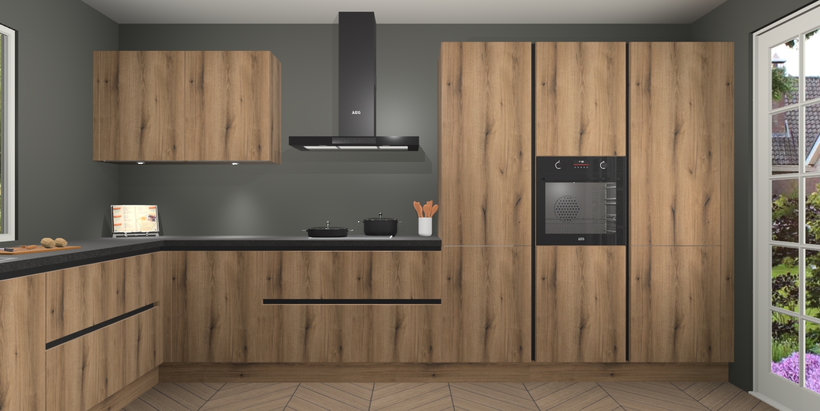 Heeft u nog apparatuur nodig? Geen probleem: de Goud Eiken greeploze keuken Debrecen bevat vijf ingebouwde apparaten - een oven, inductiekookplaat, afzuigkap, vaatwasser en koelkast - die gemakkelijk kunnen worden bijgewerkt naar AEG na bestelling. En als dat nog niet genoeg is; onze kasten worden pre-geassembleerd geleverd en zijn verkrijgbaar tegen een vastgeroeste lage prijs! U hoeft nooit meer te zoeken naar goede kwaliteit en service want onze producten hebben echt Duitse kwaliteit.