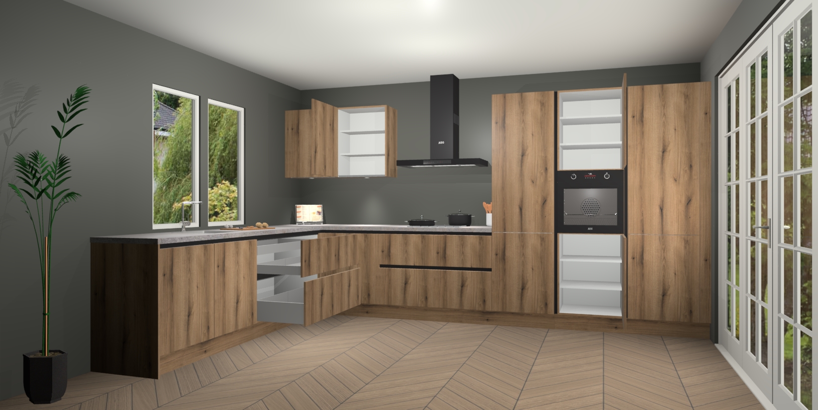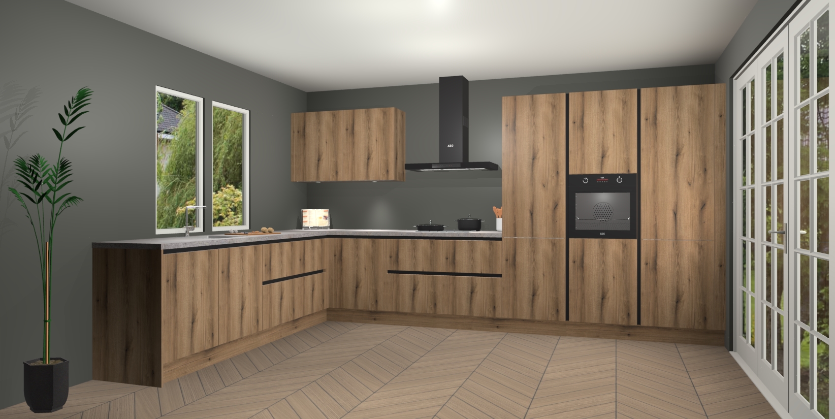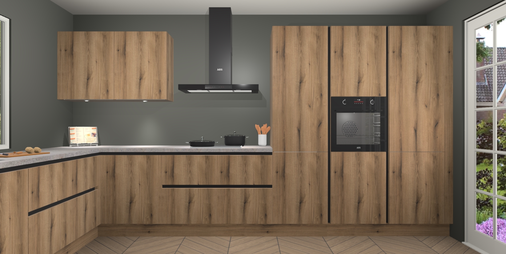 Heeft u nog apparatuur nodig? Geen probleem: de Goud Eiken greeploze keuken Debrecen bevat vijf ingebouwde apparaten - een oven, inductiekookplaat, afzuigkap, vaatwasser en koelkast - die gemakkelijk kunnen worden bijgewerkt naar AEG na bestelling. En als dat nog niet genoeg is; onze kasten worden pre-geassembleerd geleverd en zijn verkrijgbaar tegen een vastgeroeste lage prijs! U hoeft nooit meer te zoeken naar goede kwaliteit en service want onze producten hebben echt Duitse kwaliteit.