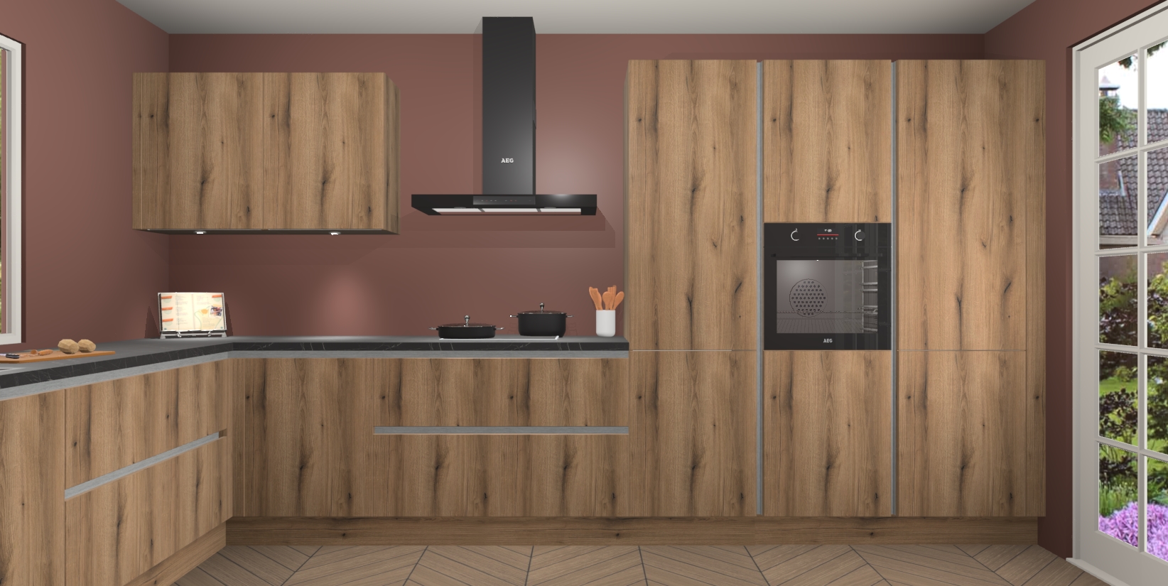 Heeft u nog apparatuur nodig? Geen probleem: de Goud Eiken greeploze keuken Debrecen bevat vijf ingebouwde apparaten - een oven, inductiekookplaat, afzuigkap, vaatwasser en koelkast - die gemakkelijk kunnen worden bijgewerkt naar AEG na bestelling. En als dat nog niet genoeg is; onze kasten worden pre-geassembleerd geleverd en zijn verkrijgbaar tegen een vastgeroeste lage prijs! U hoeft nooit meer te zoeken naar goede kwaliteit en service want onze producten hebben echt Duitse kwaliteit.