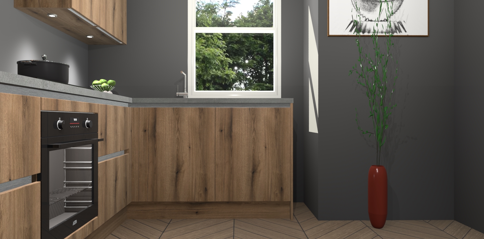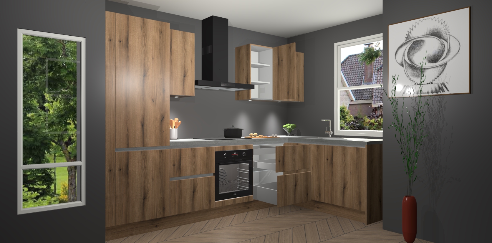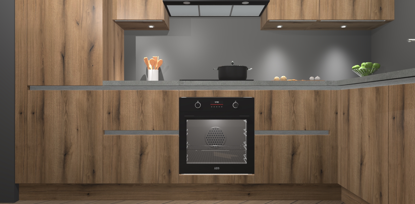 De Goud Eiken greeploze keuken Geneve is uitgerust met 5 inbouwapparaten - een oven, inductiekookplaat, afzuigkap, vaatwasser en koelkast - voor al uw kook- en bewaarbehoeftes. U kunt deze apparaten desgewenst eenvoudig upgraden naar AEG of de oven omruilen voor een combimagnetron na het plaatsen van uw bestelling. En met de soft close deuren, voldoende opbergruimte en kasten die voorgemonteerd worden geleverd, bent u in een mum van tijd klaar om heerlijke maaltijden te bereiden!