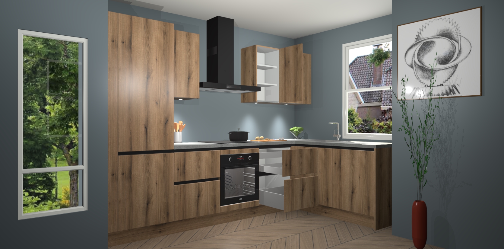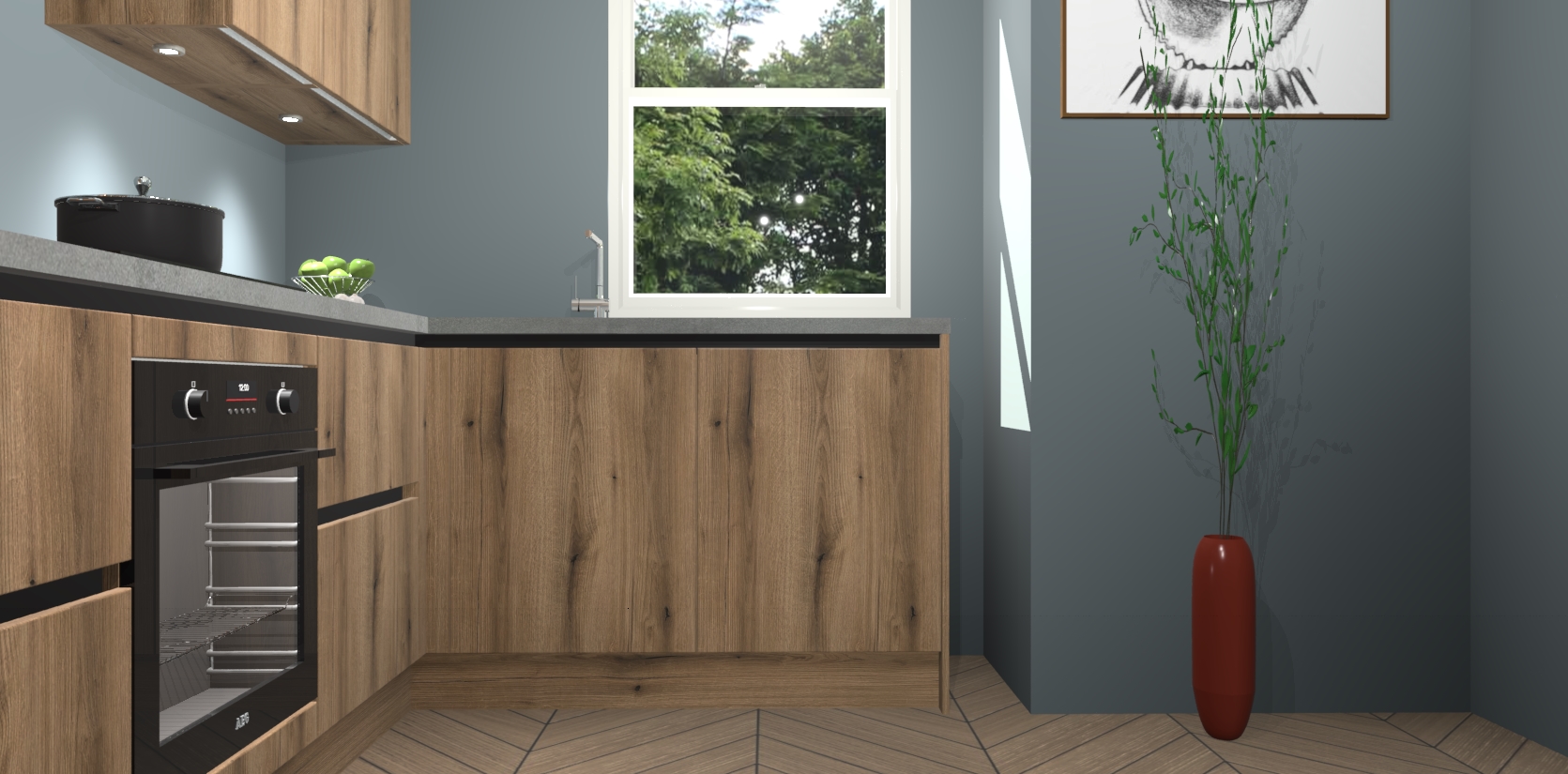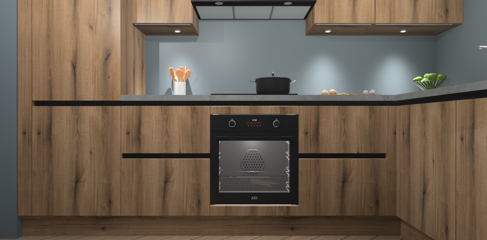 De Goud Eiken greeploze keuken Geneve is uitgerust met 5 inbouwapparaten - een oven, inductiekookplaat, afzuigkap, vaatwasser en koelkast - voor al uw kook- en bewaarbehoeftes. U kunt deze apparaten desgewenst eenvoudig upgraden naar AEG of de oven omruilen voor een combimagnetron na het plaatsen van uw bestelling. En met de soft close deuren, voldoende opbergruimte en kasten die voorgemonteerd worden geleverd, bent u in een mum van tijd klaar om heerlijke maaltijden te bereiden!