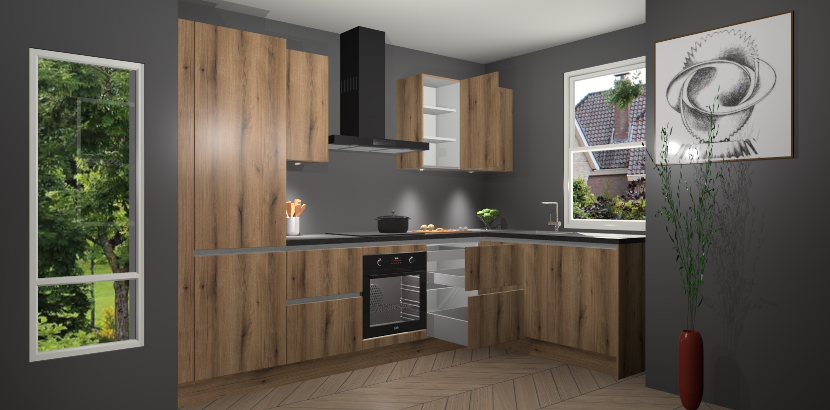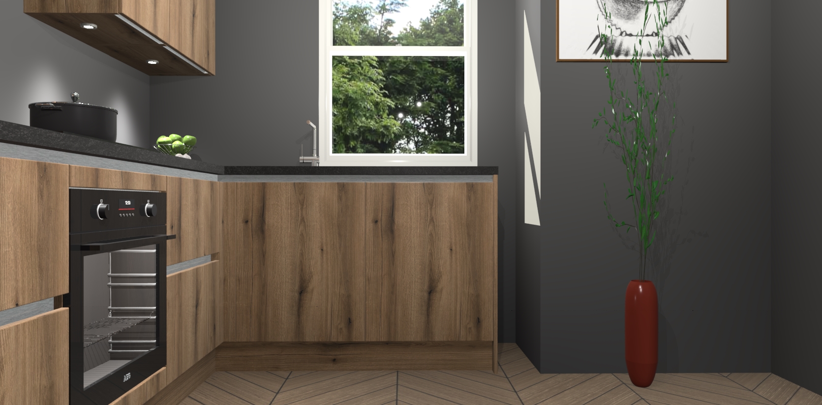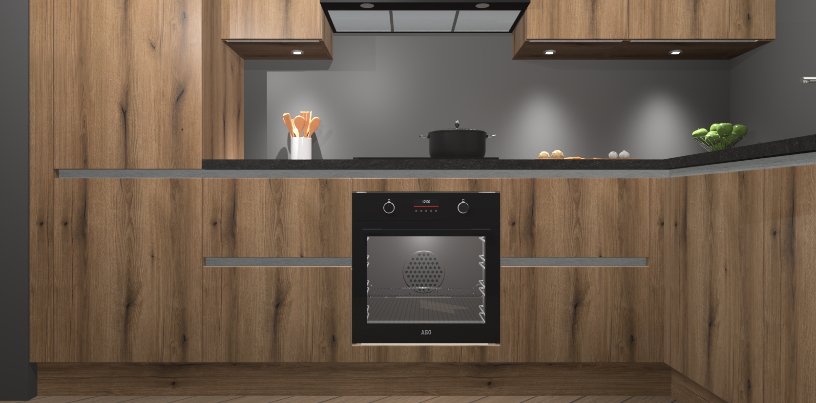 De Goud Eiken greeploze keuken Geneve is uitgerust met 5 inbouwapparaten - een oven, inductiekookplaat, afzuigkap, vaatwasser en koelkast - voor al uw kook- en bewaarbehoeftes. U kunt deze apparaten desgewenst eenvoudig upgraden naar AEG of de oven omruilen voor een combimagnetron na het plaatsen van uw bestelling. En met de soft close deuren, voldoende opbergruimte en kasten die voorgemonteerd worden geleverd, bent u in een mum van tijd klaar om heerlijke maaltijden te bereiden!