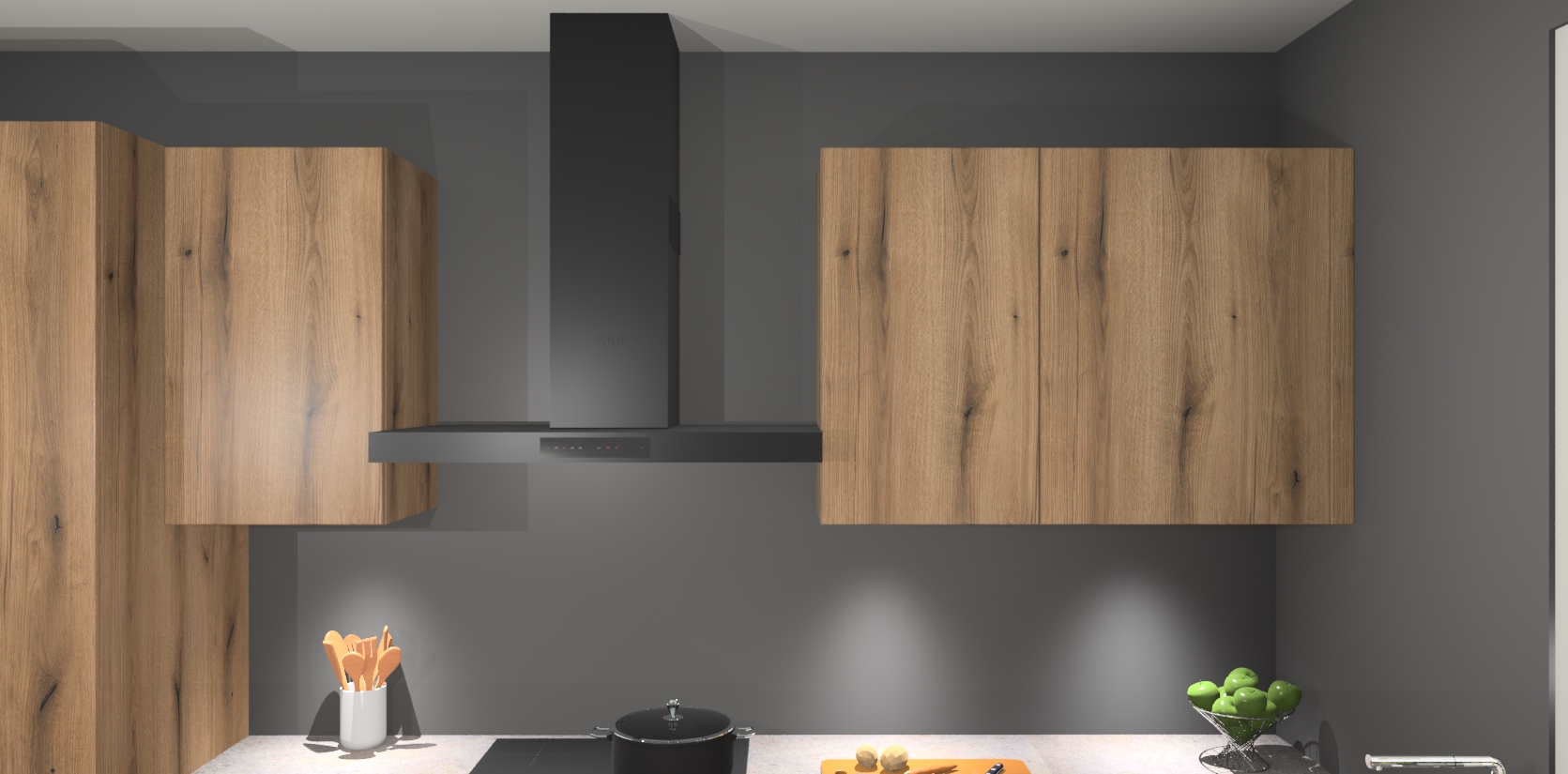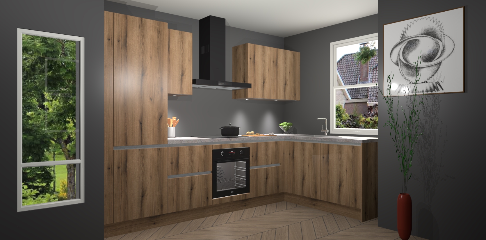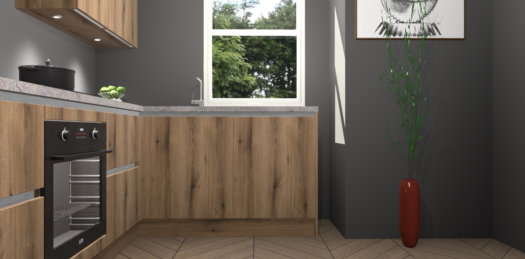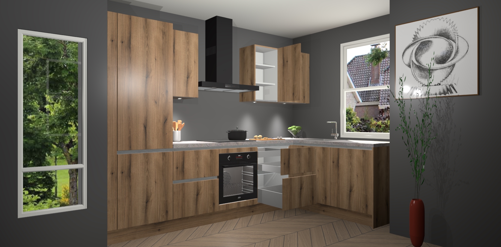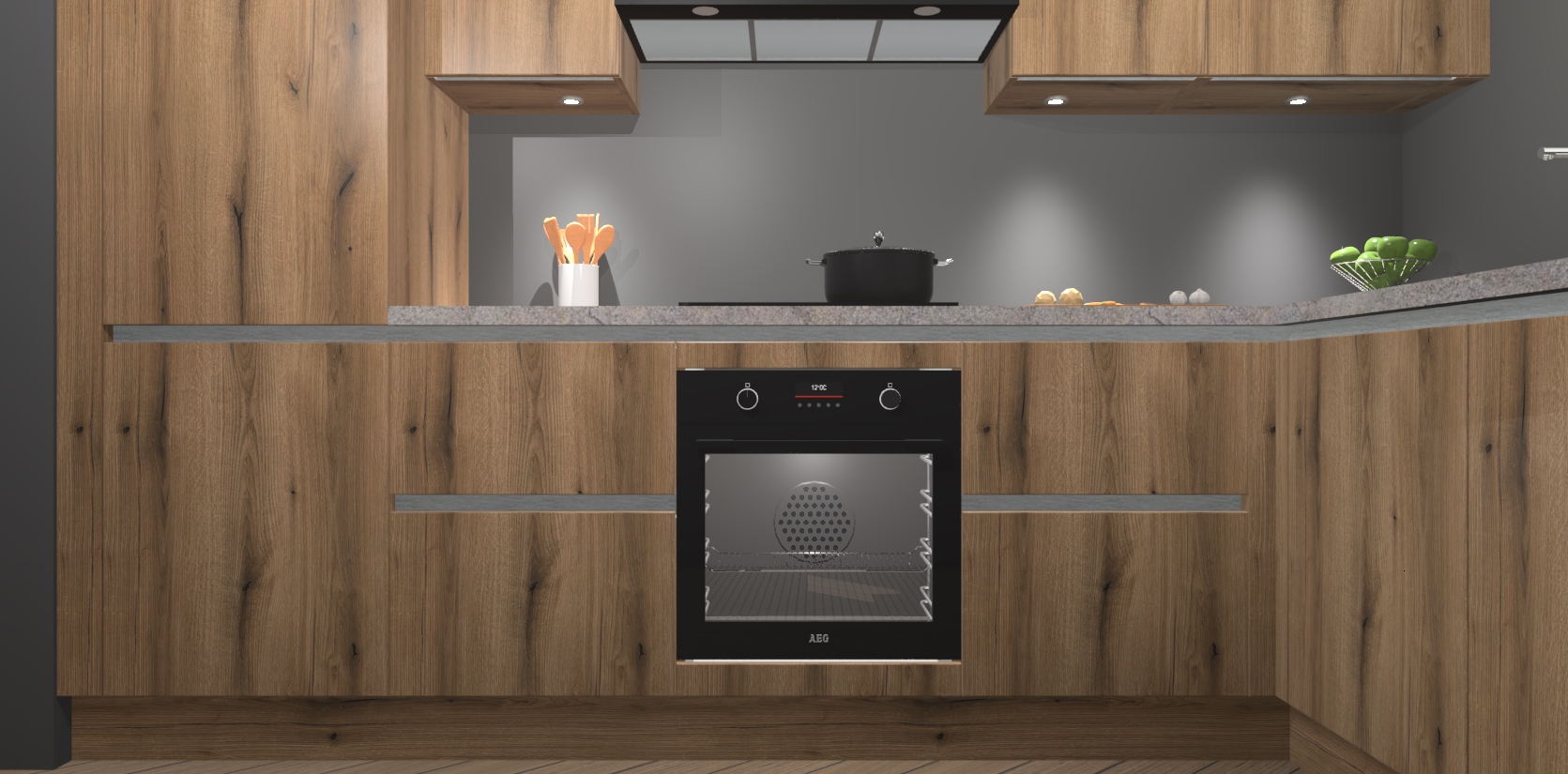 De Goud Eiken greeploze keuken Geneve is uitgerust met 5 inbouwapparaten - een oven, inductiekookplaat, afzuigkap, vaatwasser en koelkast - voor al uw kook- en bewaarbehoeftes. U kunt deze apparaten desgewenst eenvoudig upgraden naar AEG of de oven omruilen voor een combimagnetron na het plaatsen van uw bestelling. En met de soft close deuren, voldoende opbergruimte en kasten die voorgemonteerd worden geleverd, bent u in een mum van tijd klaar om heerlijke maaltijden te bereiden!
