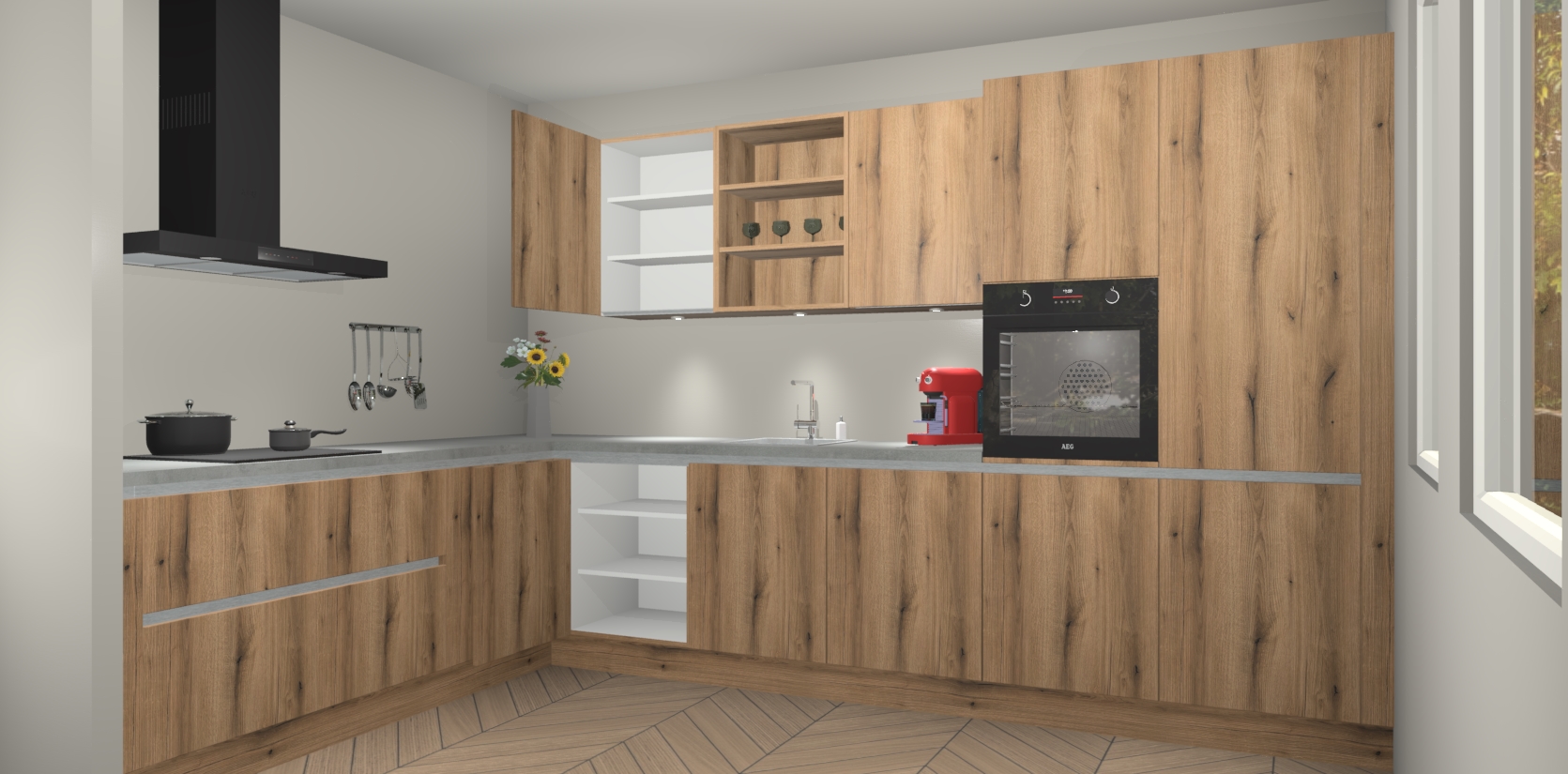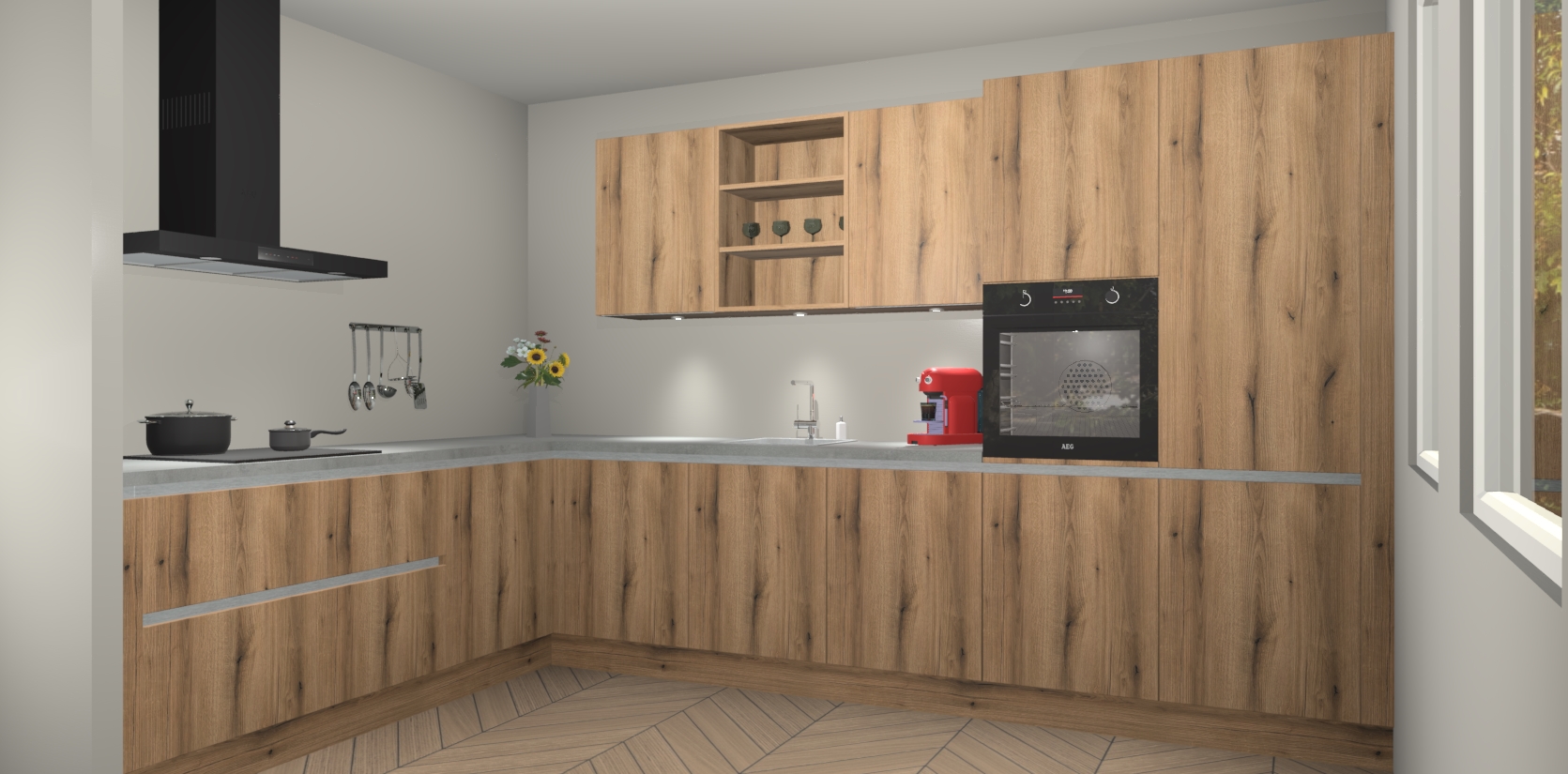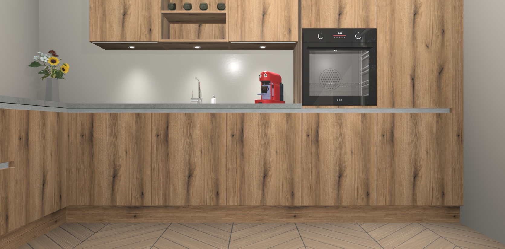 De Goud Eiken greeploze keuken Gotenburg is zo ontworpen dat u alle mogelijke vormen van opslagruimte kunt genieten. Bovendien heeft u meteen toegang tot vijf ingebouwde apparaten: een oven, inductiekookplaat, afzuigkap, vaatwasser en koelkast. Gewoon upgraden naar AEG na bestelling? Dit kan heel gemakkelijk worden geregeld. De deuren sluiten zacht dankzij zachtsluitende scharnieren en ze houden warmte vast terwijl ze uitzonderlijk stil blijven wanneer ze worden geopend of gesloten.