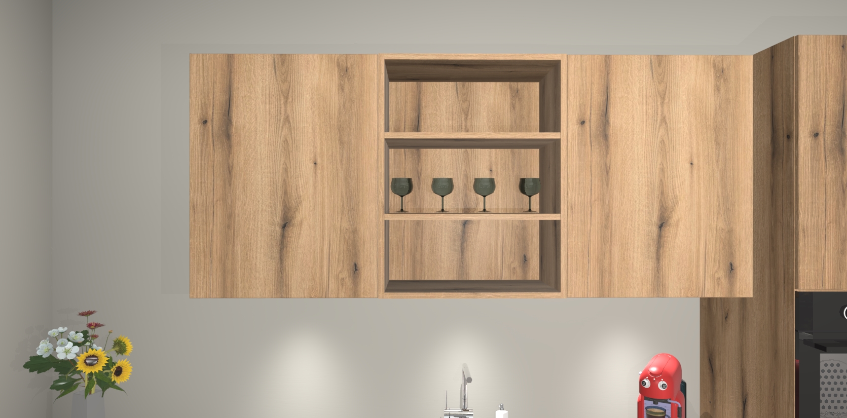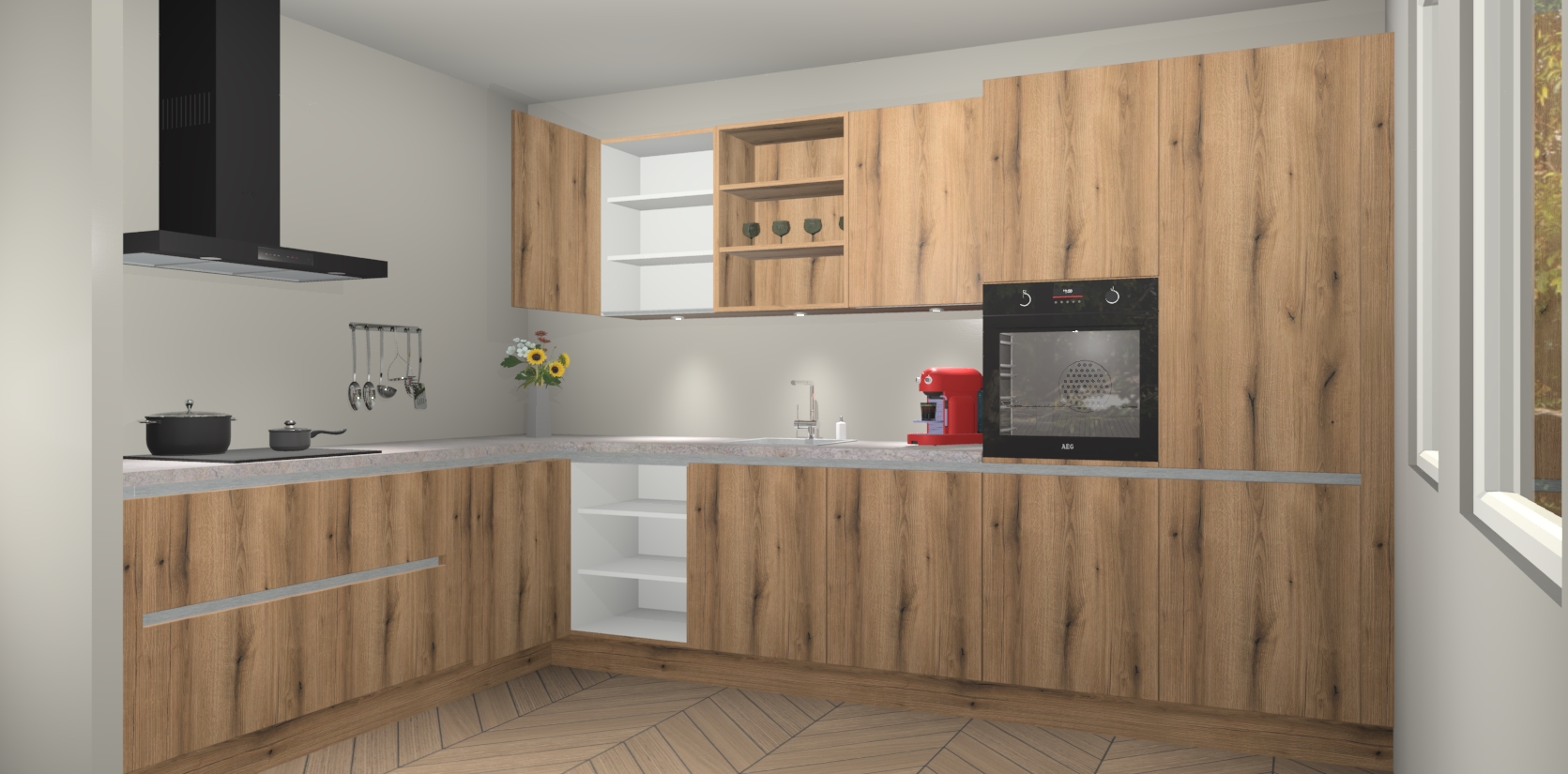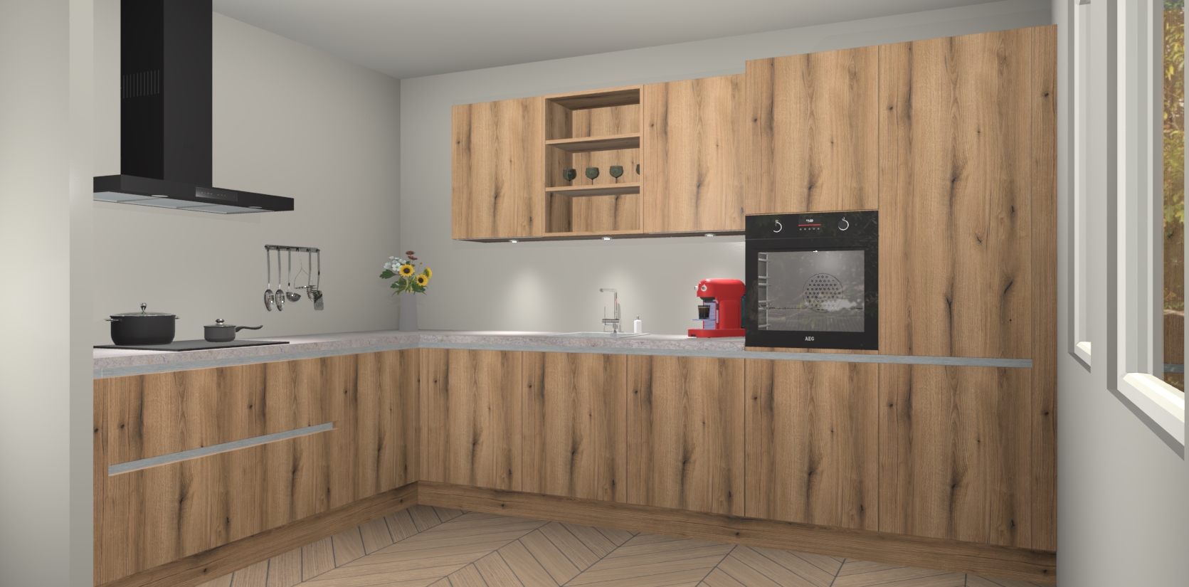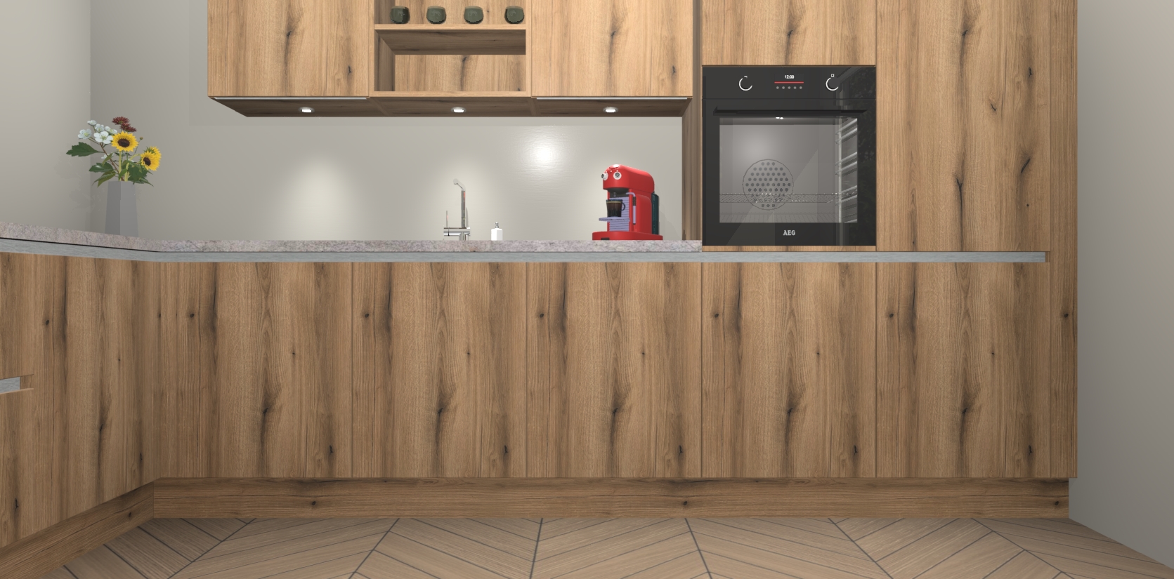 De Goud Eiken greeploze keuken Gotenburg is zo ontworpen dat u alle mogelijke vormen van opslagruimte kunt genieten. Bovendien heeft u meteen toegang tot vijf ingebouwde apparaten: een oven, inductiekookplaat, afzuigkap, vaatwasser en koelkast. Gewoon upgraden naar AEG na bestelling? Dit kan heel gemakkelijk worden geregeld. De deuren sluiten zacht dankzij zachtsluitende scharnieren en ze houden warmte vast terwijl ze uitzonderlijk stil blijven wanneer ze worden geopend of gesloten.