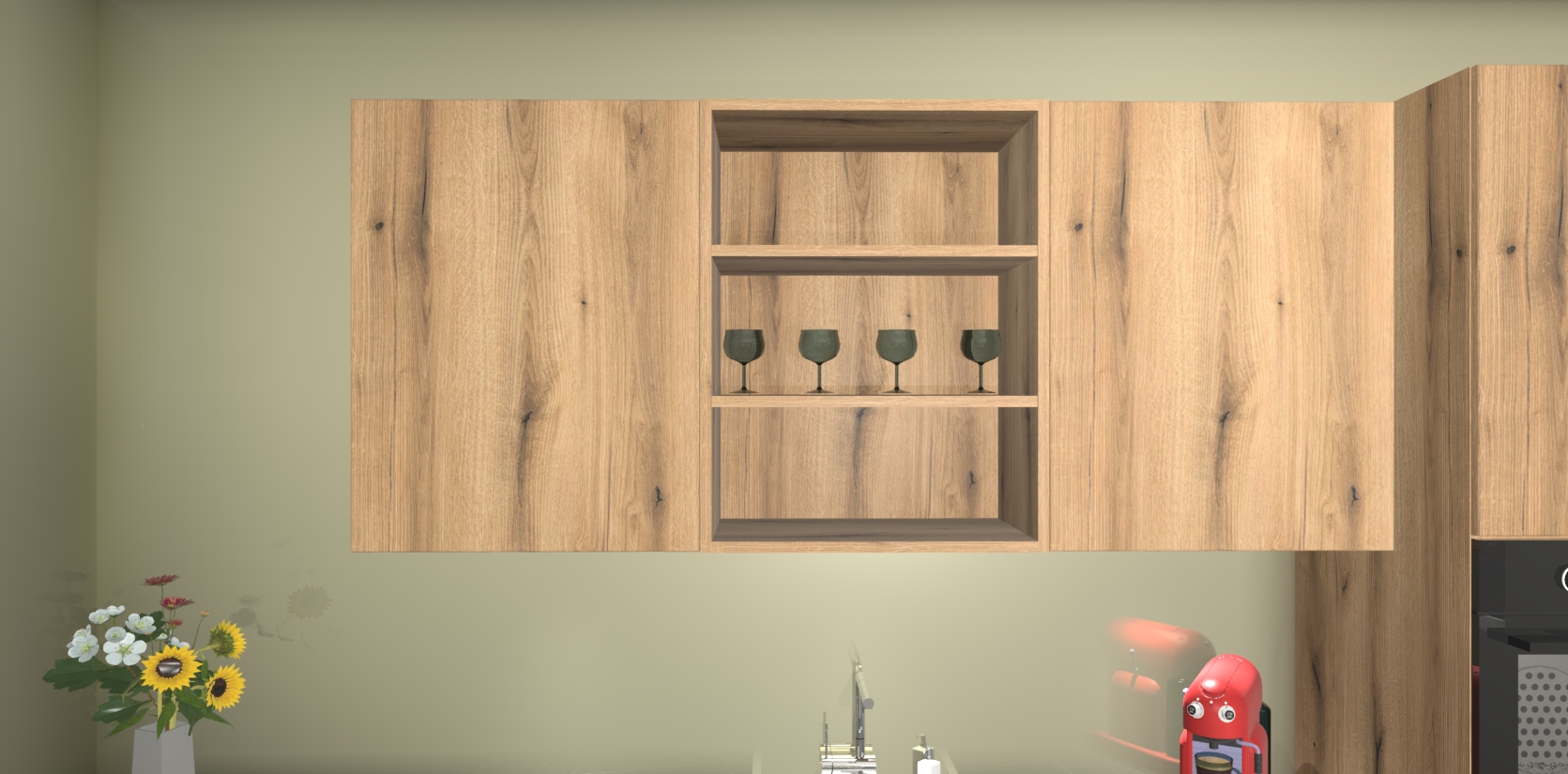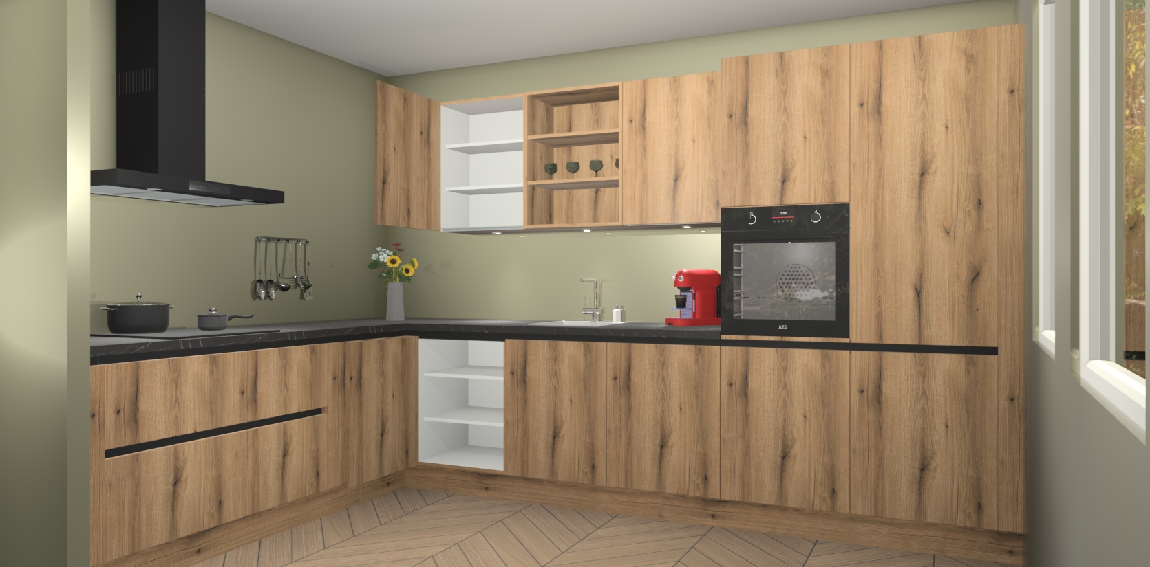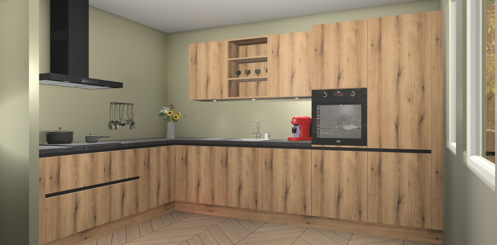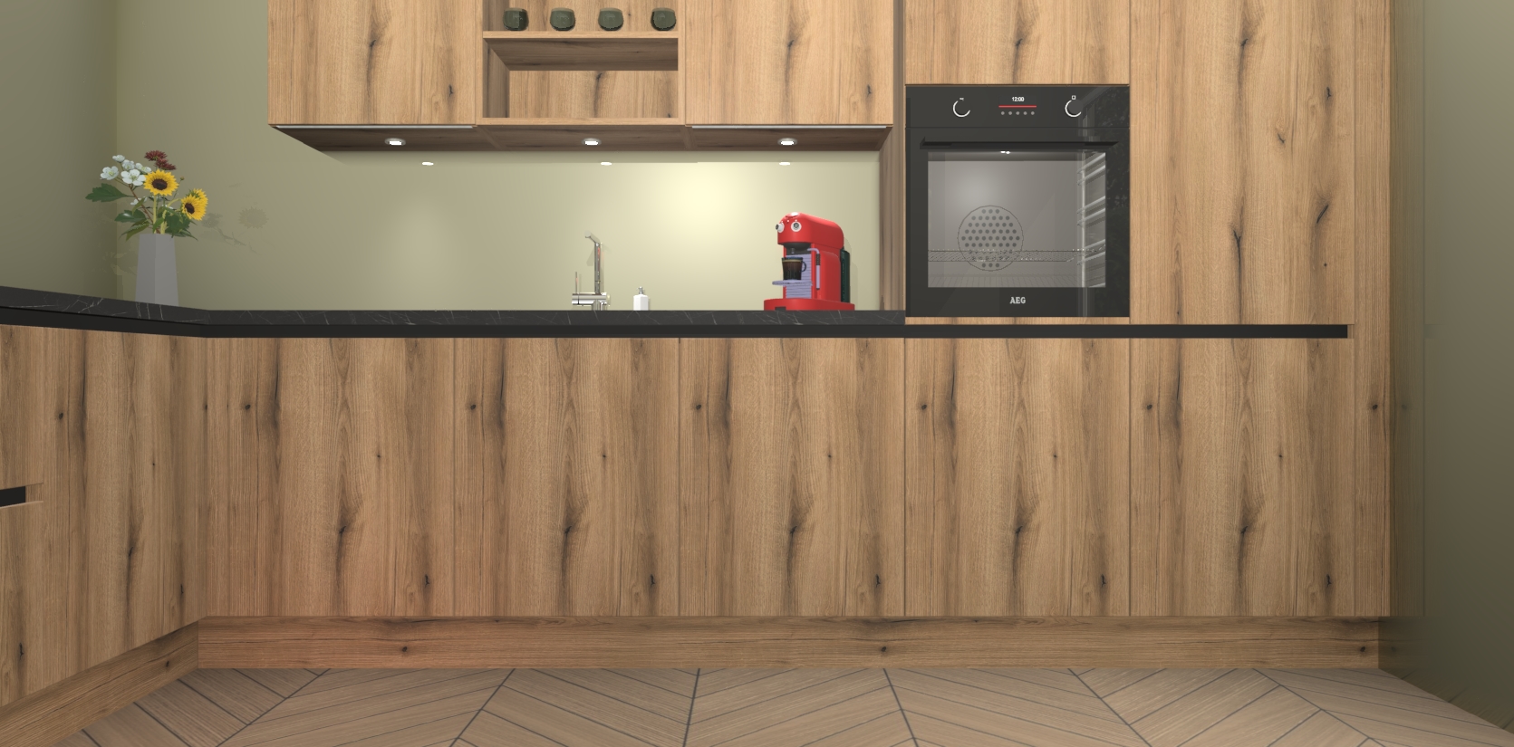 De Goud Eiken greeploze keuken Gotenburg is zo ontworpen dat u alle mogelijke vormen van opslagruimte kunt genieten. Bovendien heeft u meteen toegang tot vijf ingebouwde apparaten: een oven, inductiekookplaat, afzuigkap, vaatwasser en koelkast. Gewoon upgraden naar AEG na bestelling? Dit kan heel gemakkelijk worden geregeld. De deuren sluiten zacht dankzij zachtsluitende scharnieren en ze houden warmte vast terwijl ze uitzonderlijk stil blijven wanneer ze worden geopend of gesloten.