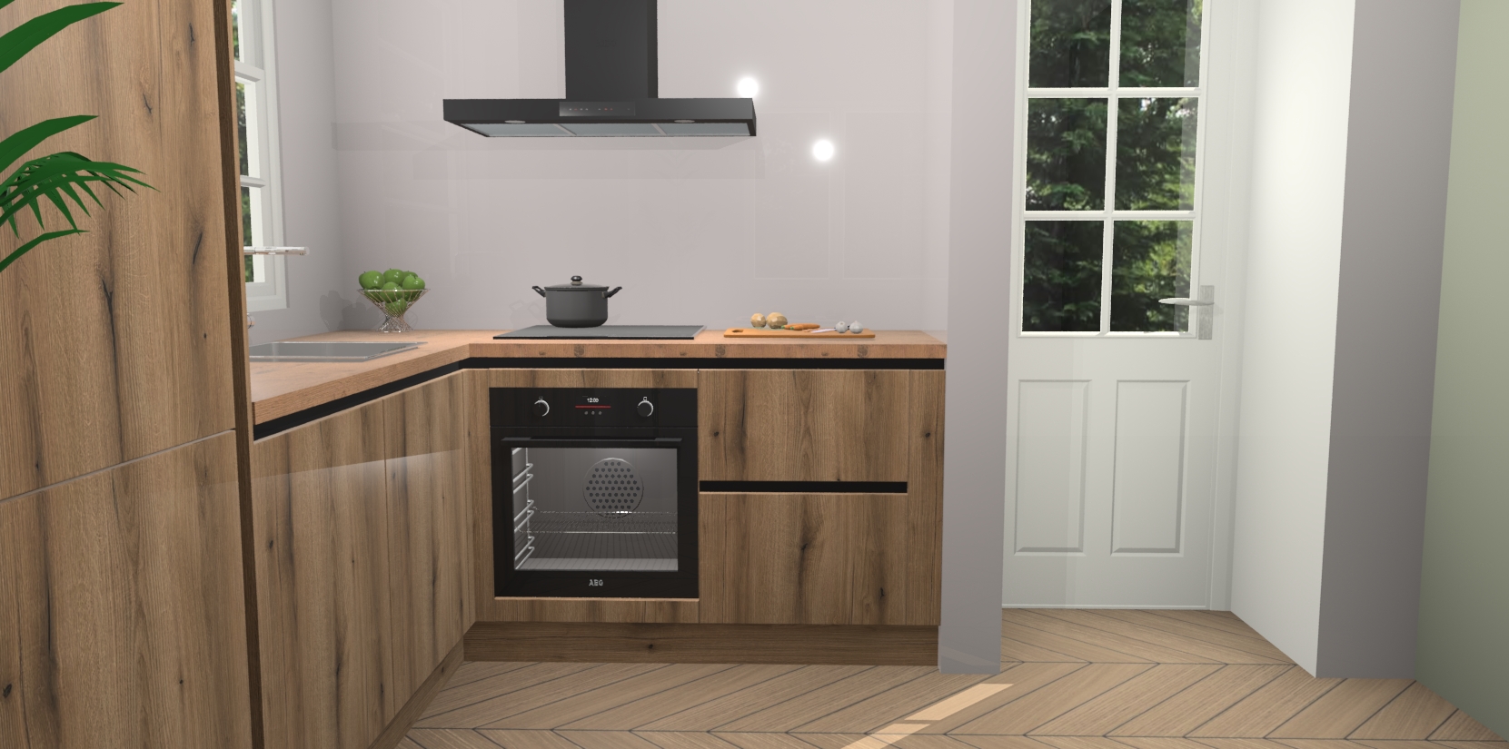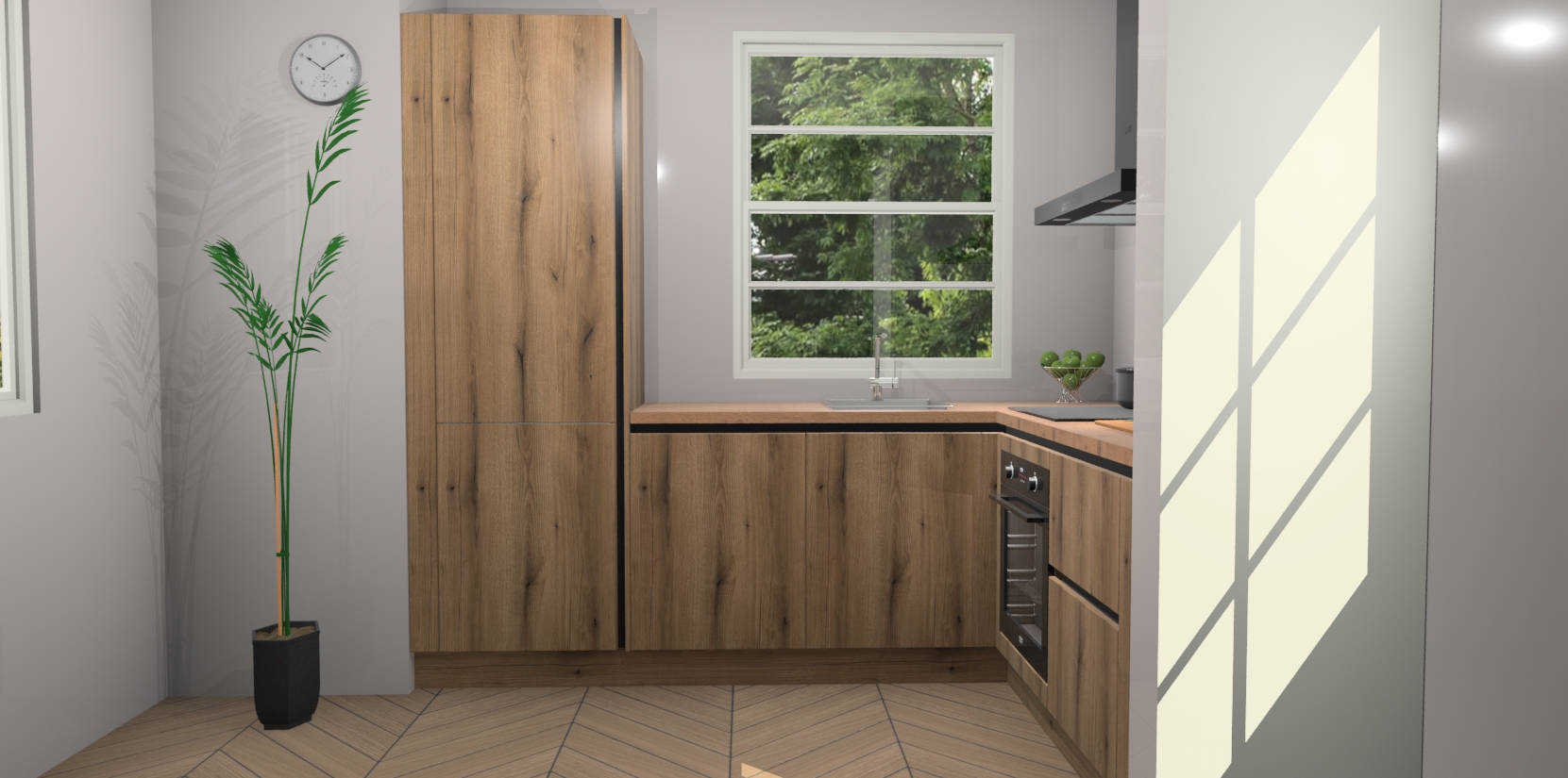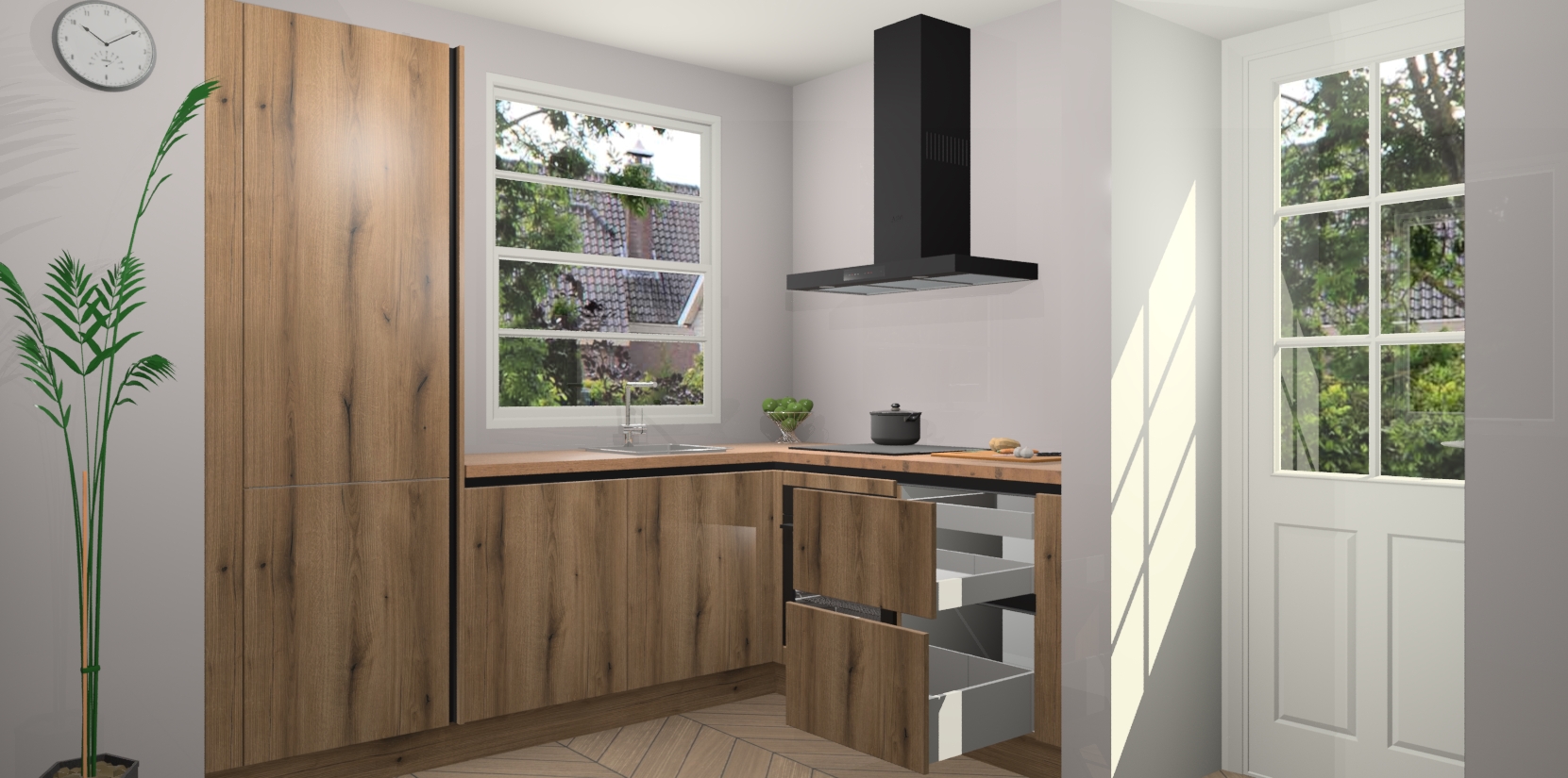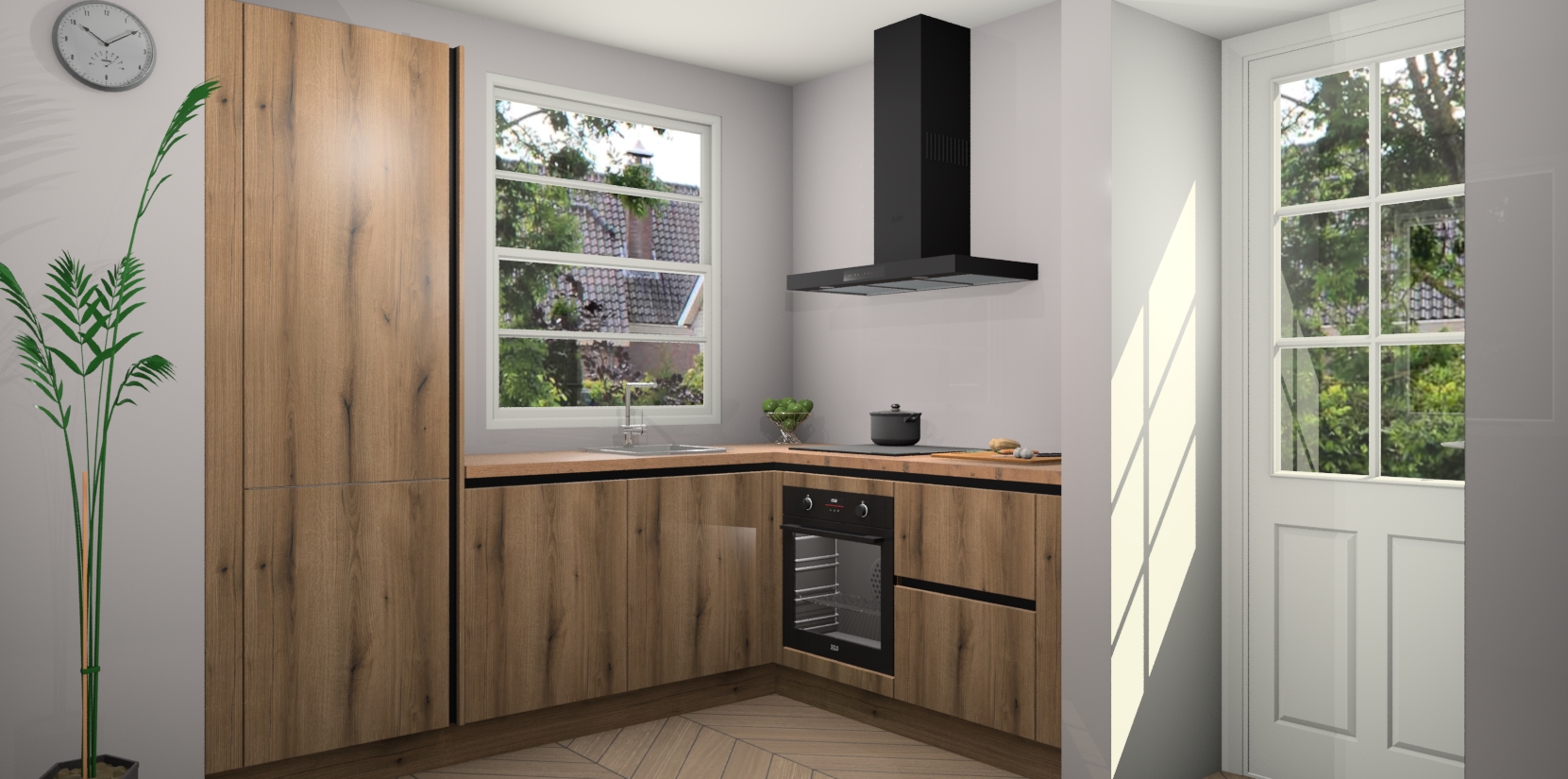 Wilt u een echte aanwinst voor uw keuken, maar bent u op zoek naar iets specialers dan de standaardkeukens? Kies dan voor de Goud Eiken greeploze keuken Harbin! Dit prachtige hoekkeukenontwerp geeft u alle ruimte om optimaal te genieten van heerlijk koken. Het uitmuntende afwerkingsniveau, de fraaie houtstructuur en de sfeervolle zwarte grepen maken van de Goud Eiken greeploze keuken Harbin de perfecte keuze voor zowel enthousiaste thuiskoks als design-minded interieurliefhebbers.