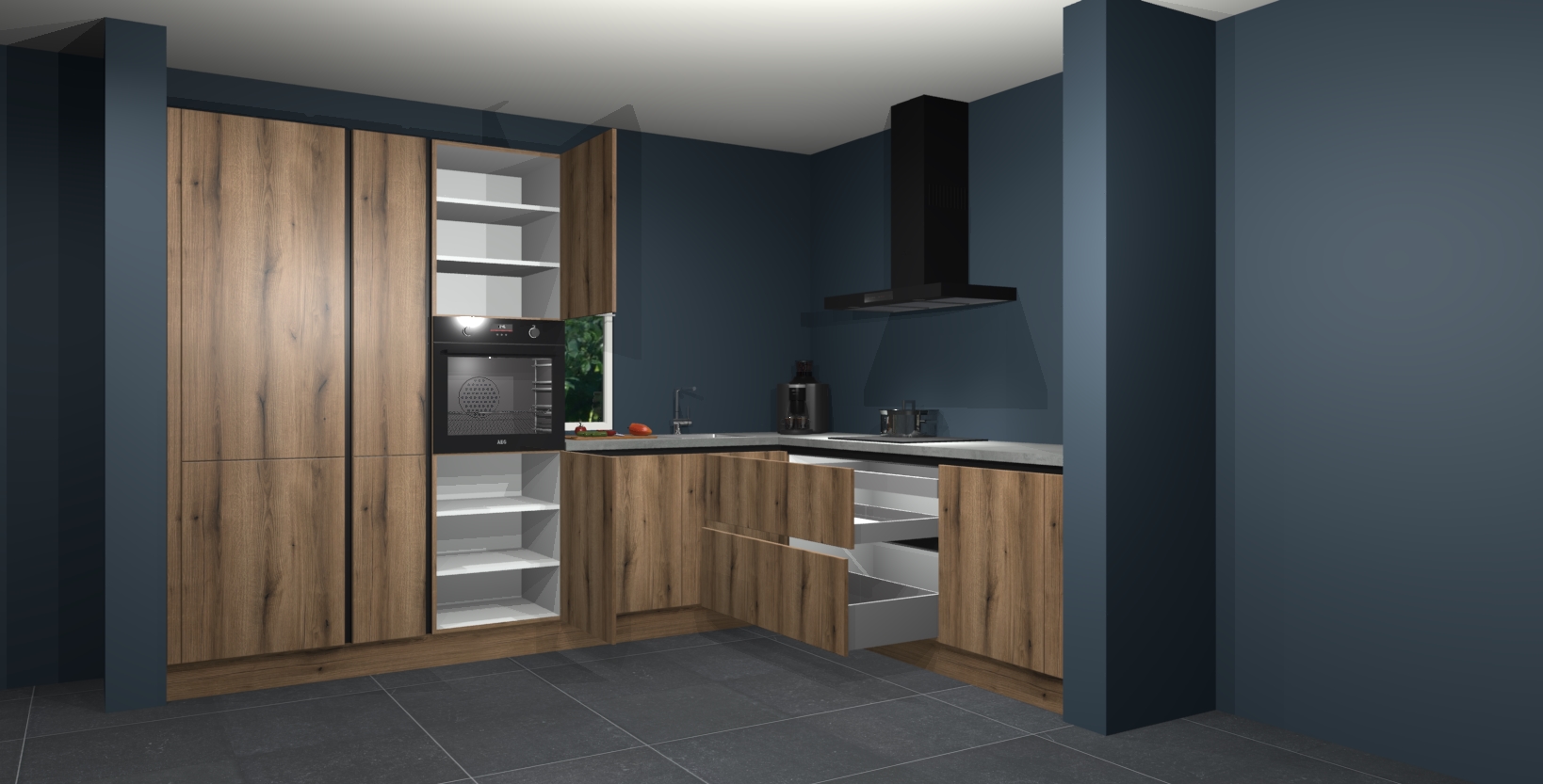 Met een modern, tijdloos design en ruime opslagruimte, zult u zich in no-time thuis voelen in uw nieuwe keuken. Uw leven wordt eenvoudiger met de soft-close deuren die voor het ultieme stille comfort zorgen - geen geluid dat u stoort terwijl u kookt. Ook is de keuken voorzien van 5 ingebouwde apparaten: een oven, inductie kookplaat, afzuigkap, vaatwasser en koelkast. Deze kunnen gemakkelijk na bestelling worden bijgewerkt naar AEG - waardoor uw luxe ervaring compleet is.