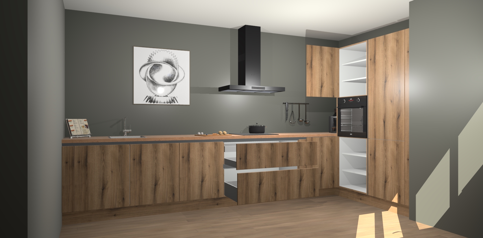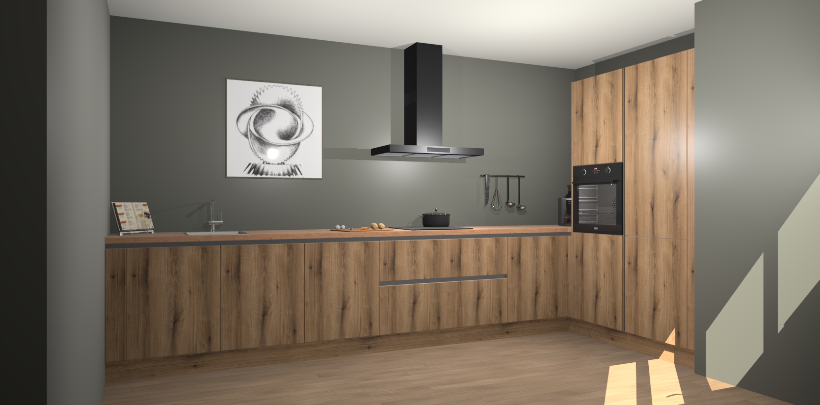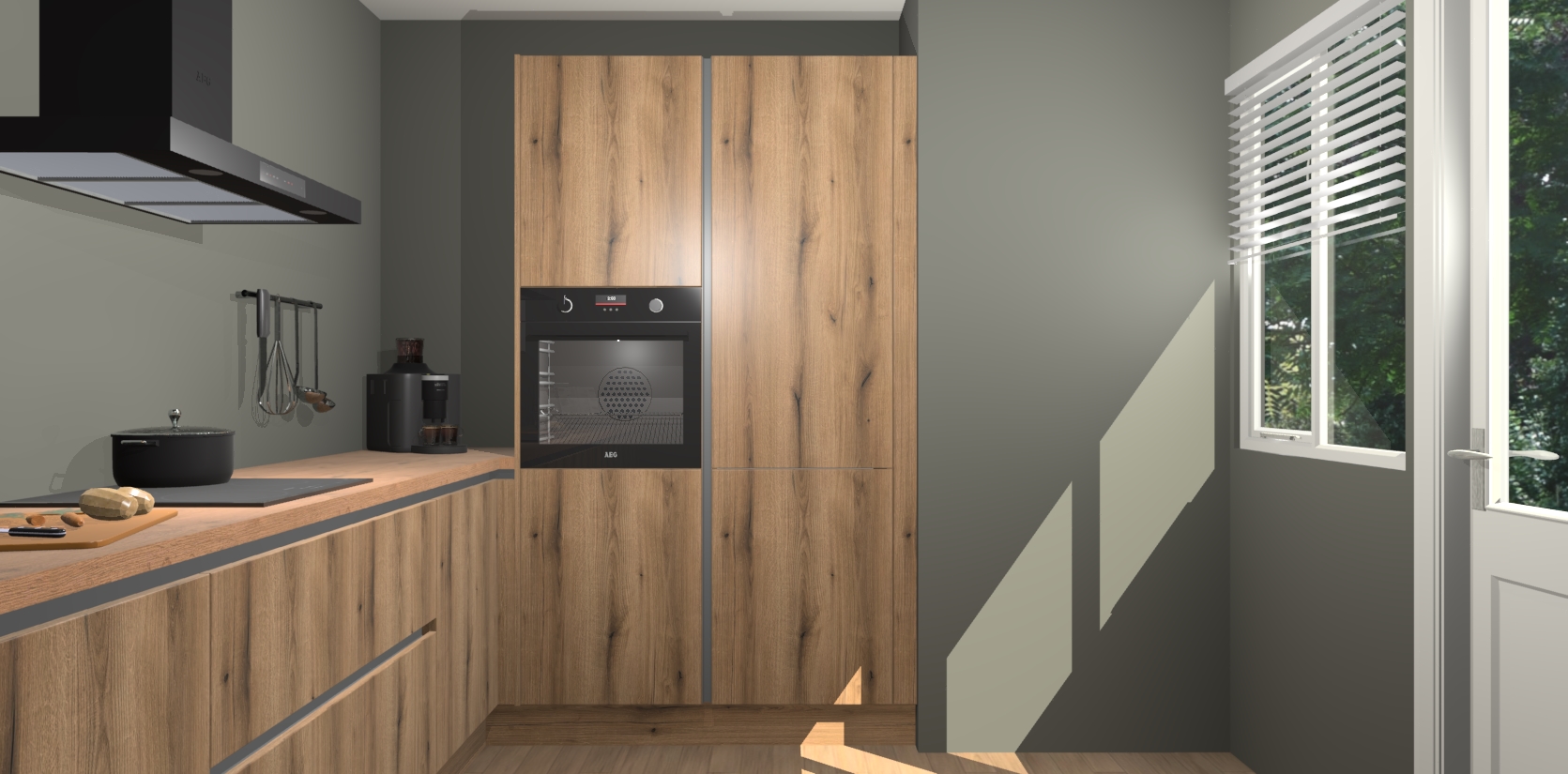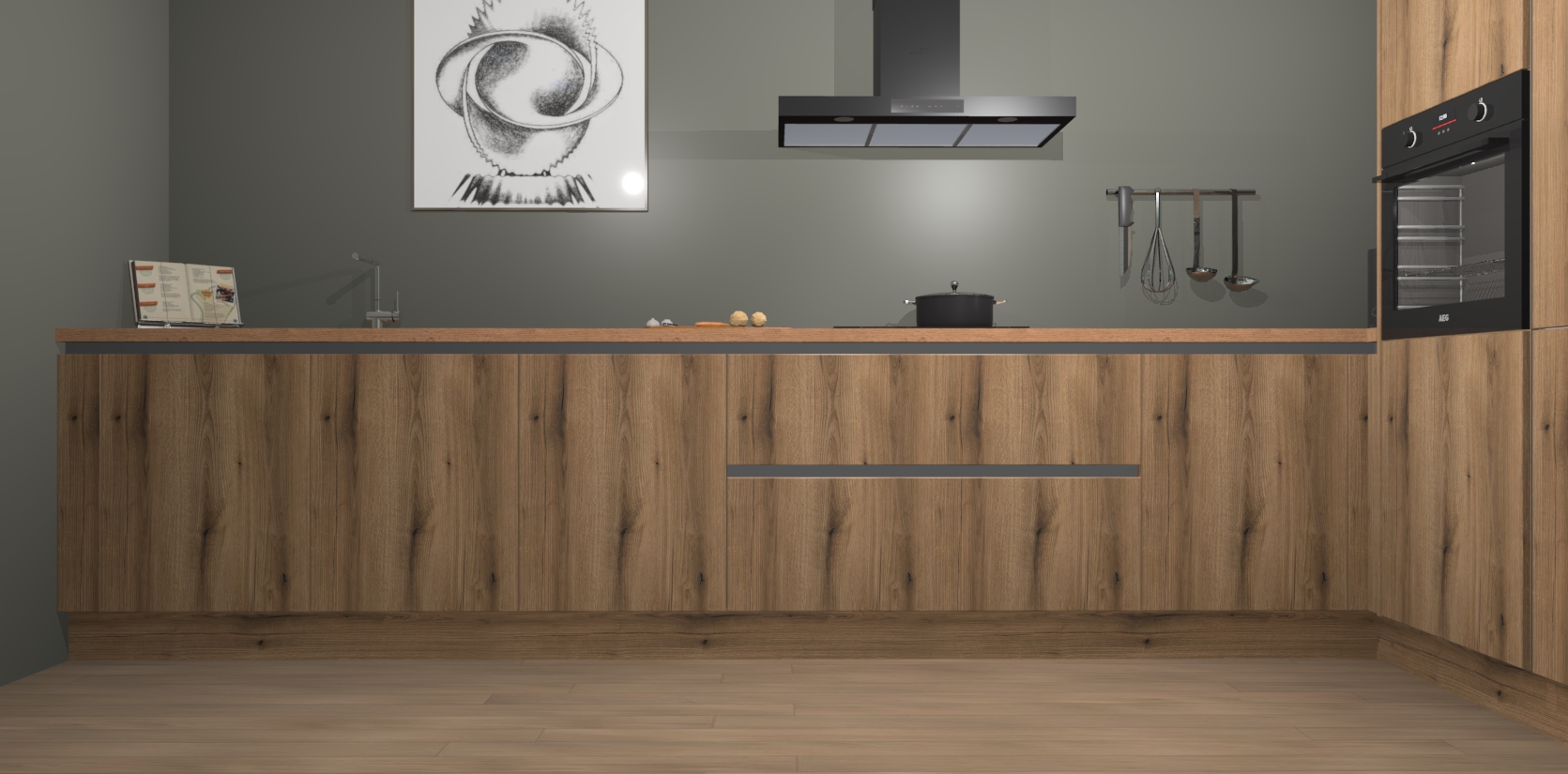 Welkom bij de Goud Eiken greeploze keuken Khao Lak. Deze prachtige keuken zal de komende jaren het middelpunt van de belangstelling in uw huis zijn. Uitgerust met vijf inbouwapparaten komt u nooit kookgereedschap tekort. Bovendien geeft de warme houtlook elke ruimte een uitnodigende en tijdloze uitstraling.